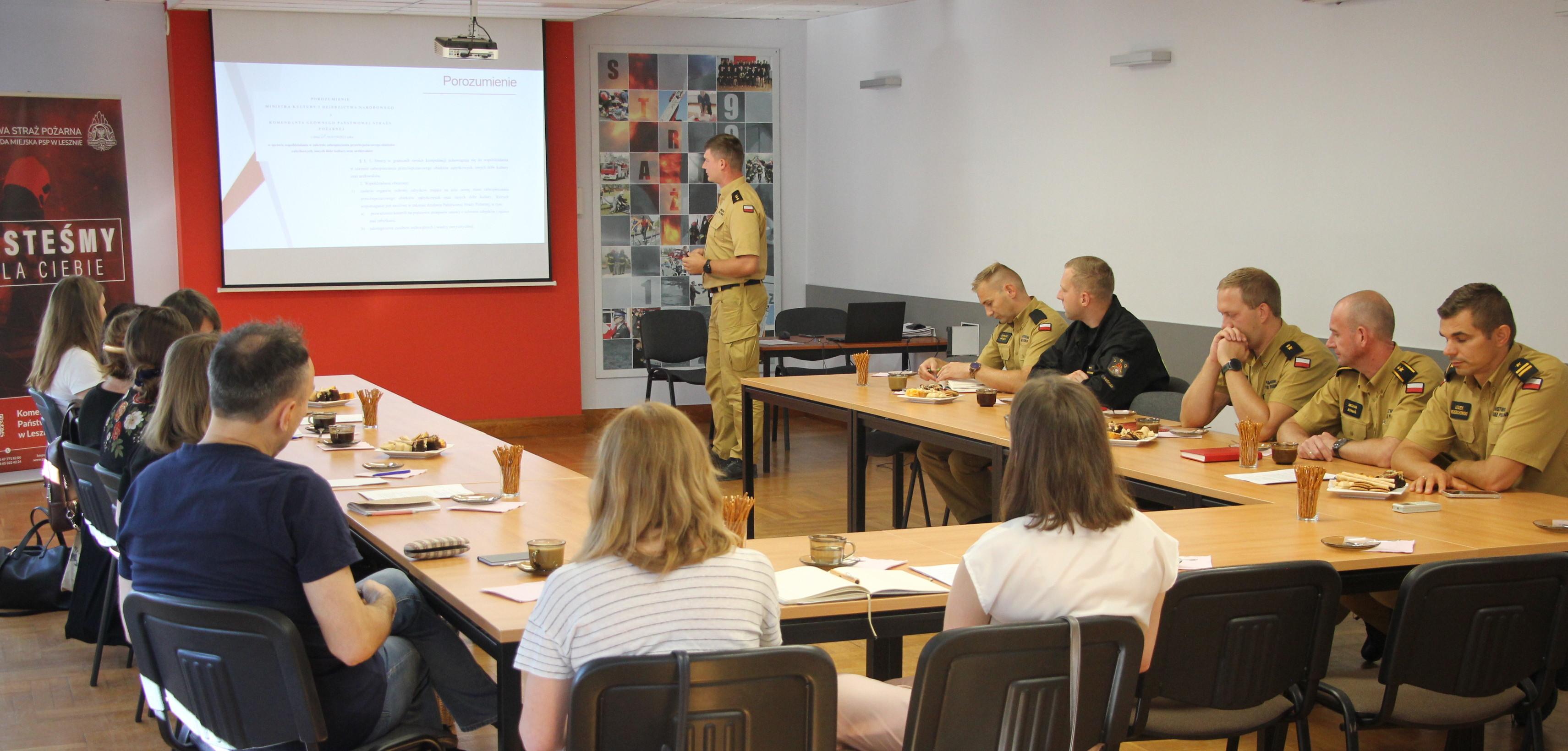Dnia 4 września 2024 roku w siedzibie Komendy Miejskiej Państwowej Straży Pożarnej w Lesznie zorganizowano spotkanie w sprawie ochrony przeciwpożarowej zabytków.
