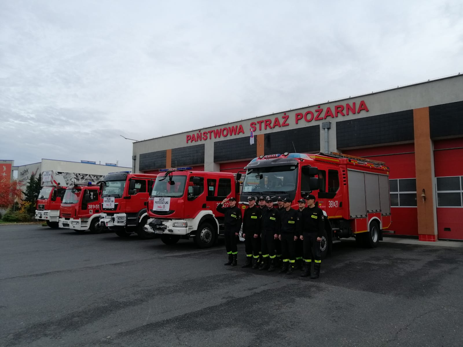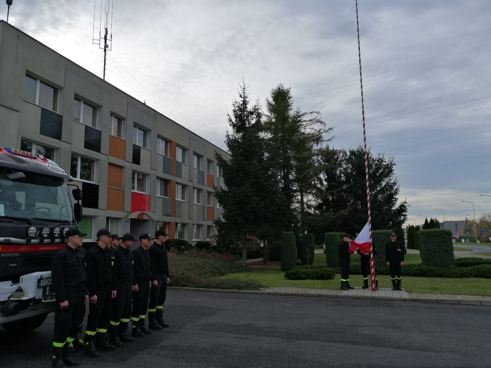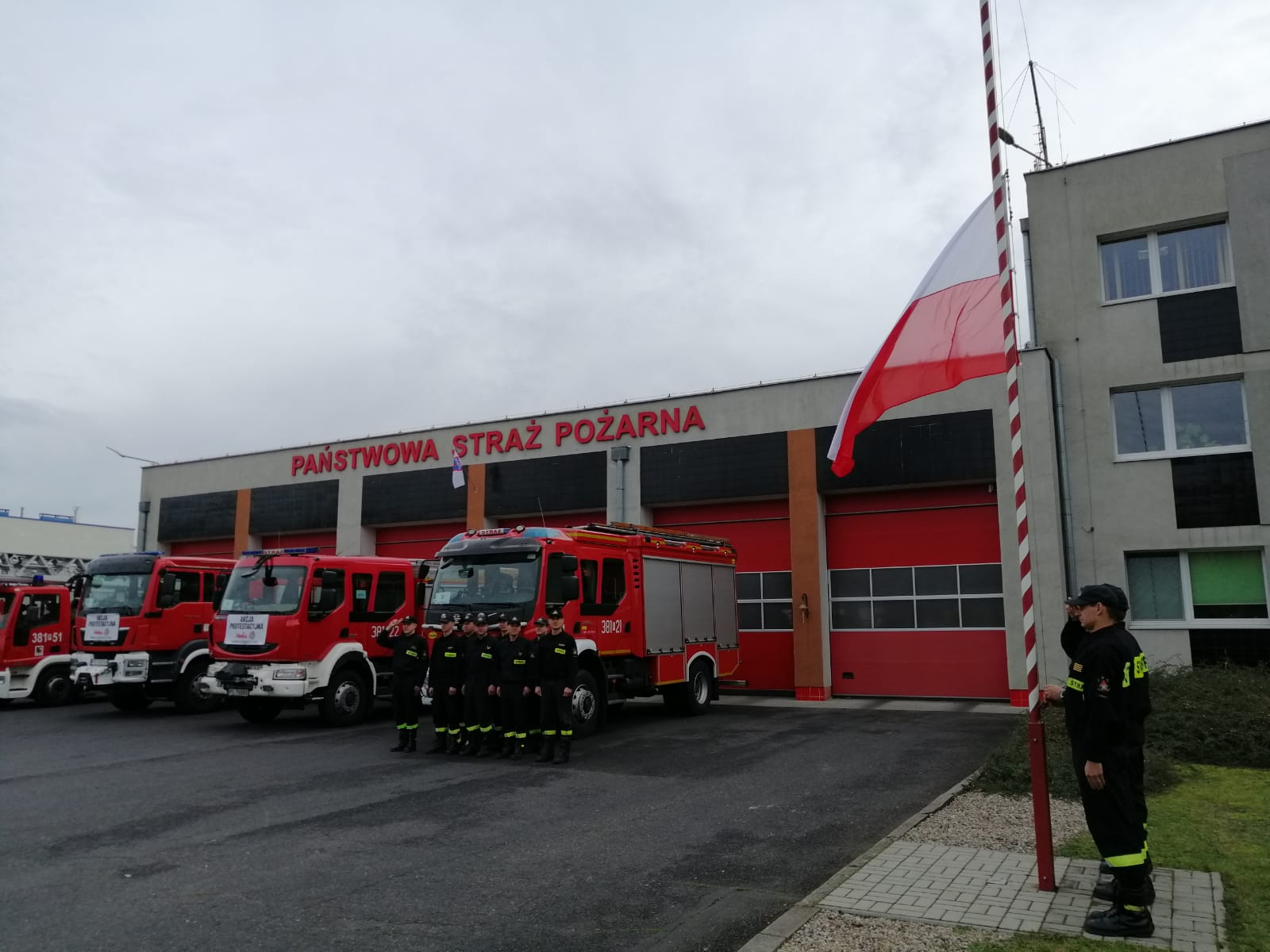 Funkcjonariusze Komendy Miejskiej Państwowej Straży Pożarnej w Lesznie również zadbali o to, aby w sposób uroczysty kultywować akcję „Niepodległa do Hymnu”, która została zapoczątkowana w 2018 r. w stulecie odzyskania niepodległości przez Polskę..