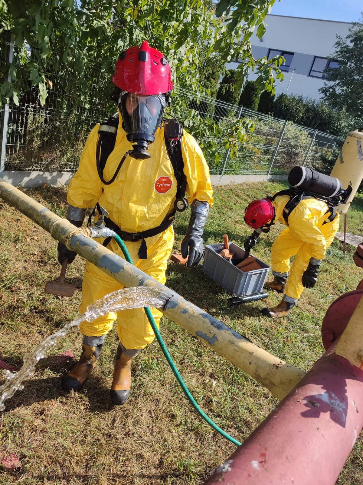 W ostatnim dniu szkolenia przeprowadzono ćwiczenie praktyczne z ewakuacji osoby poszkodowanej z pomieszczenia, w którym zasymulowano wyciek substancji niebezpiecznej. Strażacy ćwiczyli techniki zabezpieczania wycieków, wyznaczania strefy niebezpiecznej, przeprowadzania dekontaminacji ratowników, kontrolę pracy w aparatach ochrony układu oddechowego, techniki prawidłowego zabezpieczania się w środki ochrony indywidualnej oraz odpowiedniego rozbierania