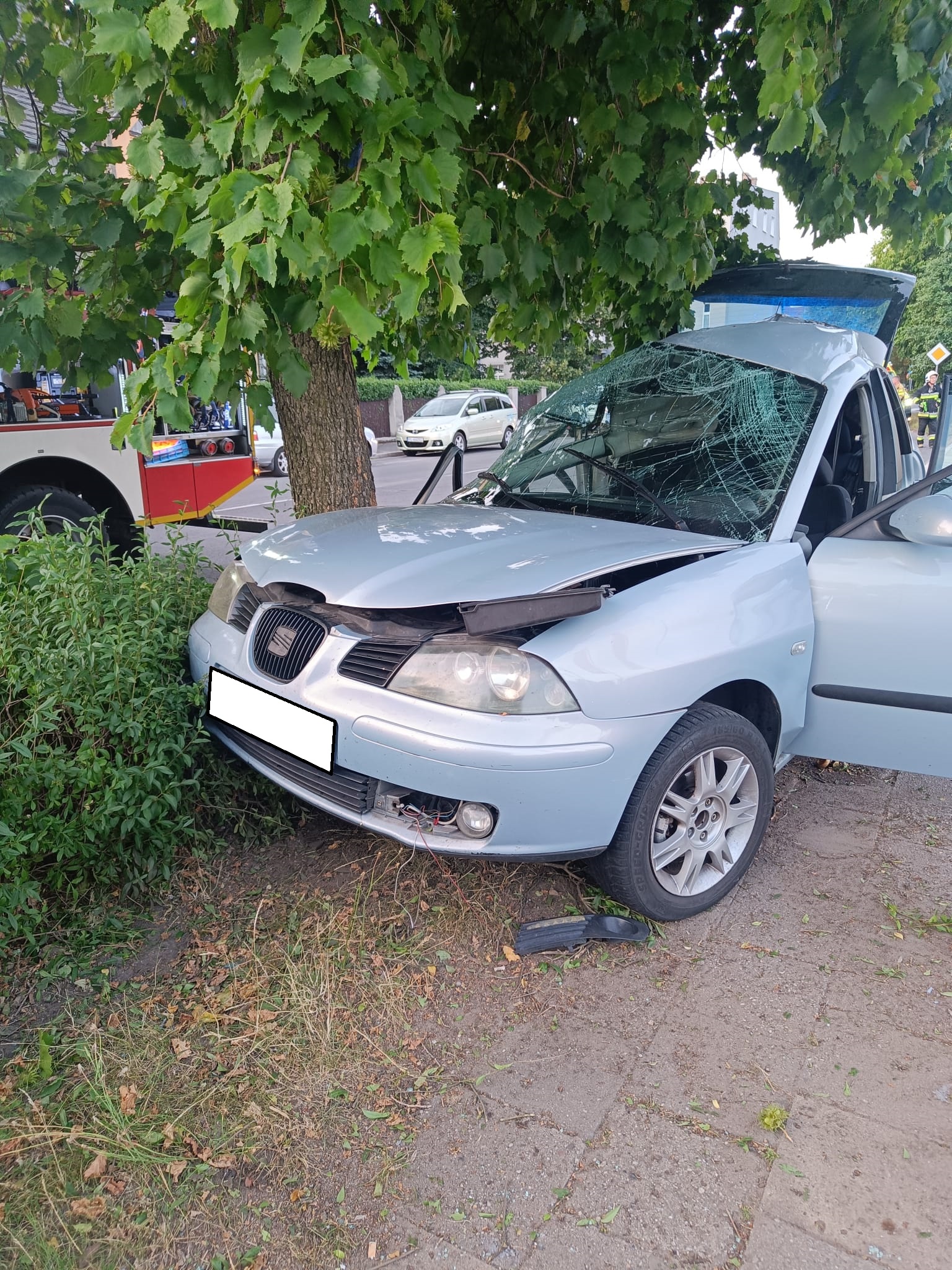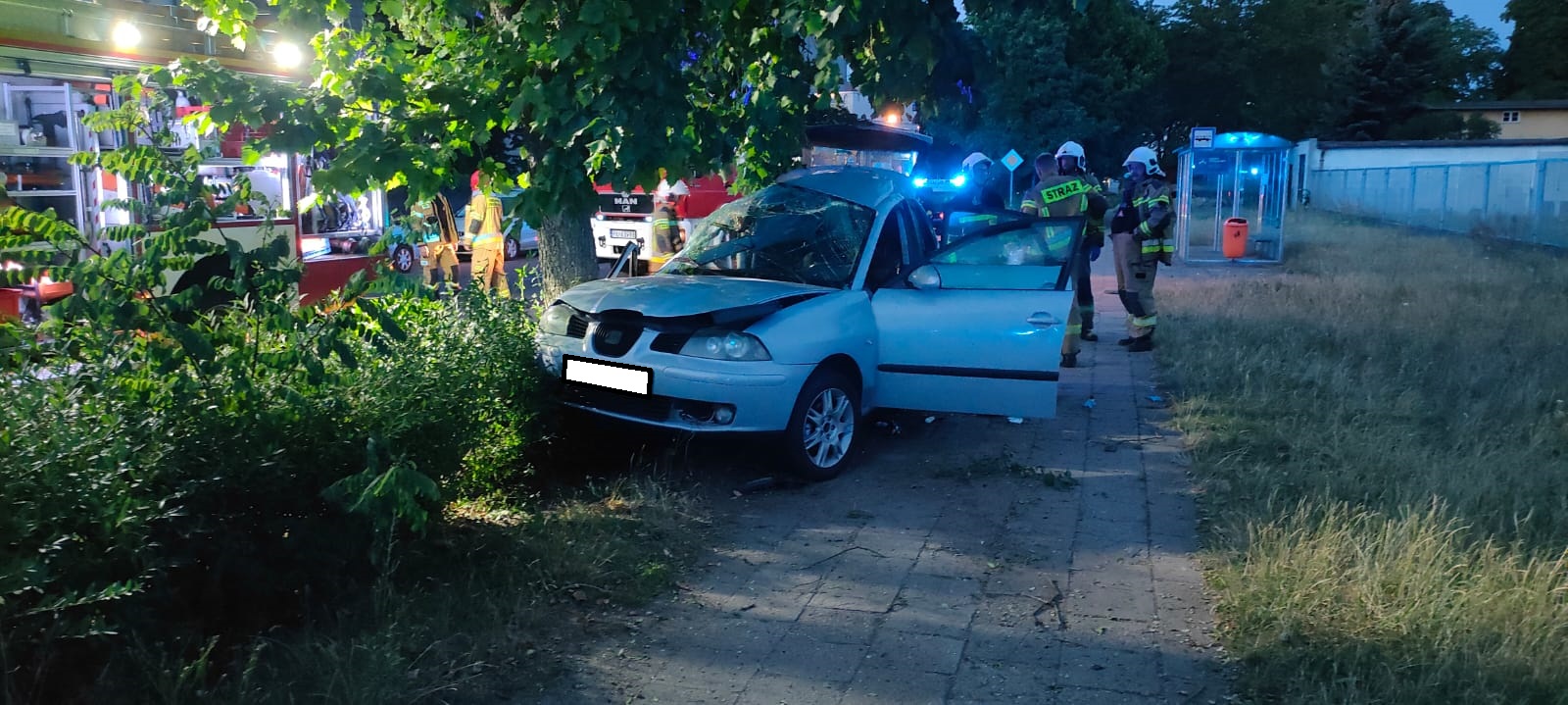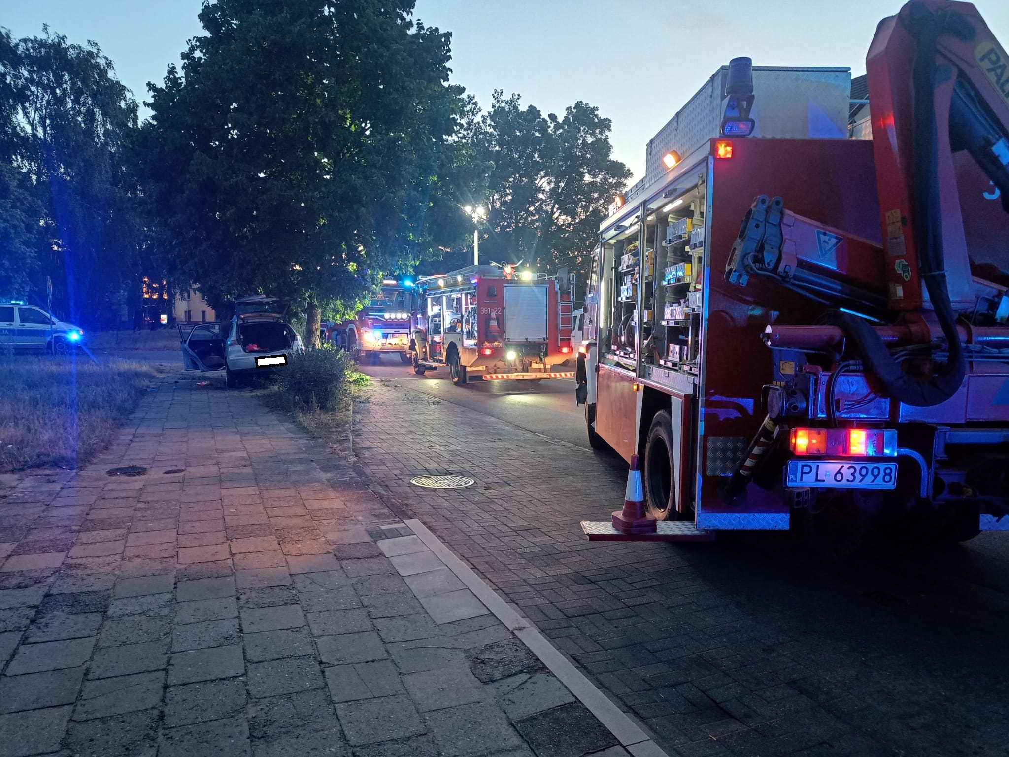 Natychmiast do zdarzenia zadysponowano dwa zastępy z Jednostki Ratowniczo-Gaśniczej Leszno oraz jeden zastęp z Ochotniczej Straży Pożarnej Leszno-Gronowo. W chwili przybycia pierwszego zastępu na miejsce zdarzenia samochód osobowy marki Seat Ibiza, po uderzeniu prawym bokiem w drzewo, znajdował się na kołach poza jezdnią. Wewnątrz samochodu znajdowało się dwóch nieprzytomnych mężczyzn.
