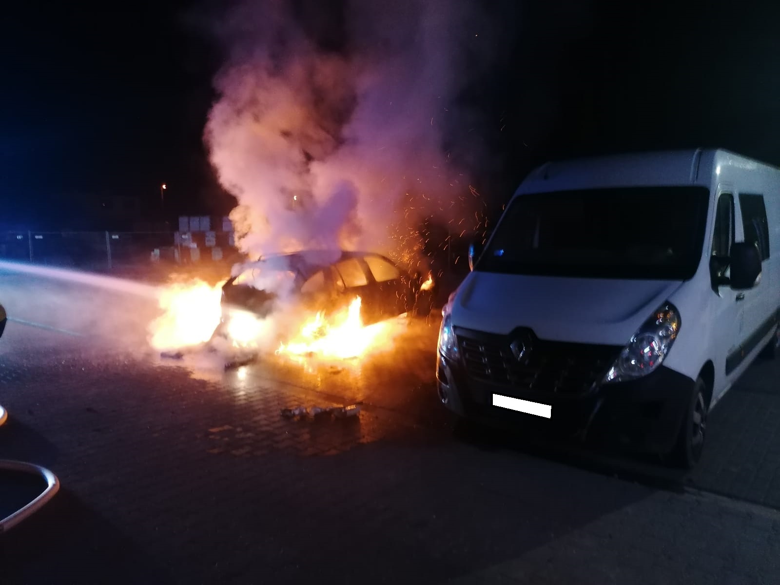 Tego samego dnia o godzinie 01:51 do Stanowiska Kierowania Komendanta Miejskiego PSP w Lesznie wpłynęło zgłoszenie o pożarze samochodu osobowe marki Renault Megane zaparkowanego przy ul. Józefa Chociszewskiego w Lesznie. Na miejsce zostały skierowane dwa zastępy z Jednostki Ratowniczo-Gaśniczej w Lesznie. Po dojeździe na miejsce zdarzenia pierwszego zastępu samochód osobowy był w całości objęty pożarem. Działania polegały na zabezpieczeniu miejsca zdarzenia, oświetleniu terenu działań i podaniu dwóch prądów piany gaśniczej na palący się samochód oraz na samochód, marki Renault Master, zaparkowany obok. W wyniku pożaru całkowitemu spaleniu uległ Renault Megane oraz uszkodzony został Renault Master. Straty oszacowano na 20 tys. zł.