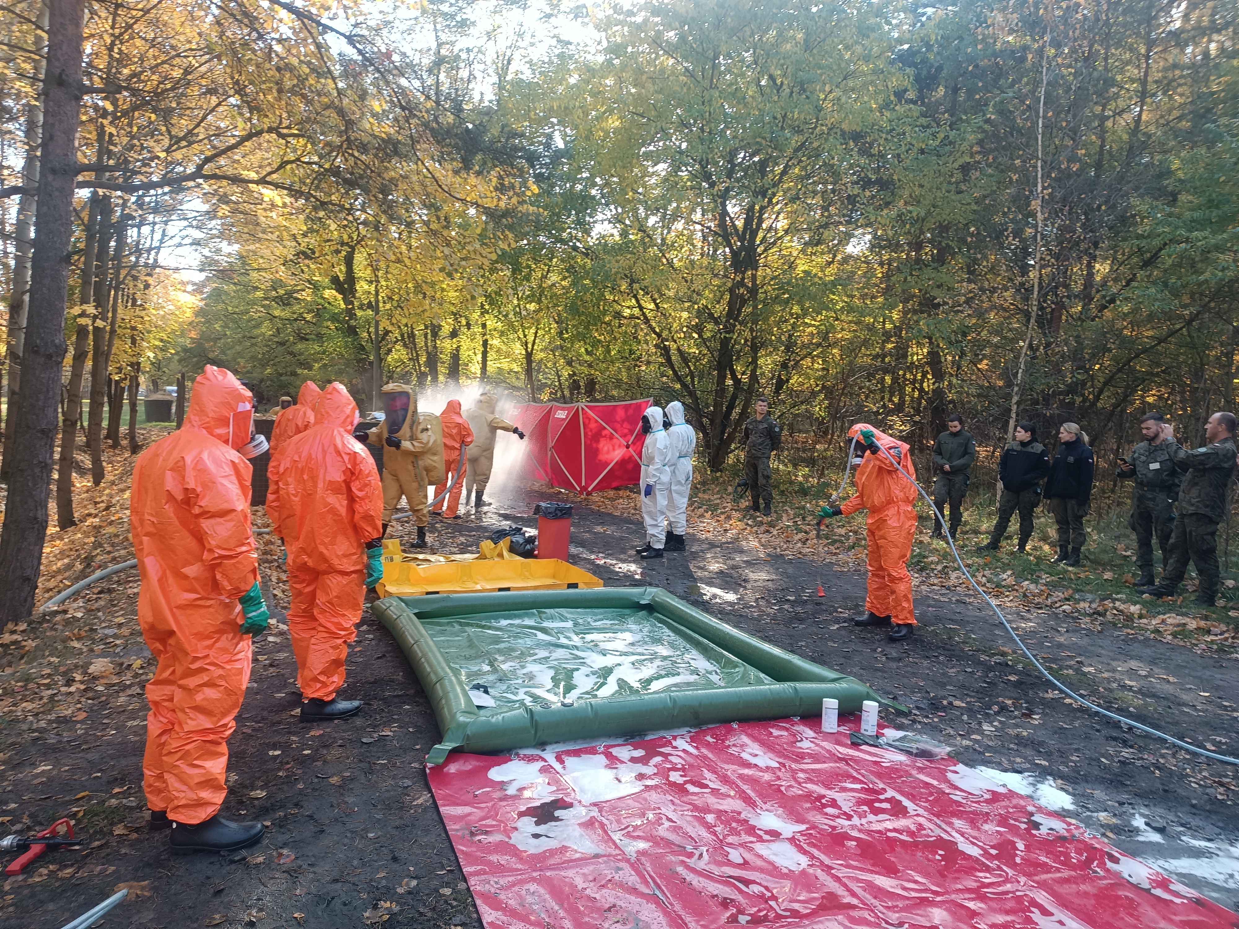 24 października 2024 r. Specjalistyczna Grupa Ratownictwa Chemiczno-Ekologicznego "Łódź" wzięła udział w zintegrowanych ćwiczeniach praktycznych z zakresu ratownictwa chemicznego na terenie poligonu Wojskowego Centrum Kształcenia Medycznego w Jeżewie. Scenariusz ćwiczeń stanowiły epizody, których przewodnim motywem było udzielanie pomocy medycznej ofiarom skażeń czynnikami CBRN (zagrożenia chemiczne, biologiczne, radiacyjne i nuklearne). Ćwiczenia, które na obiektach poligonowych prowadzili instruktorzy z WCKM oraz dowódca SGRChem-Eko "Łódź" miały za zadanie doskonalenie taktyki postępowania i współdziałanie w zdarzeniach o charakterze chemicznym i promieniotwórczym, a w szczególności ewakuację osób poszkodowanych w skażeniach chemicznych, udzielanie pierwszej pomocy na terenie skażonym oraz dekontaminację poszkodowanych. Duży nacisk w ćwiczeniu położono na szybką i sprawną ewakuację skażonych ze strefy zagrożenia oraz na przeprowadzenie pilnej dekontaminacji, która minimalizuje ryzyko oddziaływania substancji na organizm. W kilku zaplanowanych epizodach wzięło udział 18 strażaków PSP (SGRChem-Eko Łódź, KP PSP Zgierz, KW PSP), żołnierze wojsk chemicznych z Polski oraz z Czech oraz zespół dekontaminacji masowej z 6 batalionu chemicznych Sił Powietrznych w Śremie.