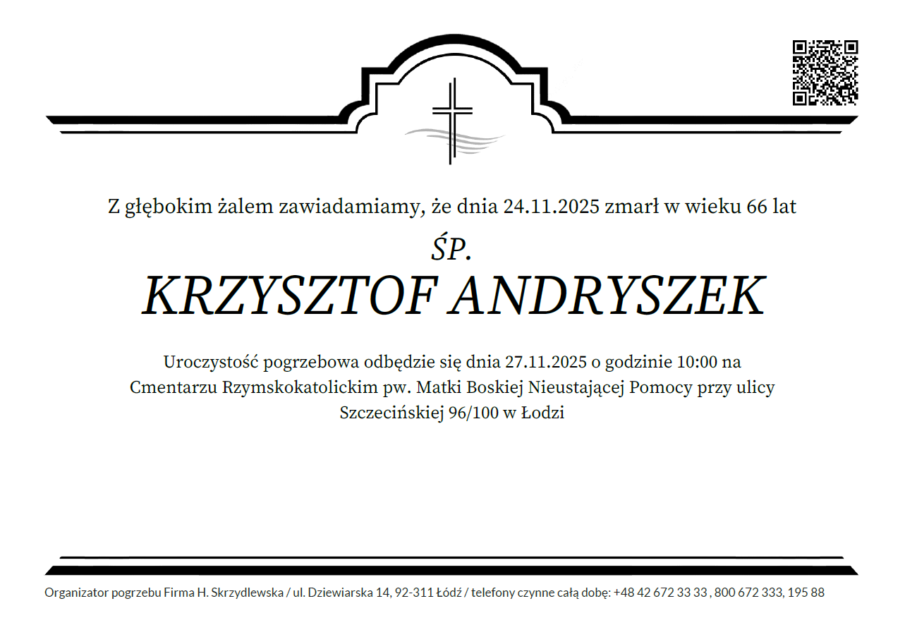 Ceremonia pogrzebowa odbędzie się na Cmentarzu Rzymskokatolickim pw. Matki Boskiej Nieustającej Pomocy przy ul. Szczecińskiej 96/100 w Łodzi w dniu 27.11.2025 r. o godz. 10:00.