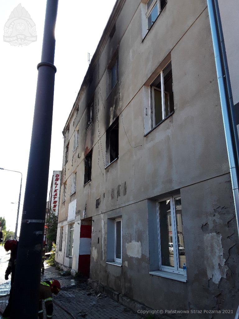 W sobotę (4 września) doszło do groźnago pożaru w budynku mieszkalnym przy ul. Łagiewnickiej 96. Pożar wybuchł w mieszkaniu na I piętrze kamienicy. W chwili przyjazdu strażaków na miejsce zdarzenia ogień wydostawał się na zewnątrz jednego z pomieszczeń, a przebywający w nim lokator ratując się przed ogniem wyskoczył przez okno. Strażacy udzielili poszkodowanemu kwalifikowanej pierwszej pomocy, a następnie przekazali przybyłemu na miejsce zespołowi ratownictwa medycznego. Męzczyzna z rozległymi poparzeniami został przetransportowany do szpitala. Ponadto strażacy ewakuowali z sąsiednich mieszkań 3 osoby. Na miejscu pracowało 25 strażakow i 7 samochodów.