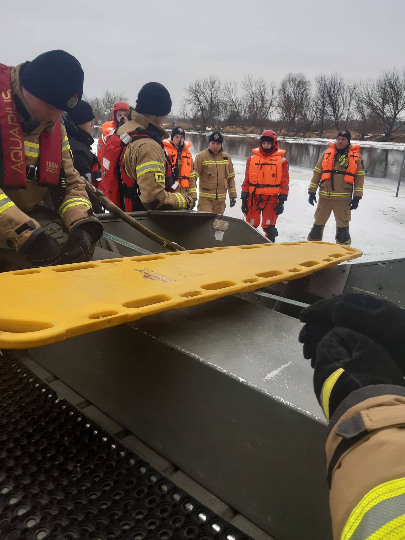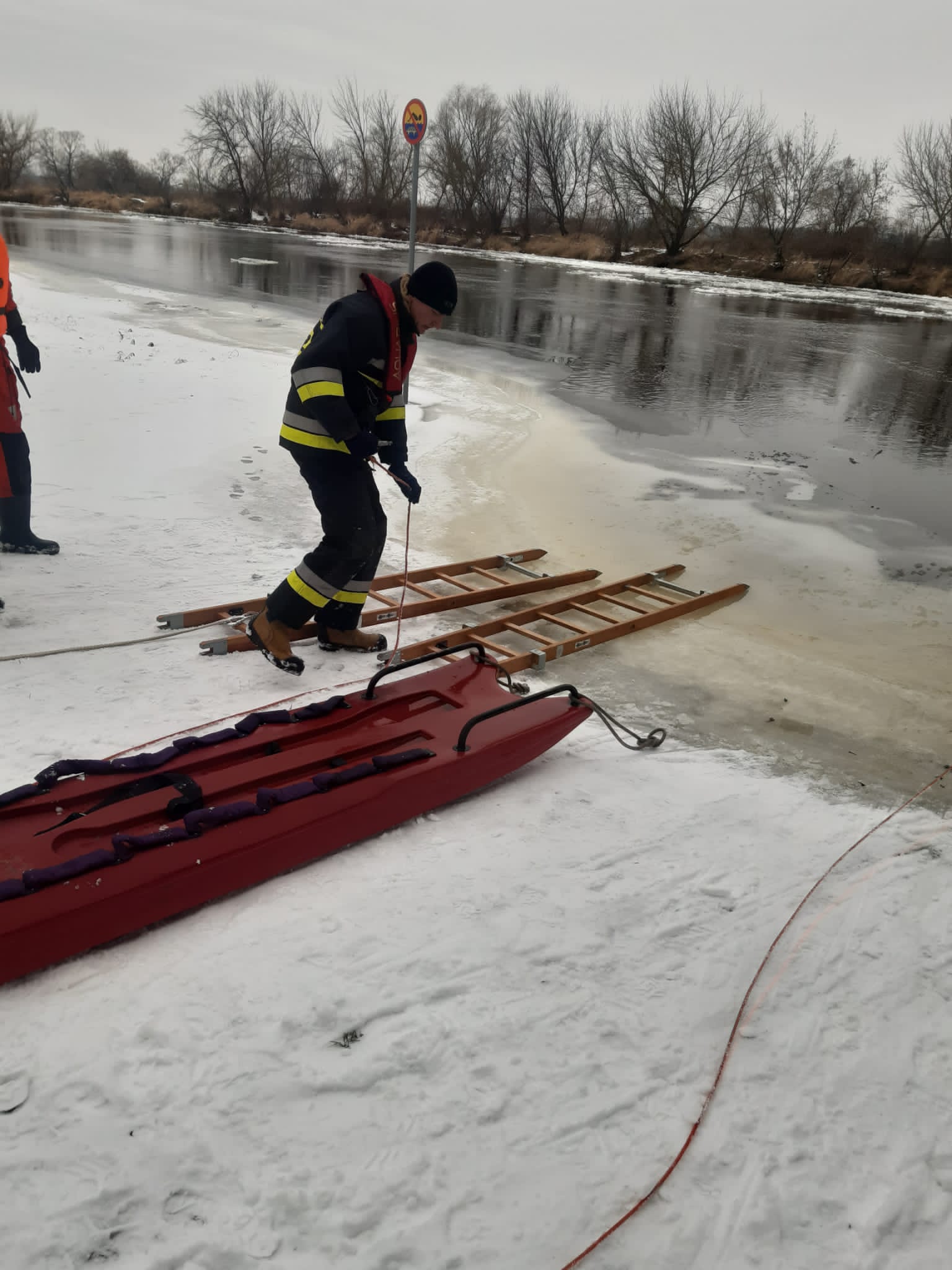 W styczniu 2022 roku na rzece Narew strażacy z jednostki ratowniczo – gaśniczej Komendy Miejskiej PSP w Łomży oraz druhowie z OSP KSRG, odbywają w ramach doskonalenia zawodowego zajęcia szkoleniowe z zakresu ratownictwa wodnego w warunkach zimowych.