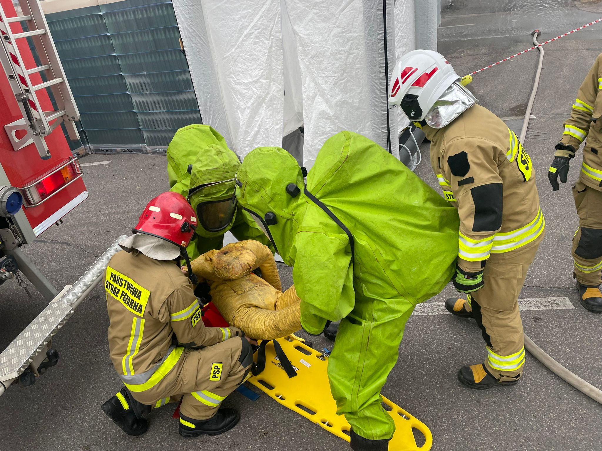 16 maja 2023 r. na terenie zakładu Van Pur S.A. w Łomży strażacy z jednostki ratowniczo-gaśniczej Komendy Miejskiej PSP w Łomży oraz druhowie OSP KSRG w Starych Kupiskach, Olszynach i Miastkowie uczestniczyli w ćwiczeniach doskonalących działania gaśnicze oraz ratownictwo chemiczne i ekologiczne w zakresie podstawowym.