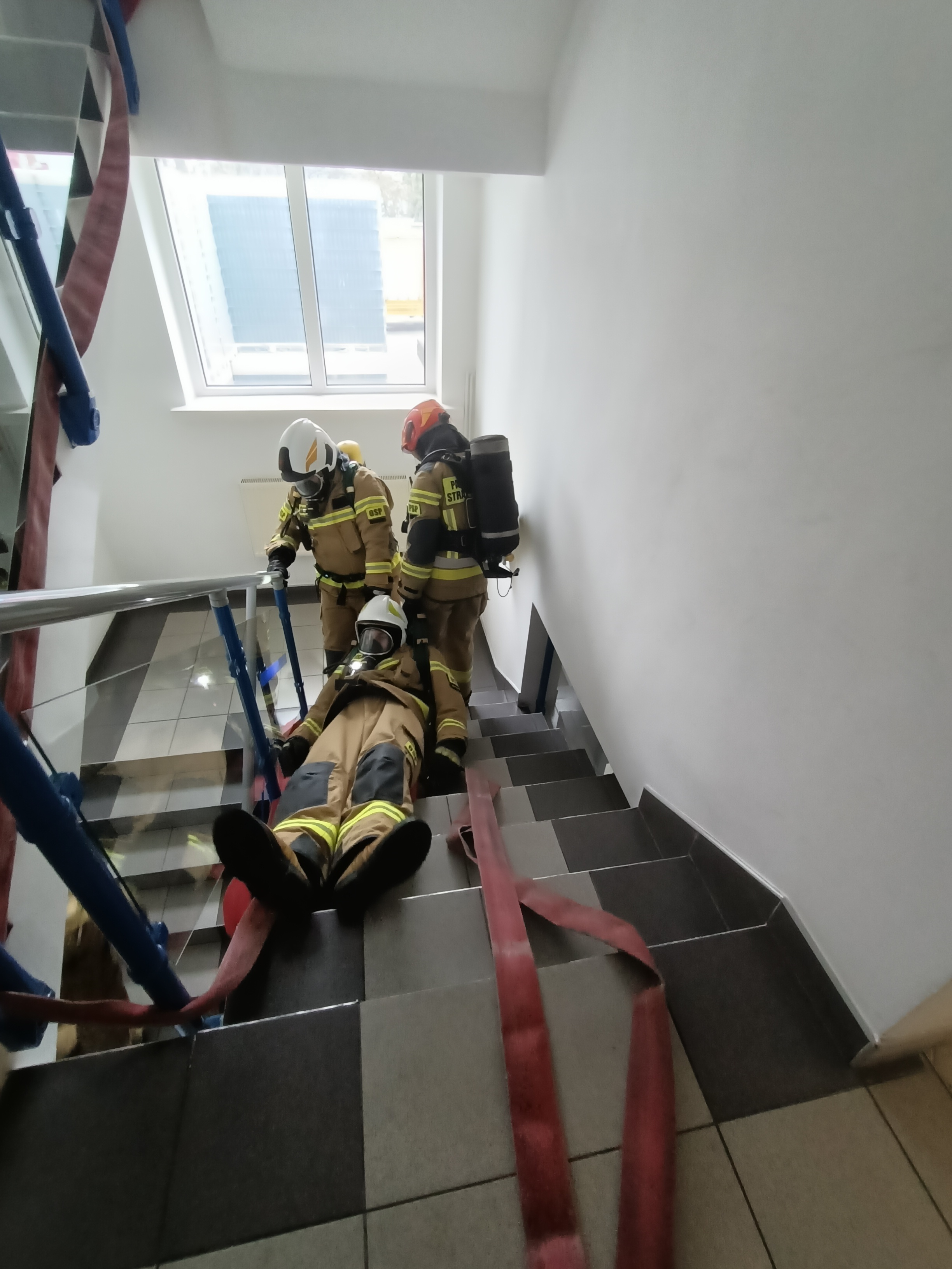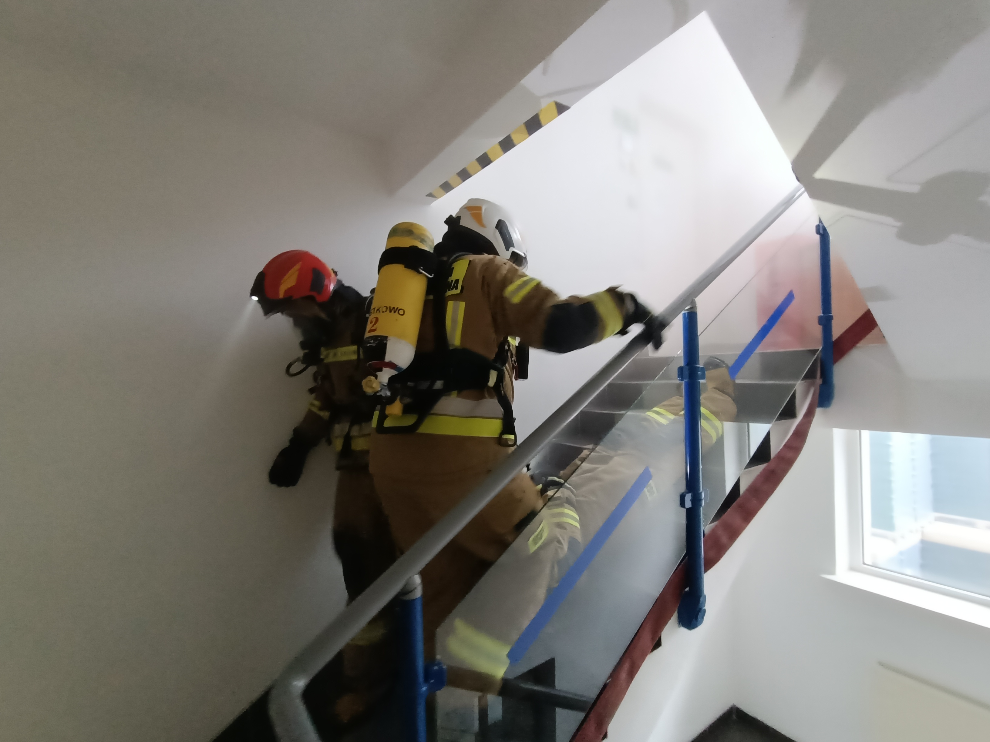 W pierwszym epizodzie ćwiczeń założono, że w budynku administracyjno-biurowym na drugim piętrze doszło do pożaru. W tym przypadku działania JOP polegały na zlokalizowaniu, dotarciu oraz próbie ugaszenia pożaru na klatce schodowej. Podczas działań gaśniczych, doszło do zasłabnięcia ratowników z roty. W związku z tym zabezpieczający strażacy, musieli przeprowadzić ewakuację poszkodowanych ratowników oraz udzielić im kwalifikowanej pierwszej pomocy. Sprawdzono w ten sposób reakcję na nieprzewidzianą sytuację oraz szybkość podjętych działań.