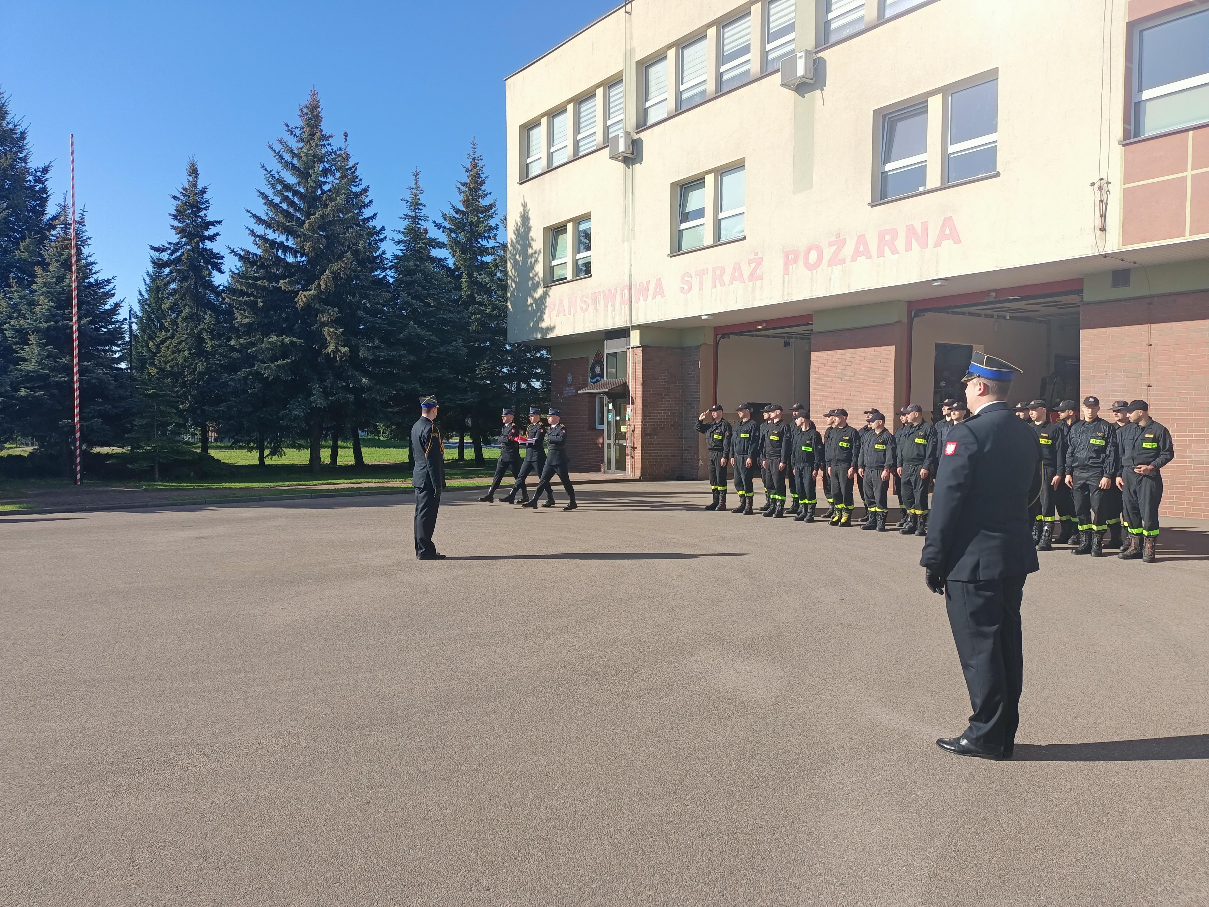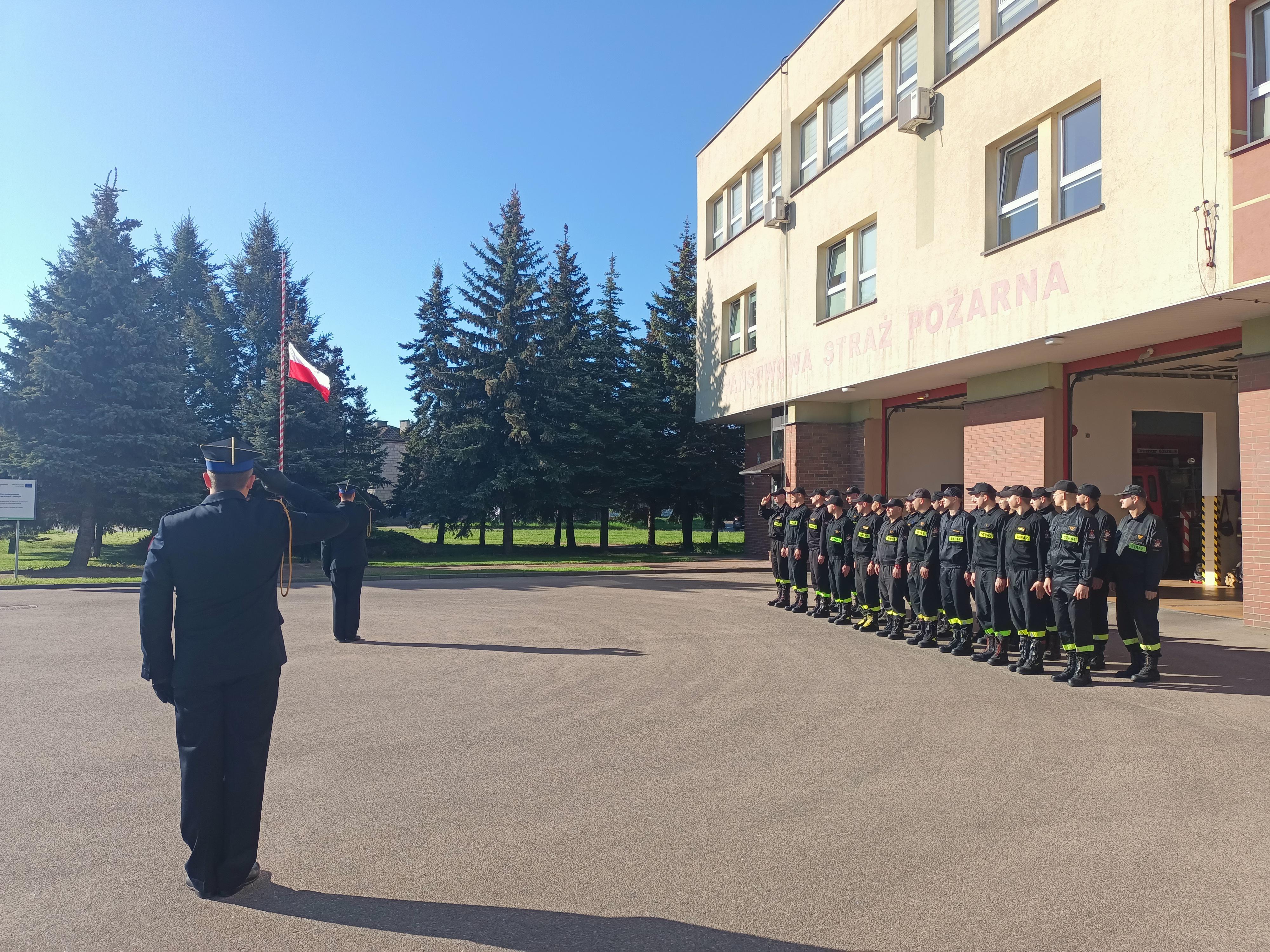 Zbiórka rozpoczęła się złożeniem meldunku st. kpt. Pawłowi Leszczyńskiemu p.o. Komendantowi Miejskiemu Państwowej Straży Pożarnej w Łomży przez st. kpt. Radosława Koszykowskiego Zastępcę Dowódcy Jednostki Ratowniczo-Gaśniczej w Łomży. Następnie podczas hymnu państwowego uroczyście dokonano podniesienia flagi państwowej na maszt.