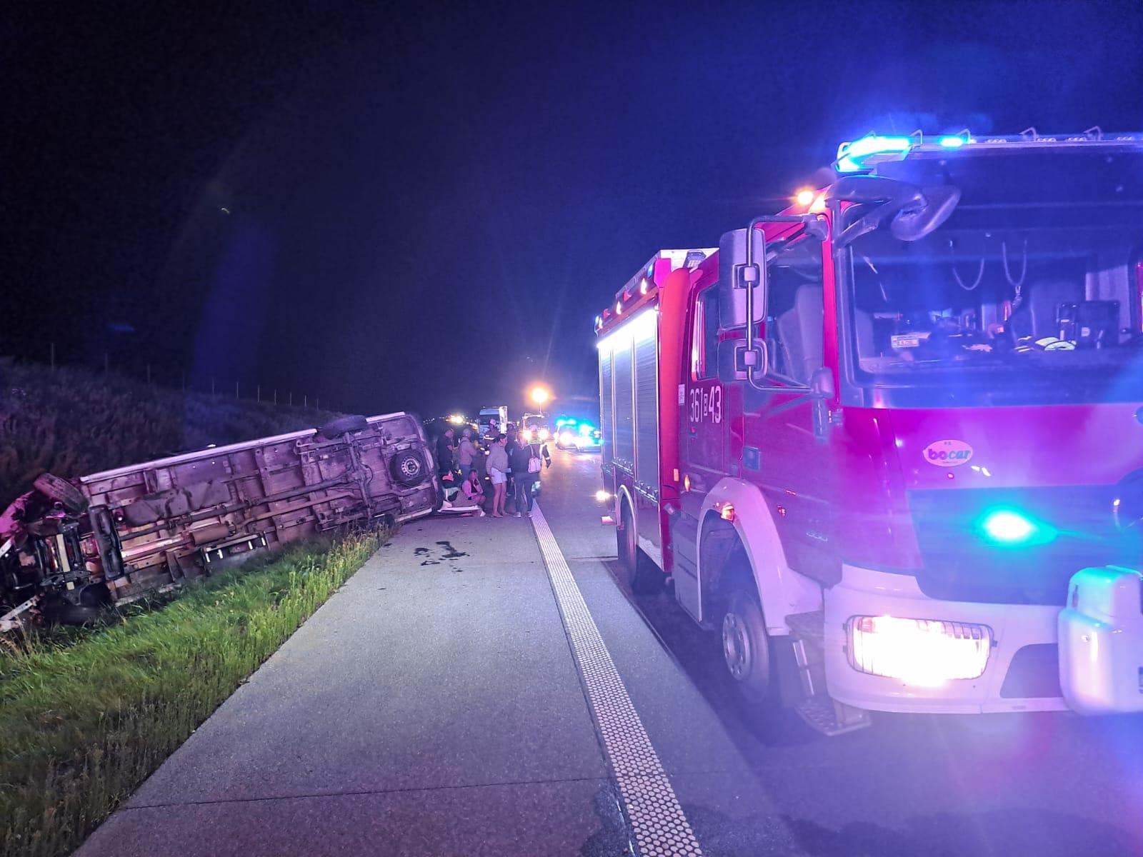 Po dojeździe na miejsce zdarzenia zastępów jednostek straży pożarnej stwierdzono, że doszło do zderzenia samochodu osobowego z busem, którym podróżowało 12 osób. Łącznie w zdarzeniu brało udział 13 osób. Pojazdy znajdowały się poza drogą w przydrożnym rowie, a wszyscy uczestnicy samodzielnie opuścili pojazdy.