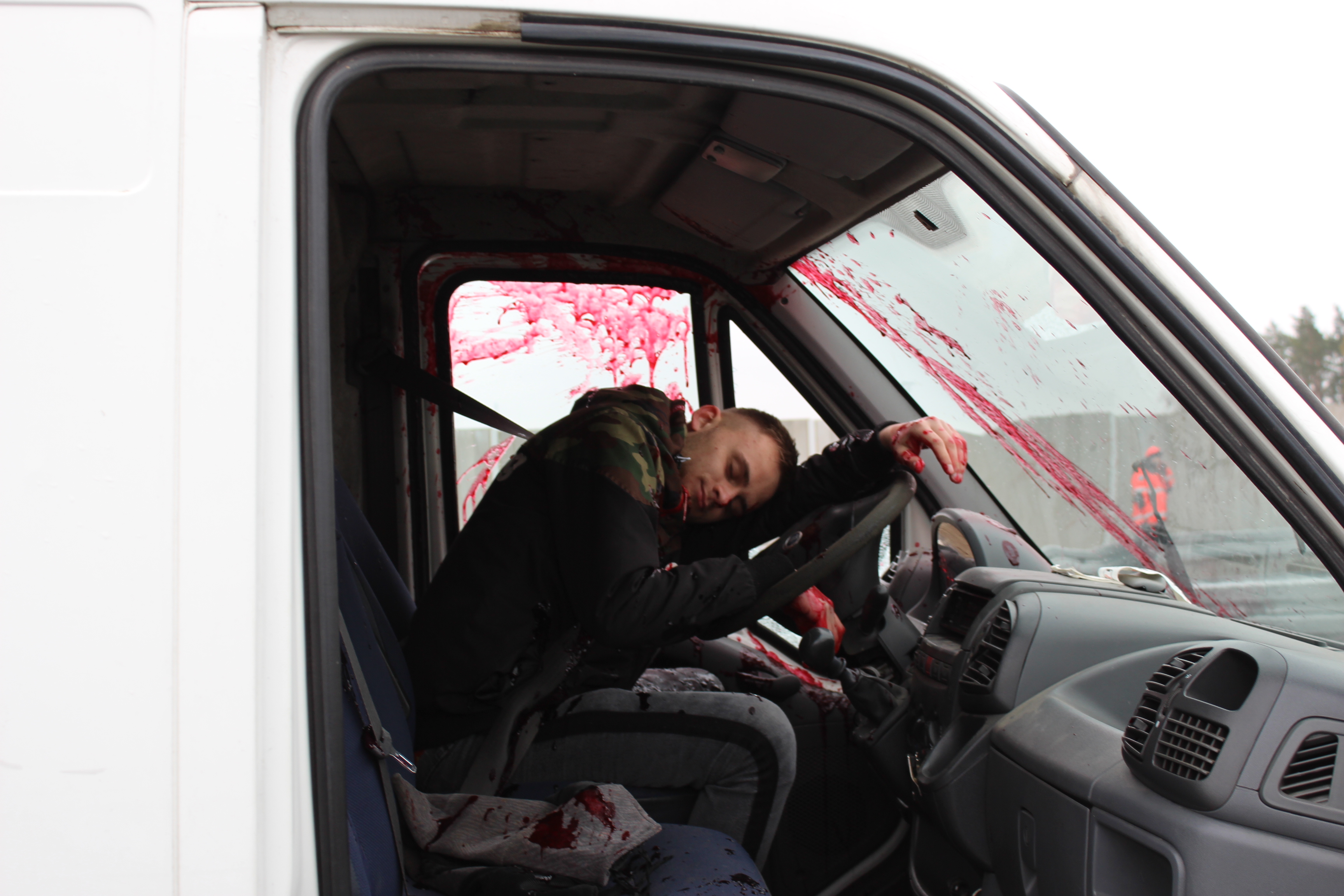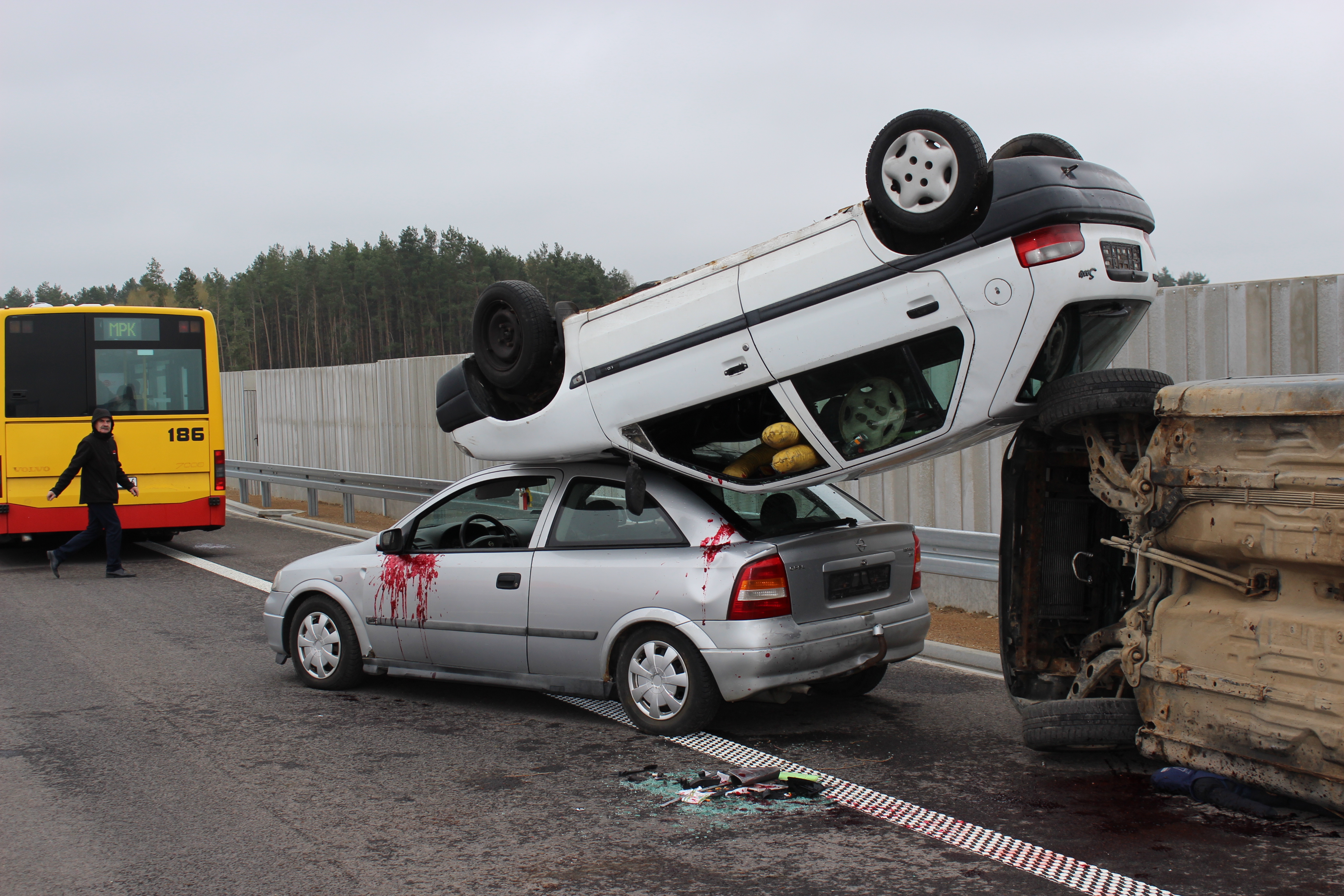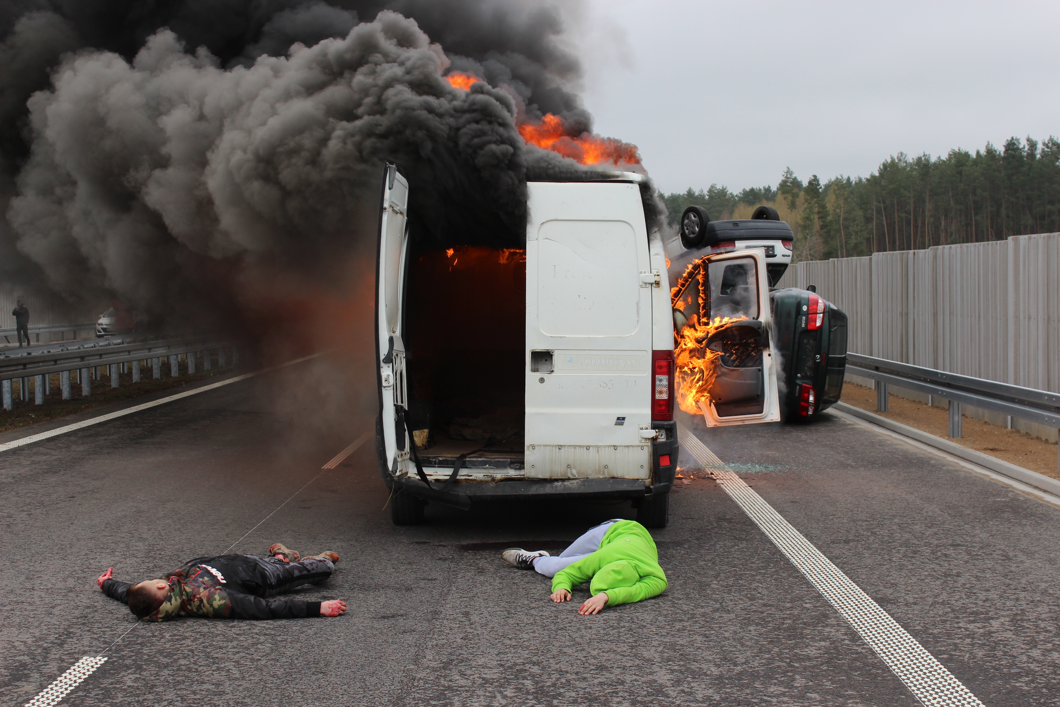 W następnej kolejności nadjeżdżające pojazdy w wyniku nadmiernej prędkości, najeżdżają na siebie i dochodzi do karambolu. Na przeciwległym pasie ruchu zatrzymuje się pojazd, którego kierowca próbuje przejść na drugą jezdnię chcąc udzielić pomocy uczestnikom wypadku.