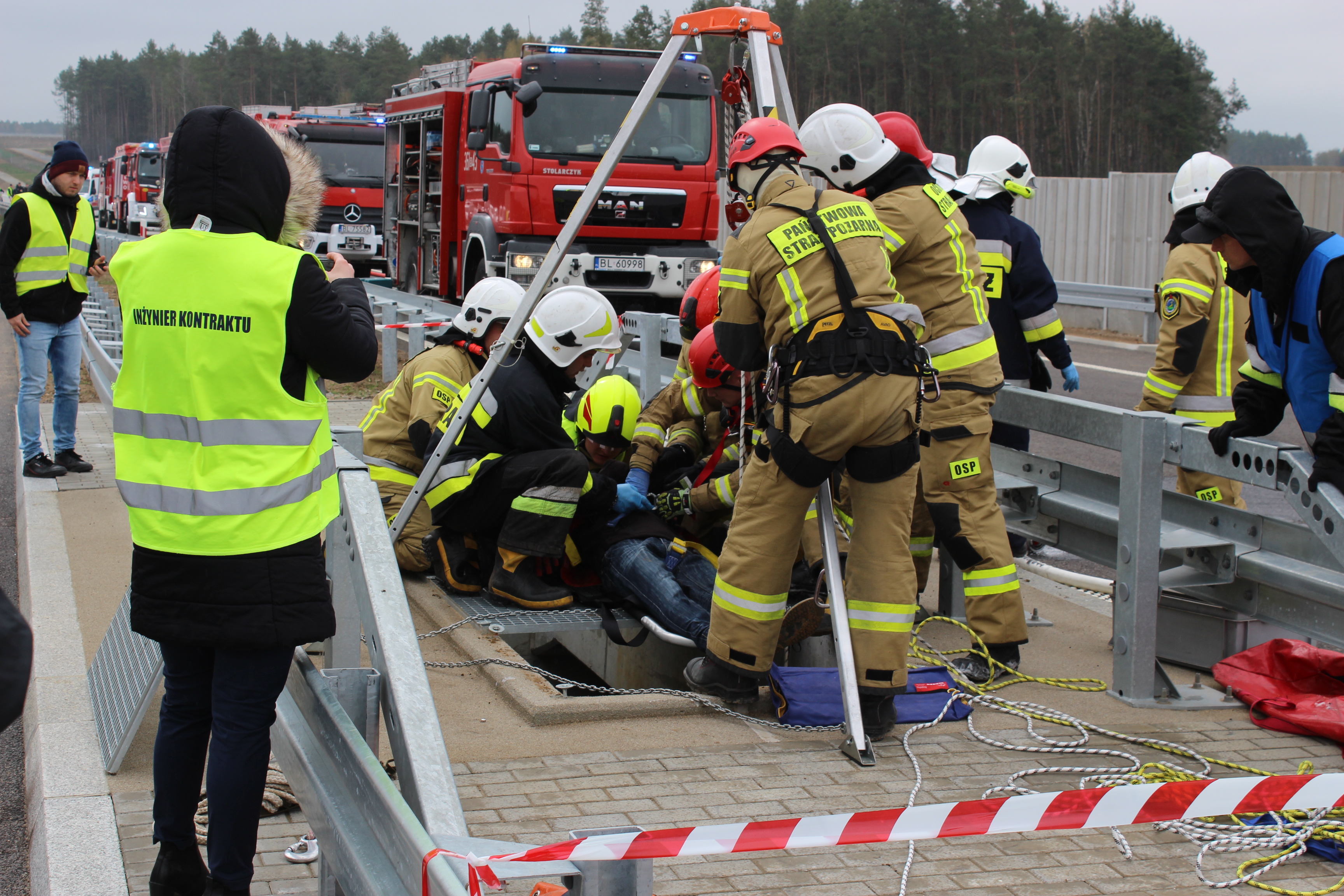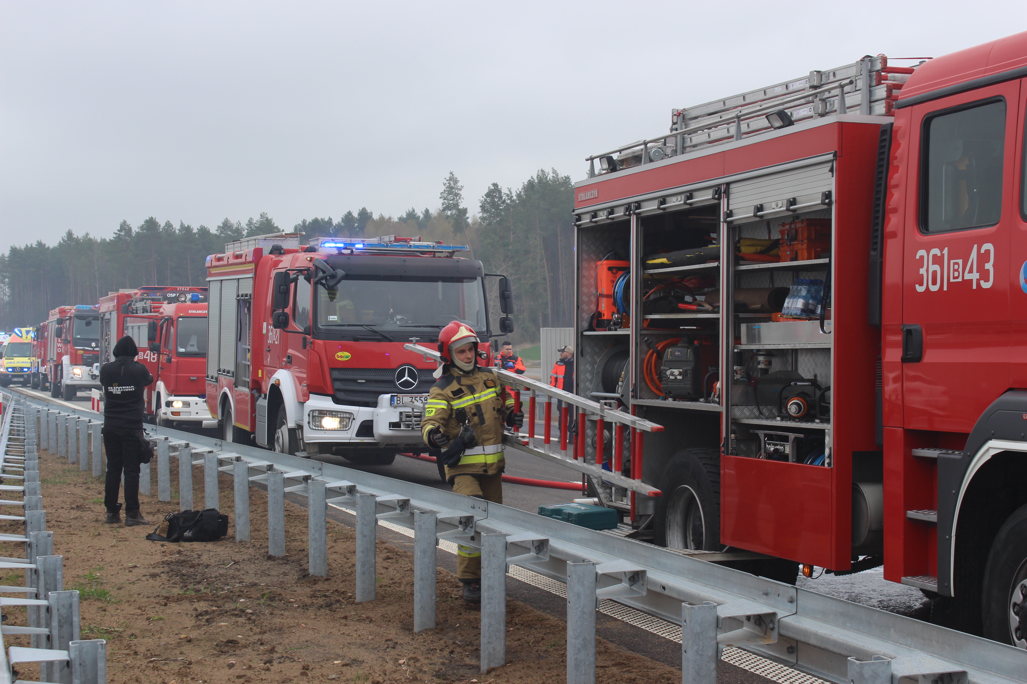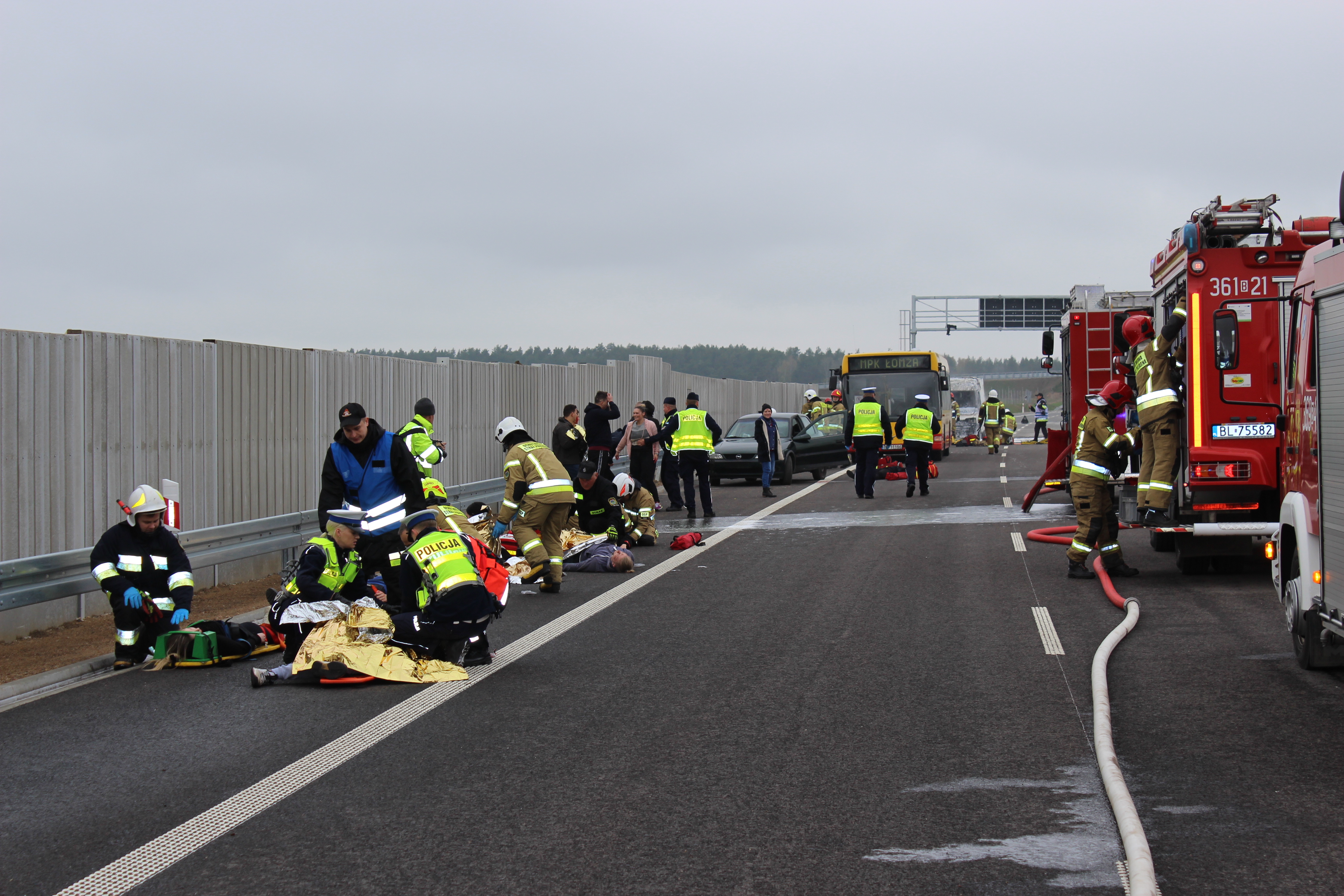 „W dniu 26 kwietnia 2022 r. na drodze S61 prowadzono prace konserwacyjne wyświetlaczy systemu zarzadzania ruchem. Pracownik wykonujący prace na bramownicy z niewiadomych przyczyn traci przytomność i upuszcza narzędzia na przebiegającą pod spodem jezdnię. Kierowca przejeżdżającego autobusu próbując gwałtownie wyminąć spadające przedmioty, uderza w samochód jadący przed nim i wpada w poślizg. Autobus hamuje i pozostaje na pasie jezdni.