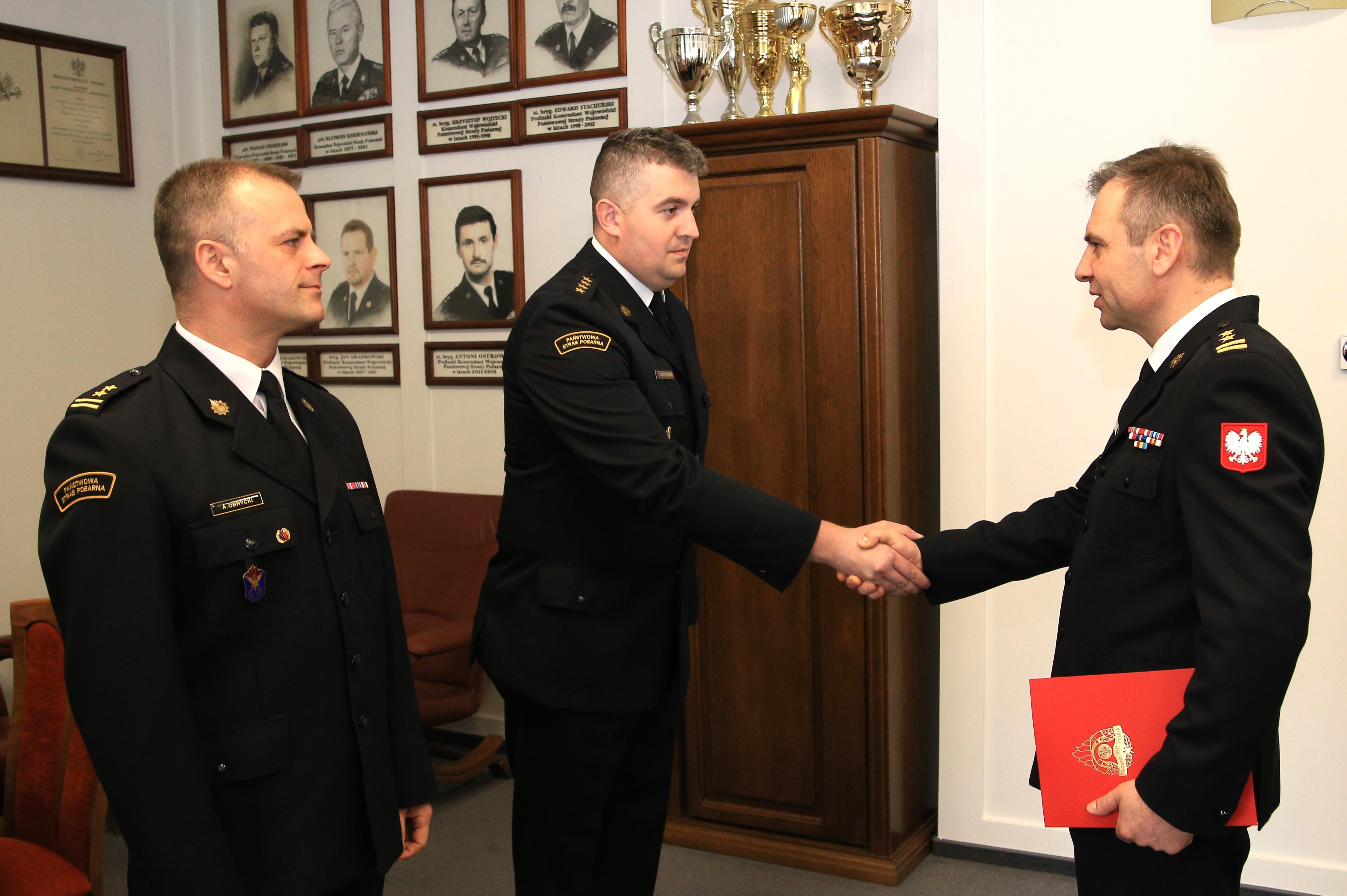 Decyzję wręczono w obecności zastępców Podlaskiego Komendanta Wojewódzkiego PSP st. bryg. Grzegorza Lisowskiego i st. bryg. Marcina Wierela oraz w obecności bryg. Arkadiusza Obryckiego – zastępcy komendanta miejskiego PSP w Łomży, który pełnił obowiązki komendanta miejskiego PSP w Łomży od 24 lutego 2024 r. do 23 kwietnia 2024 r. po odwołaniu ze stanowiska komendanta miejskiego PSP w Łomży bryg. Adama Kalinowskiego z dniem 23 lutego 2024 r. w związku ze zwolnieniem ze służby w PSP.