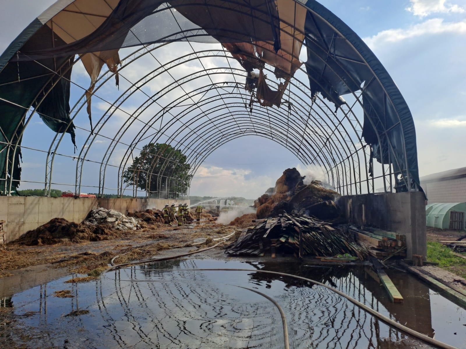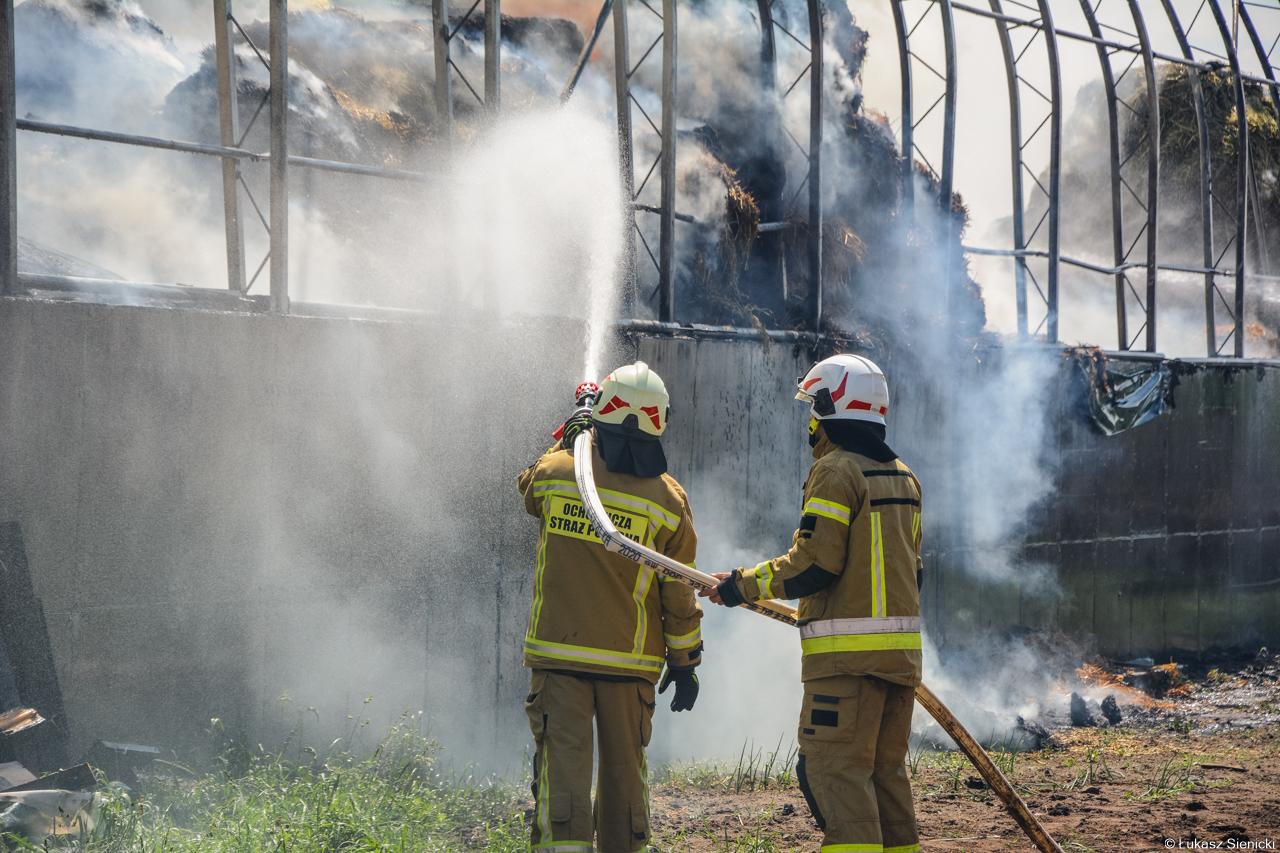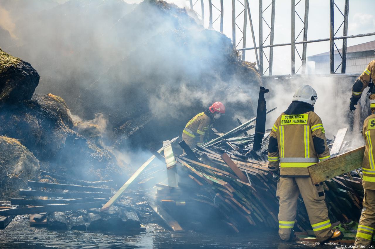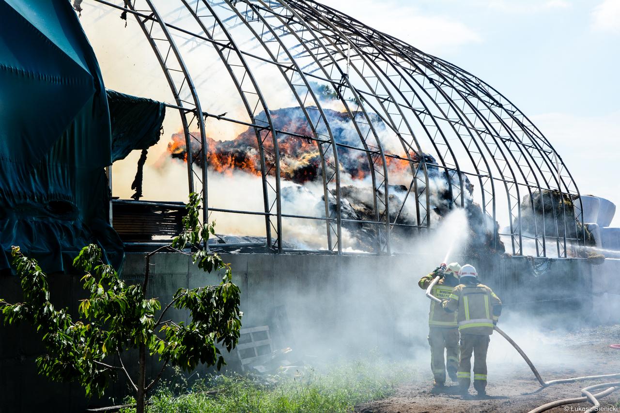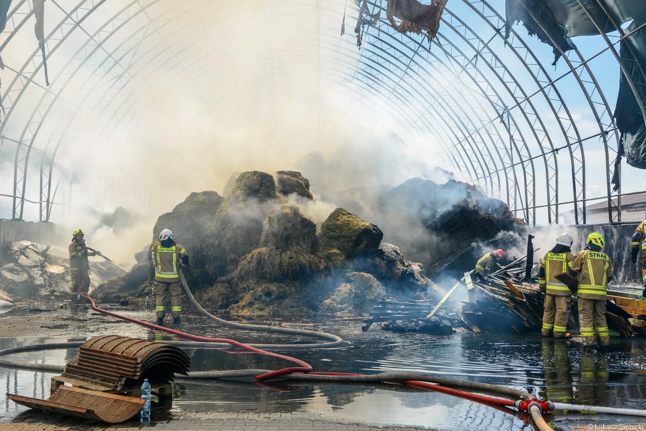 Po przybyciu na miejsce zdarzenia i przeprowadzeniu rozpoznania stwierdzono, że objęta pożarem jest hala magazynowa – łukowa o stalowej konstrukcji. Wewnątrz hali znajdowały się bele słomy – 250 szt., sianokiszonki – 300 szt., nawozy – 20 ton, pasze oraz drewno budowlane. Nikt nie wymagał pomocy medycznej.