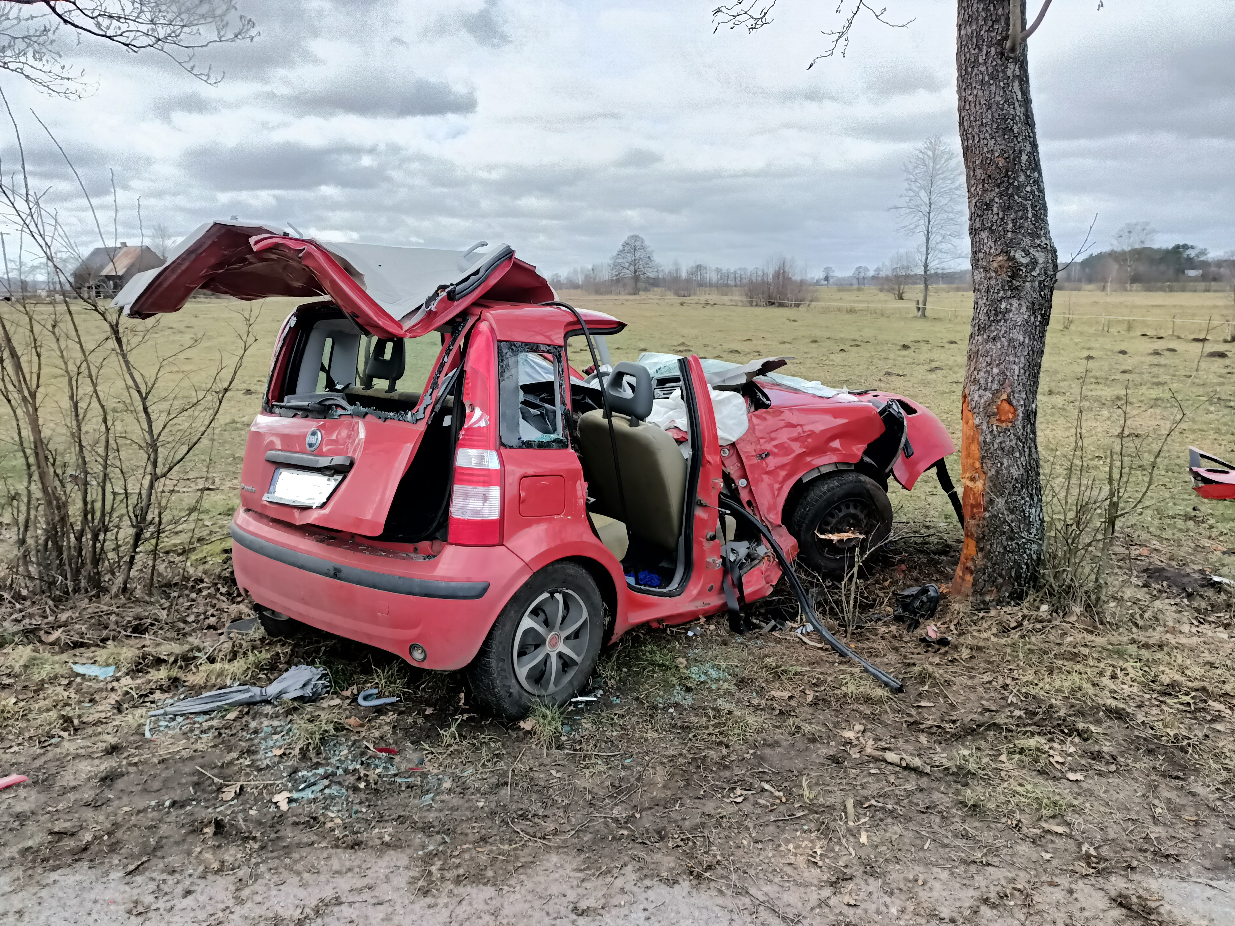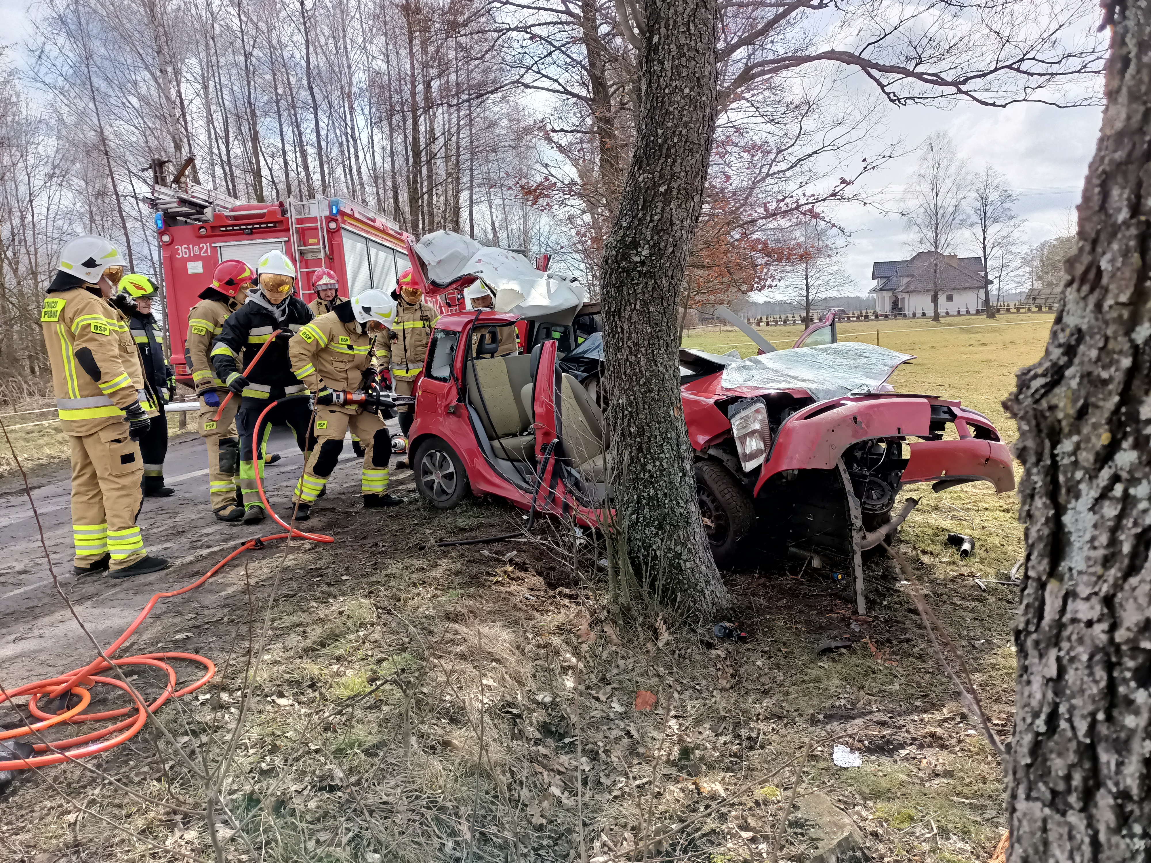 Po dojeździe zastępów Jednostek Ochrony Przeciwpożarowej na miejsce zdarzenia stwierdzono, że na drodze powiatowej nr 1905B Kuzie – Wyk, pojazd osobowy marki Fiat Panda zjechał z drogi i uderzył w drzewo. Pojazdem podróżowało 2 osoby. Będący na miejscu Zespół Ratownictwa Medycznego stwierdził zgon kierowcy pojazdu. Działania zastępów PSP i OSP polegały na zabezpieczeniu miejsca zdarzenia, odłączeniu akumulatora, zakręceniu zaworu butli LPG, oraz przy użyciu narzędzi hydraulicznych zrobieniu dostępu i wydobyciu zakleszczonego pasażera i przekazaniu go ZRM. Podczas działań droga była zablokowana.