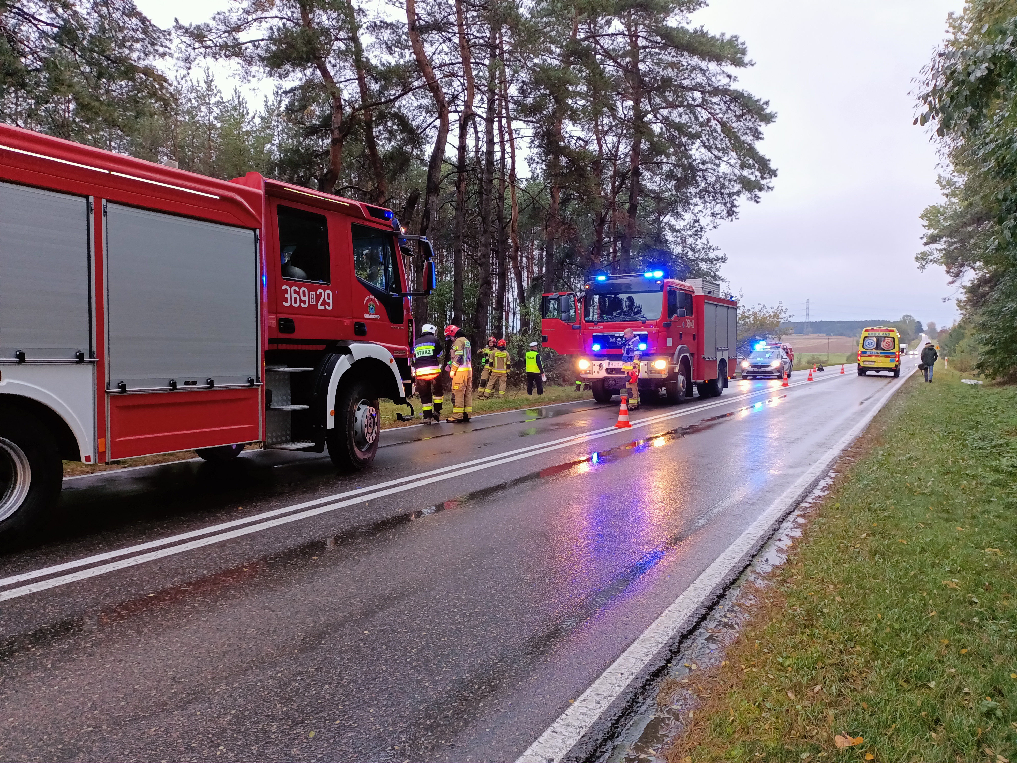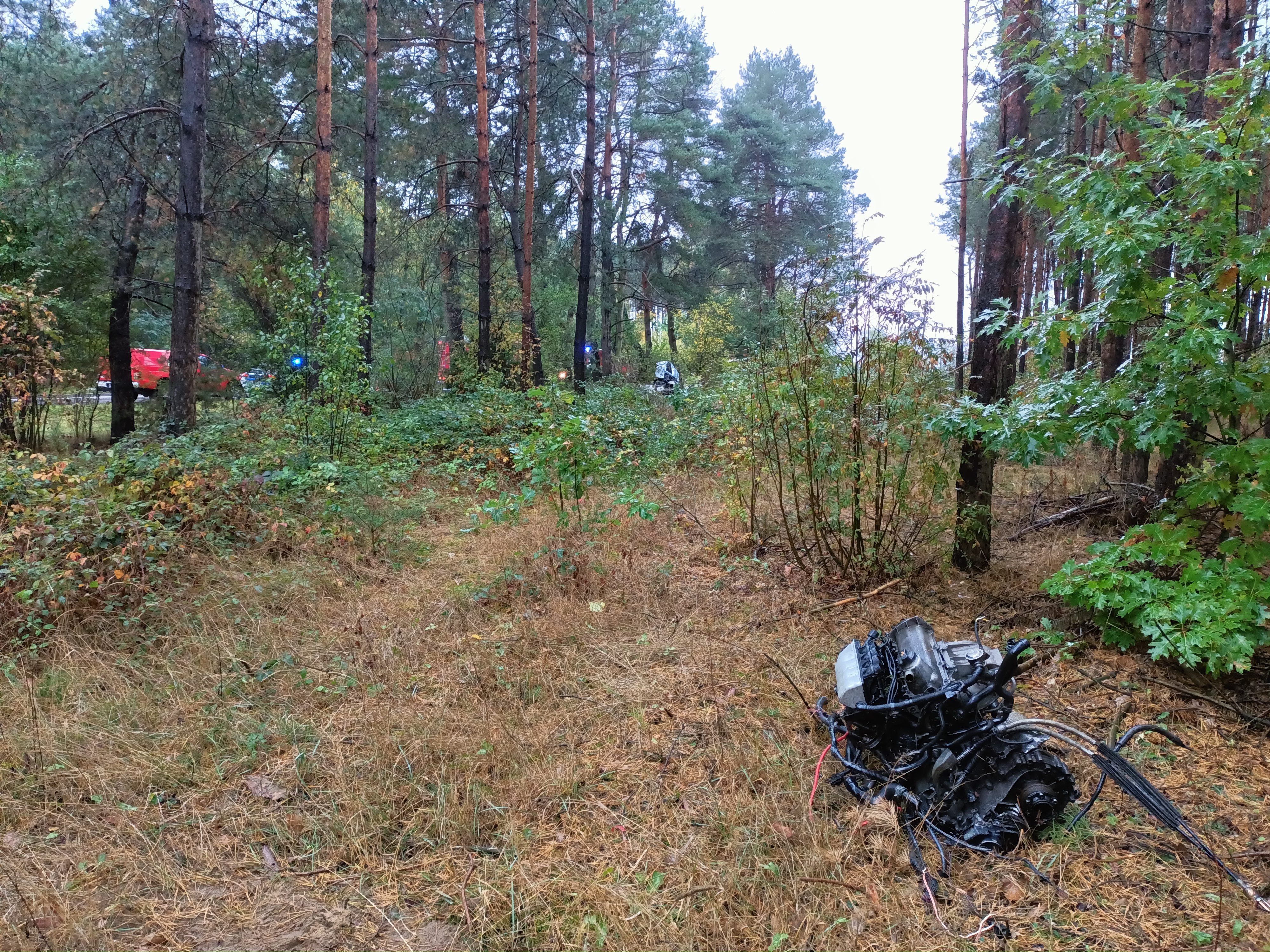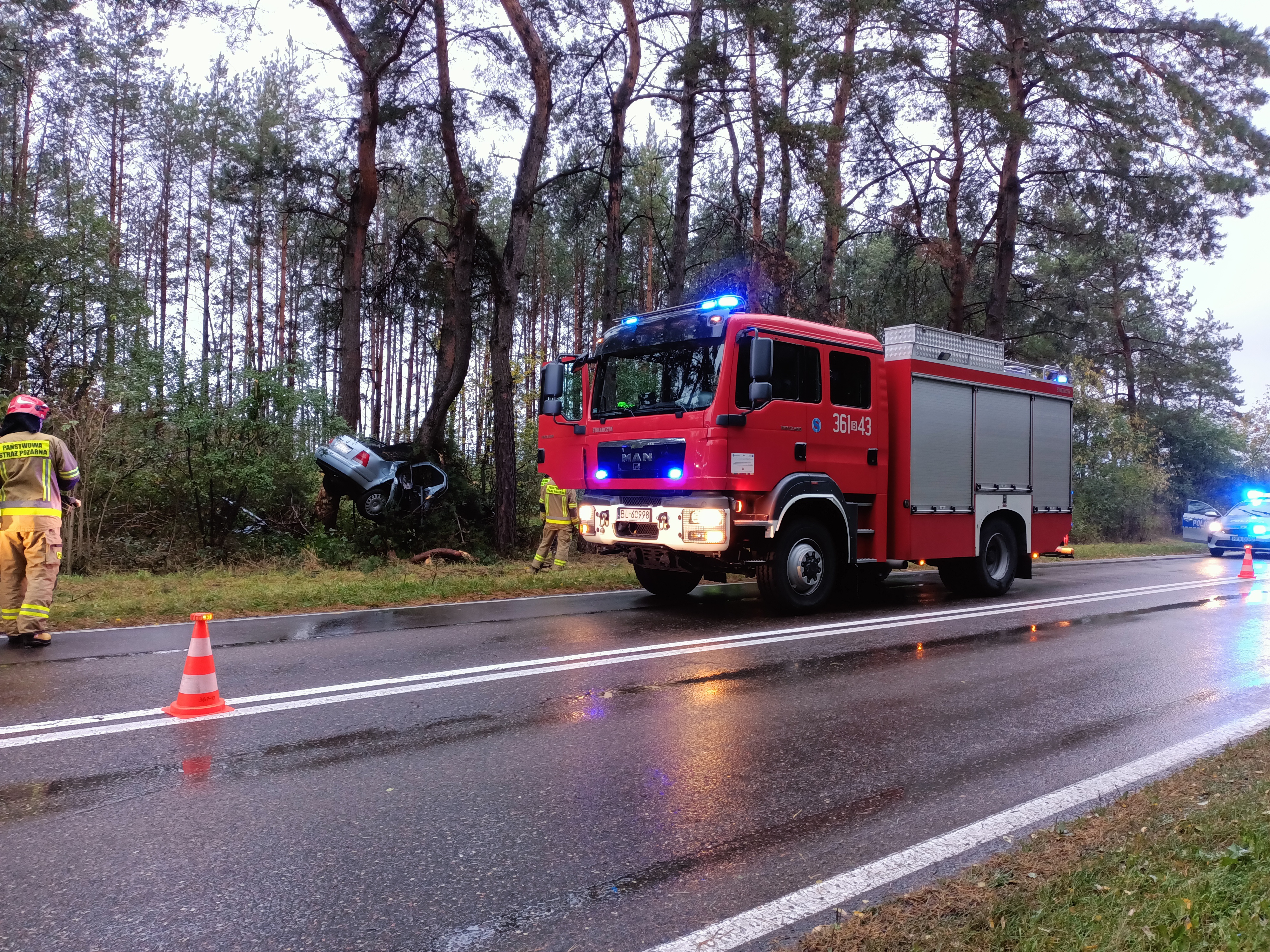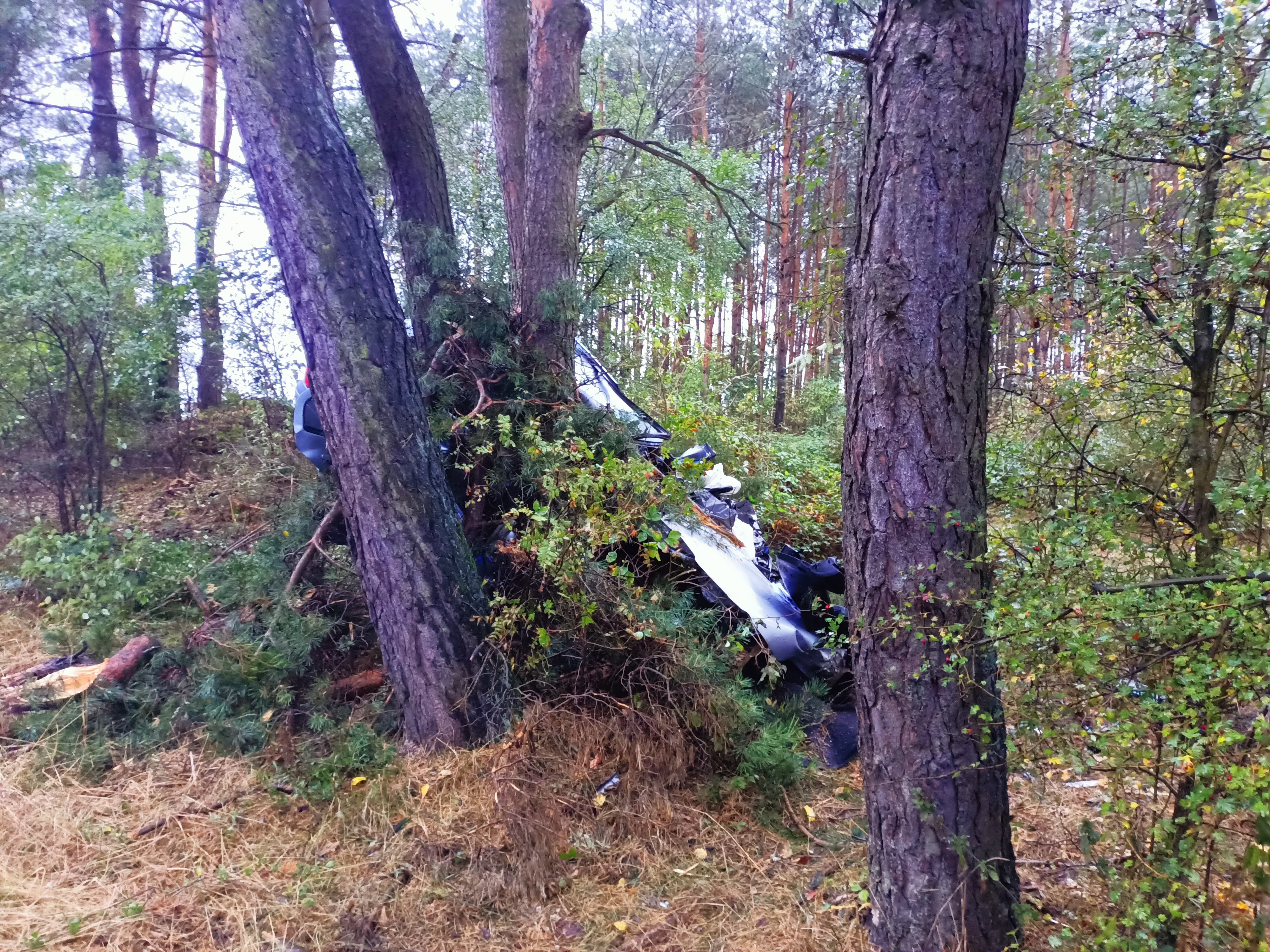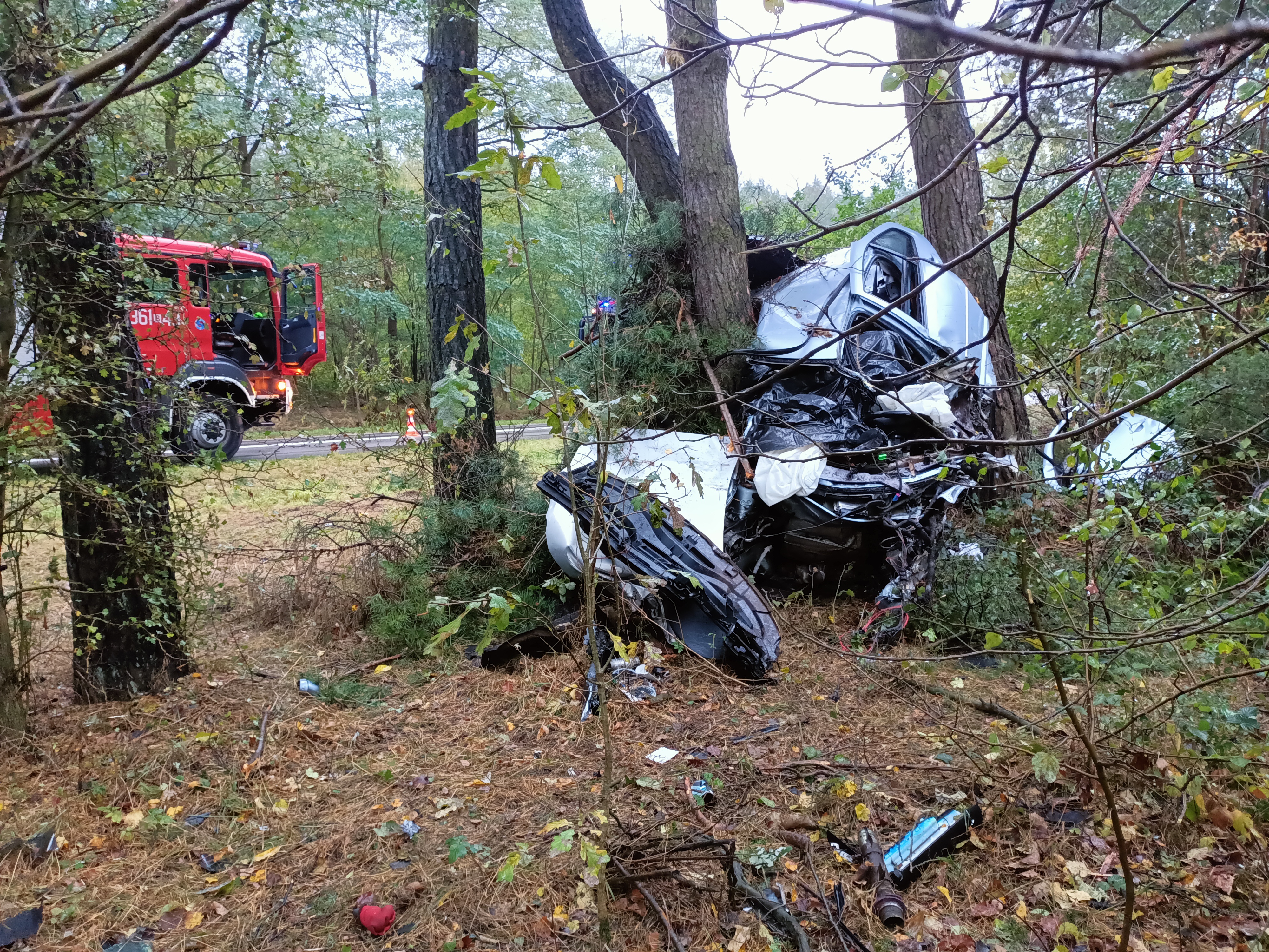 Po dojeździe zastępów jednostek ochrony przeciwpożarowej na miejsce zdarzenia stwierdzono, że poza pasem drogi pomiędzy 2 drzewami znajduje się samochód osobowy. W pojeździe uwięziony jest kierowca – nieprzytomny. Przybyły wraz z zastępami jednostek ochrony przeciwpożarowej na miejsce lekarz z Zespołu Ratownictwa Medycznego stwierdził zgon kierującego.