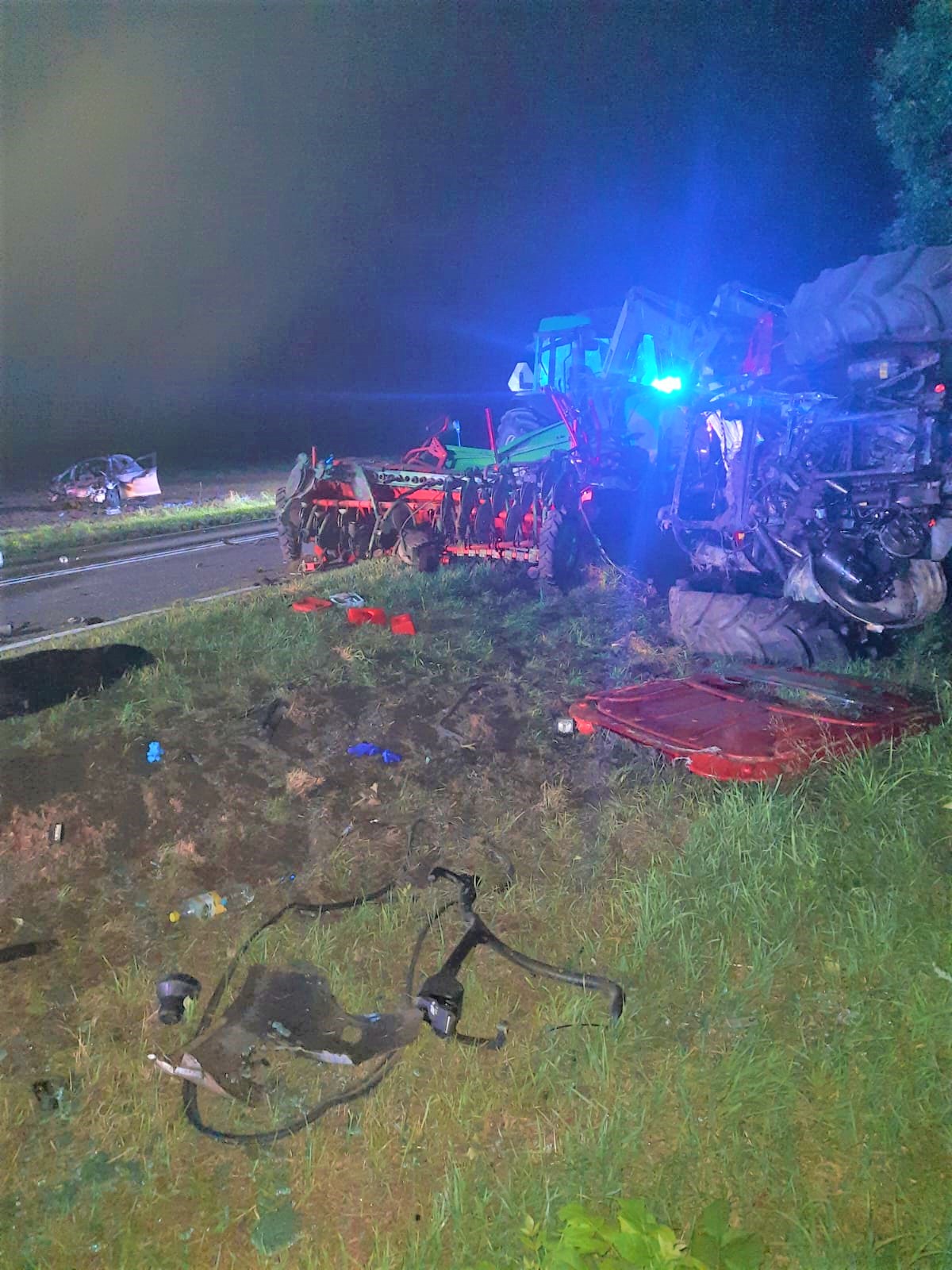 Po dojeździe zastępów jednostek ochrony przeciwpożarowej na miejsce zdarzenia stwierdzono, że na DW 677, doszło do wypadku ciągnika rolniczego i samochodu osobowego. W skutek zderzenia pojazdów zapalił się samochód osobowy, w którym znajdowało się dwóch mężczyzn. Natomiast kierujący ciągnikiem został przygnieciony przez koło ciągnika. Osoby poszkodowane zostały wydobyte przez osoby postronne przed przybyciem JOP.