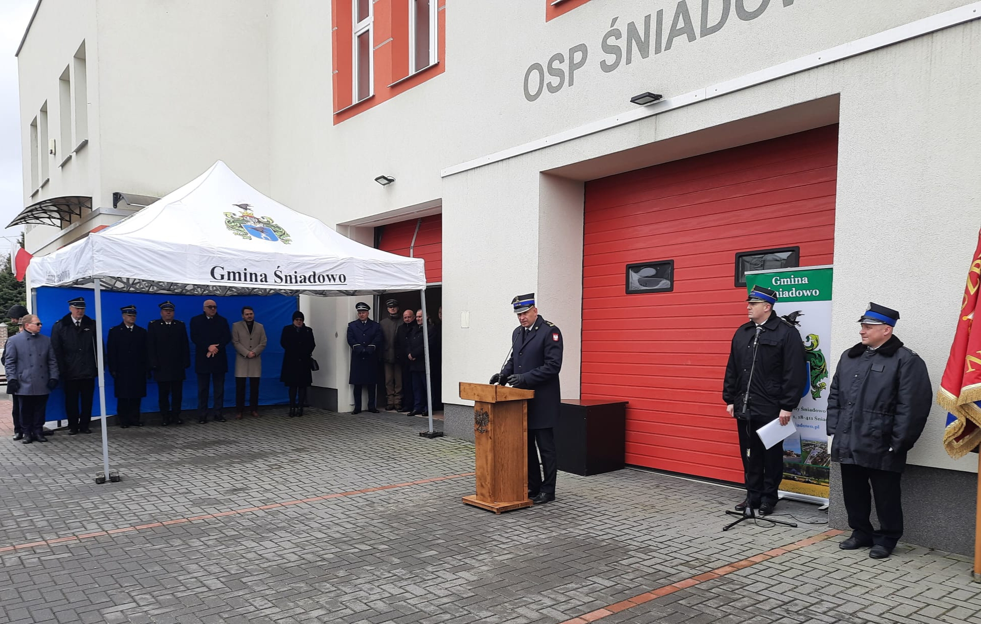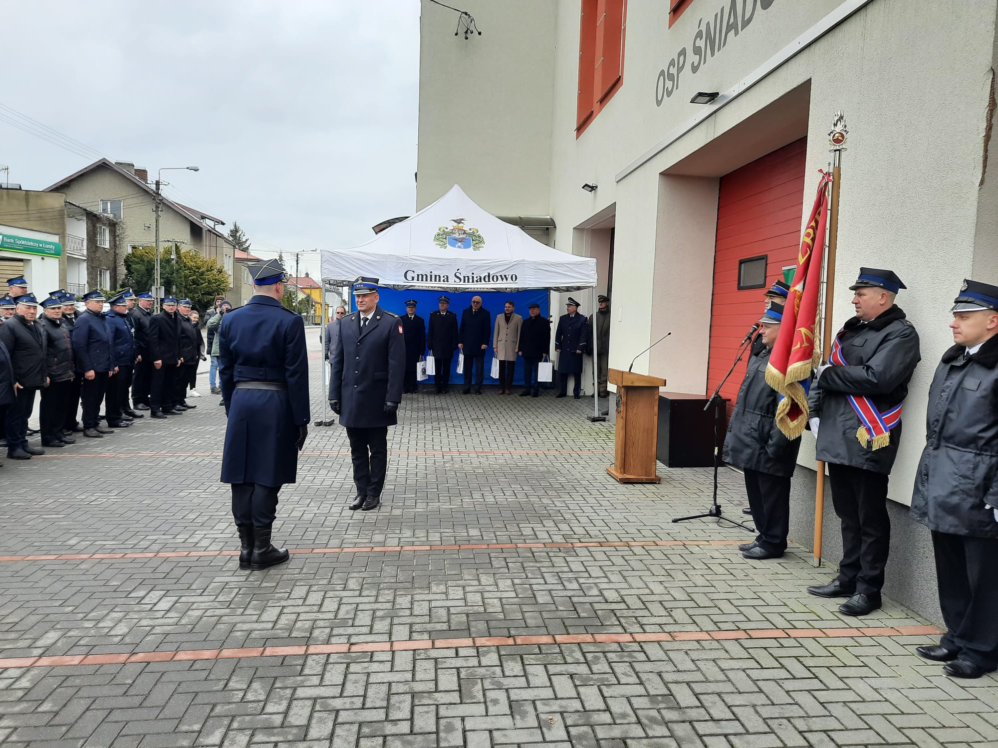 O godzinie 10.00 została odprawiona msza świętą w kościele parafialnym pod wezwaniem Wniebowzięcia NMP w Śniadowie. Po zakończeniu nabożeństwa, strażacy, zaproszeni goście oraz mieszkańcy przemaszerowali na miejsce zbiórki. Uroczystość rozpoczęła się złożeniem meldunku przez dowódcę uroczystości Podlaskiemu Komendantowi Wojewódzkiemu Państwowej Straży Pożarnej st. bryg. Sebastianowi Zdanowiczowi. Następnie gospodarz uroczystości wójt gminy Śniadowo – Rafał Pstrągowski przywitał zaproszonych gości.