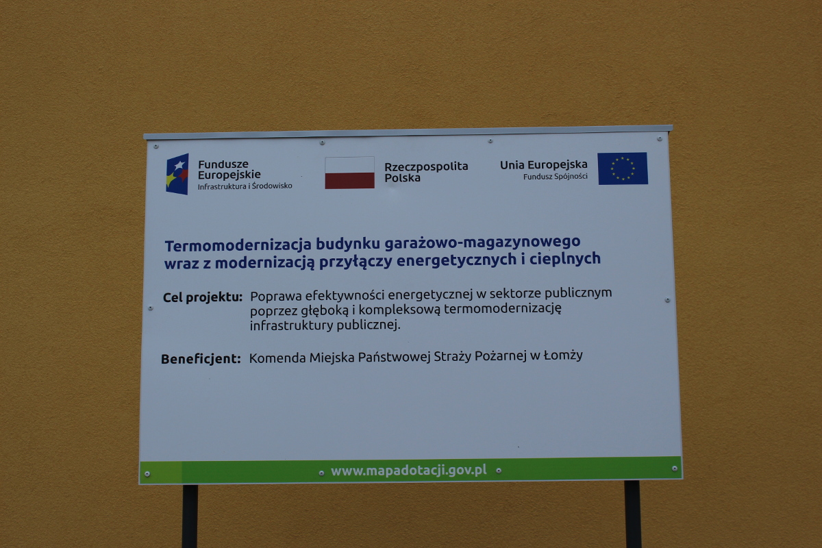 11 czerwca 2019 roku w siedzibie Narodowego Funduszu Ochrony Środowiska i Gospodarki Wodnej w Warszawie, Komendant Miejski Państwowej Straży Pożarnej w Łomży podpisał umowę na dofinansowanie Projektu „Termomodernizacja budynku garażowo - magazynowego wraz z modernizacją przyłączy energetycznych i cieplnych ” w ramach działania 1.3.1 oś priorytetowa I Zmniejszenie emisyjności gospodarki Programu Operacyjnego Infrastruktura i Środowisko 2014 – 2020.