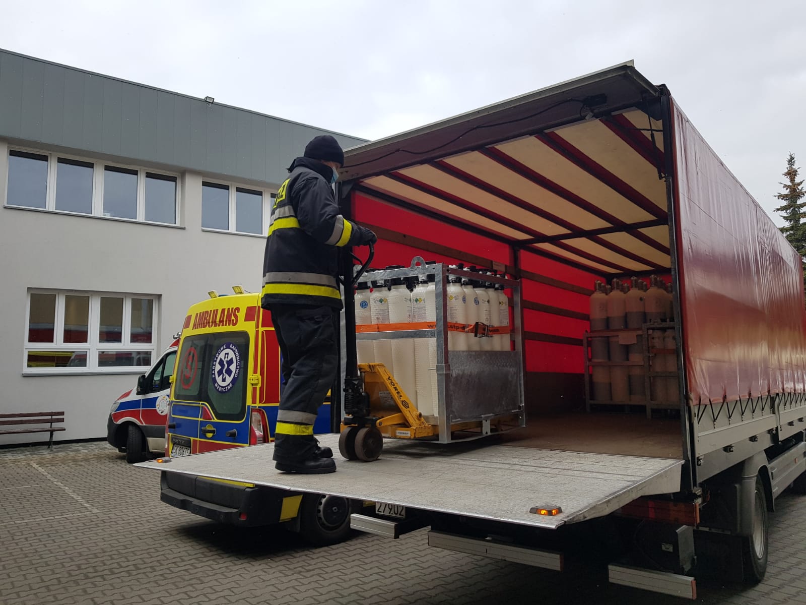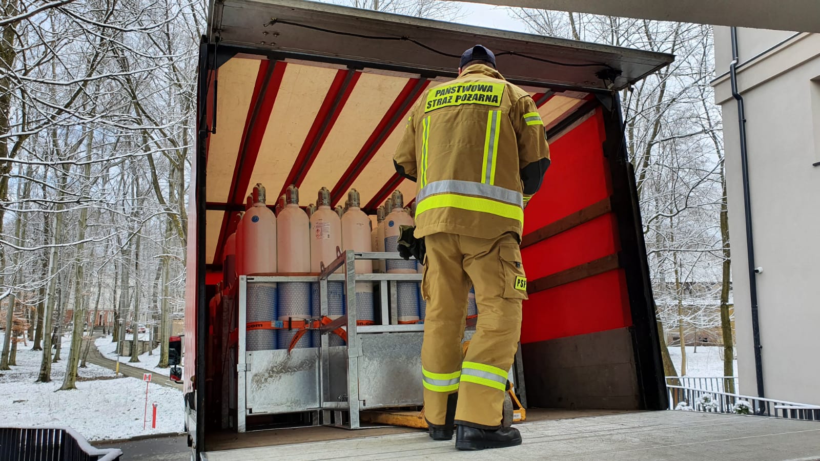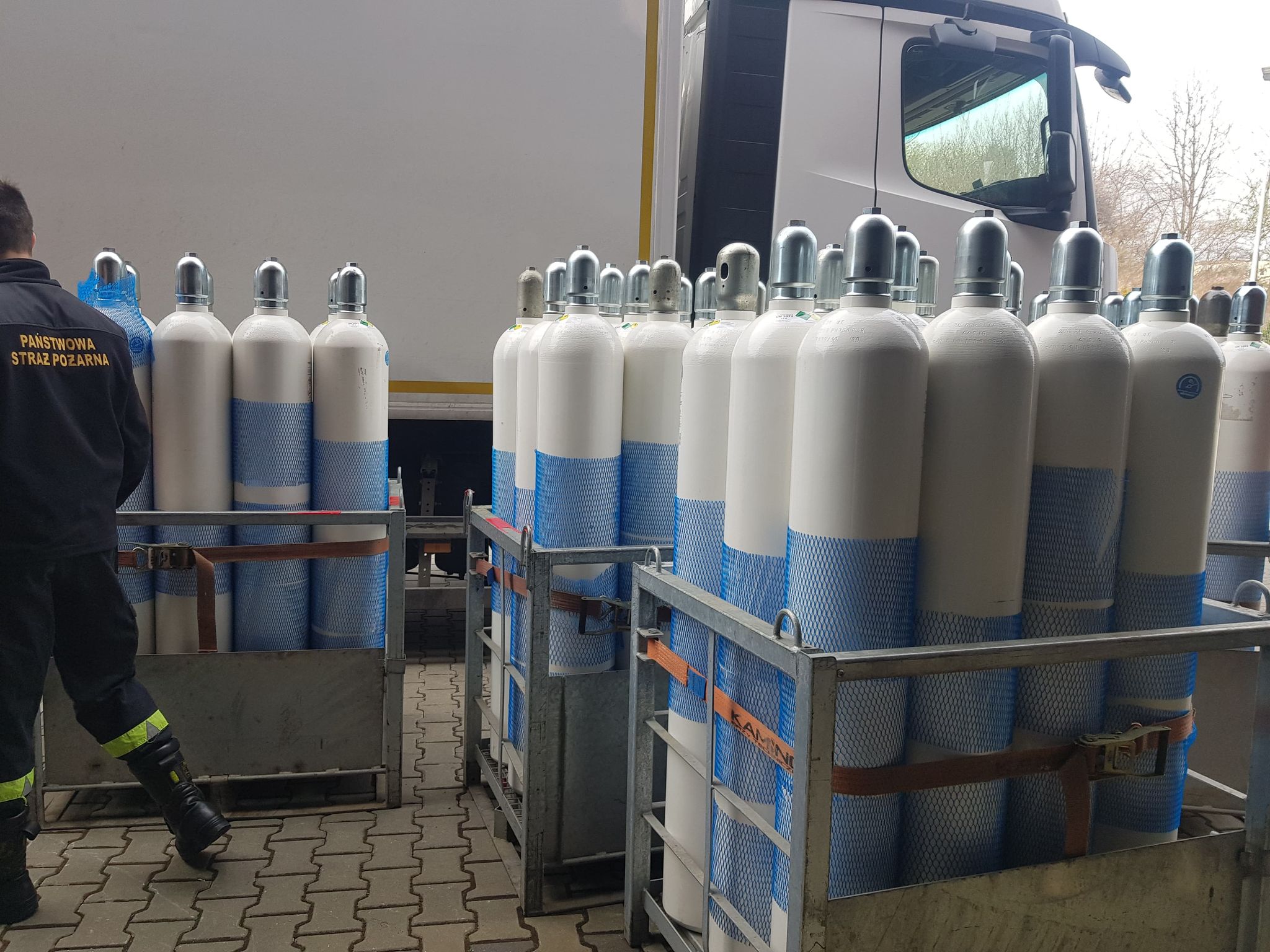 Mysłowiccy strażacy rozładowują i dowożą butle z tlenem