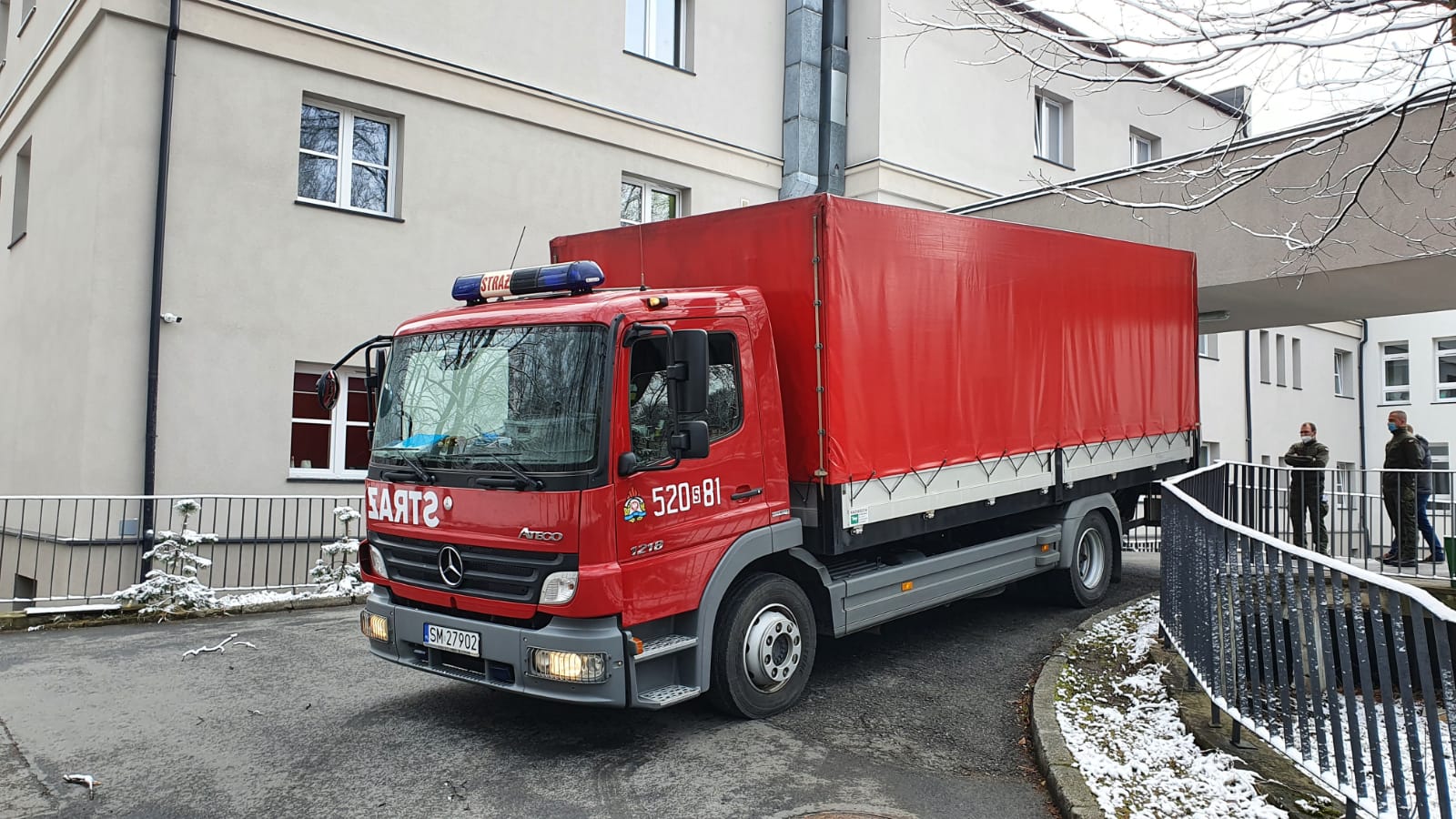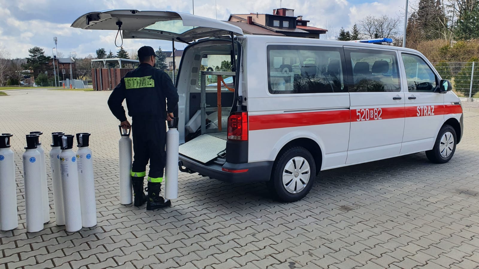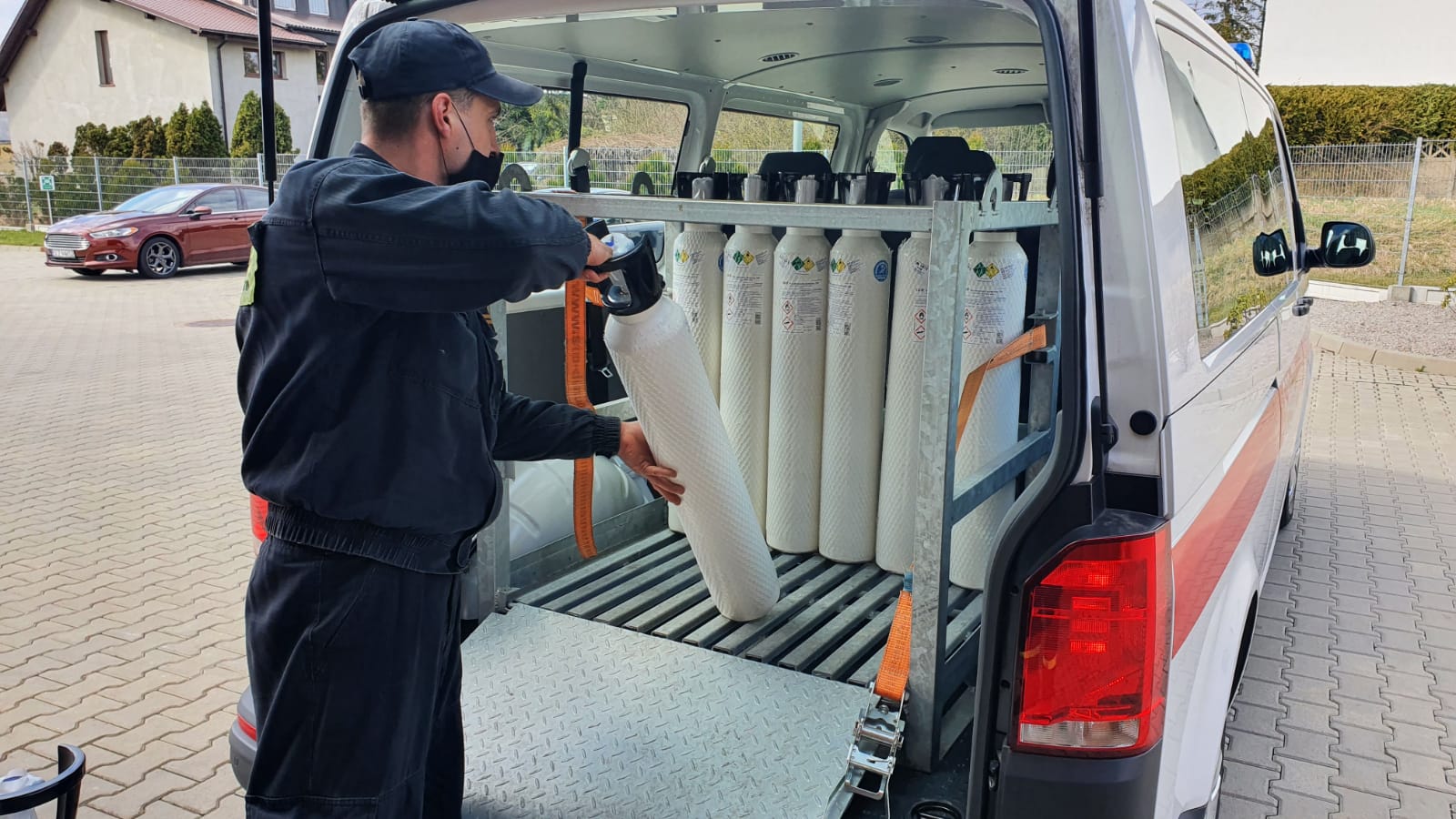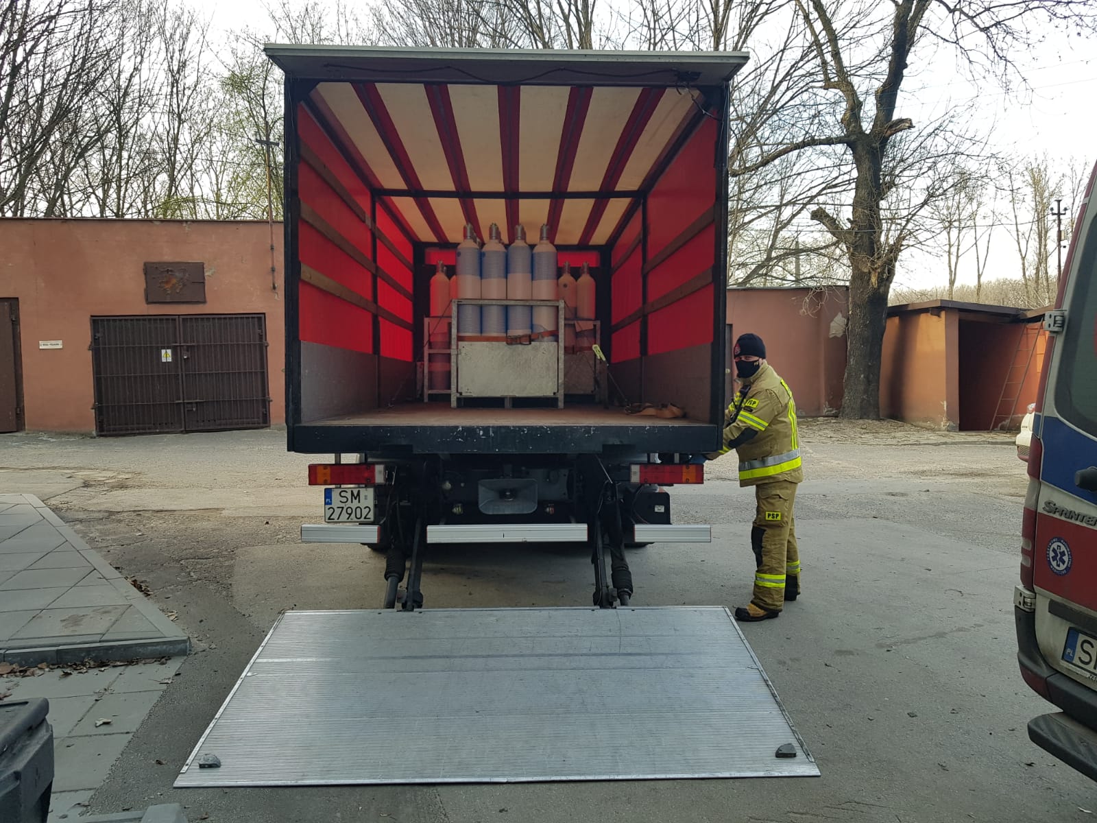 Mysłowiccy strażacy rozładowują i dowożą butle z tlenem