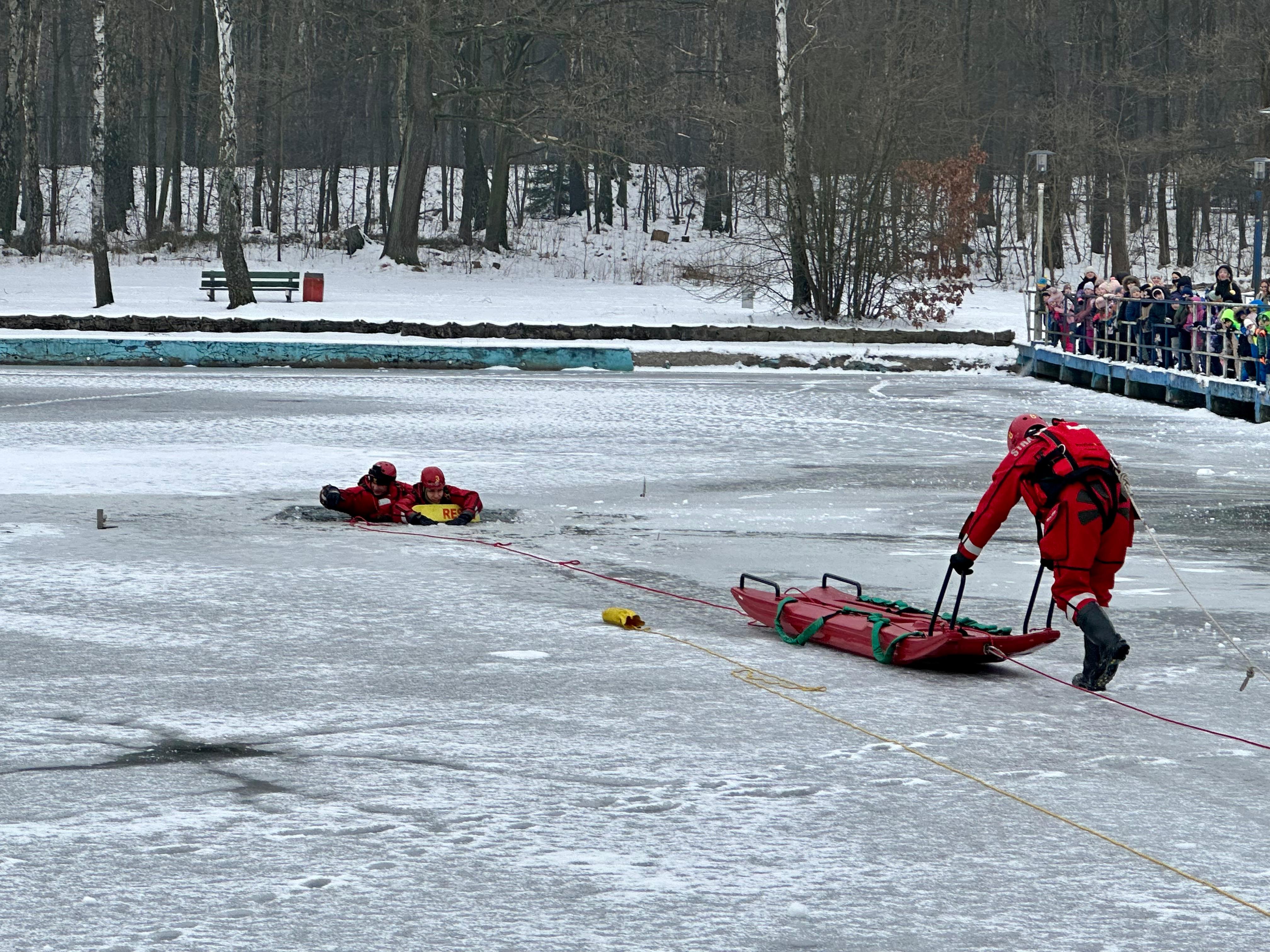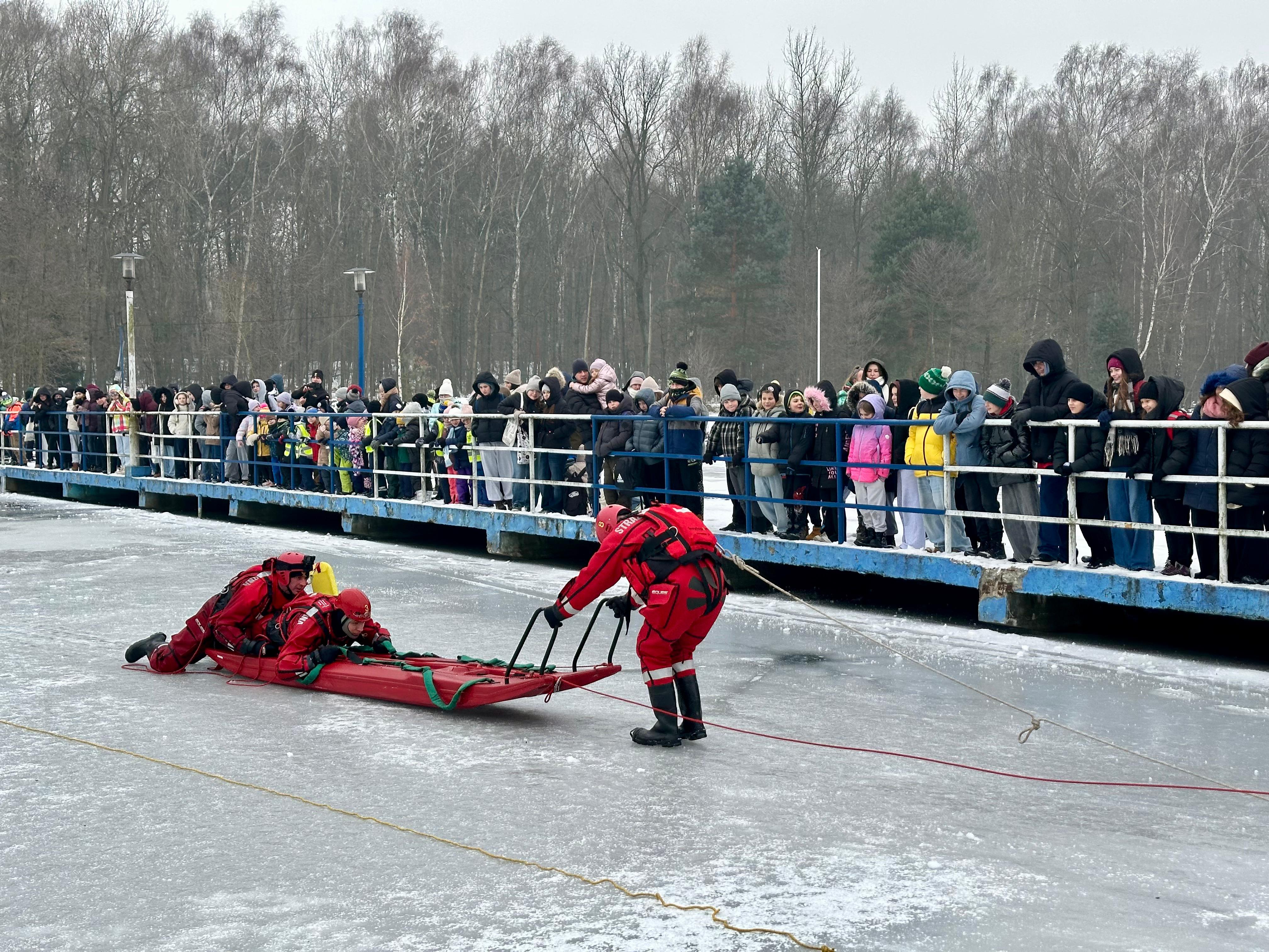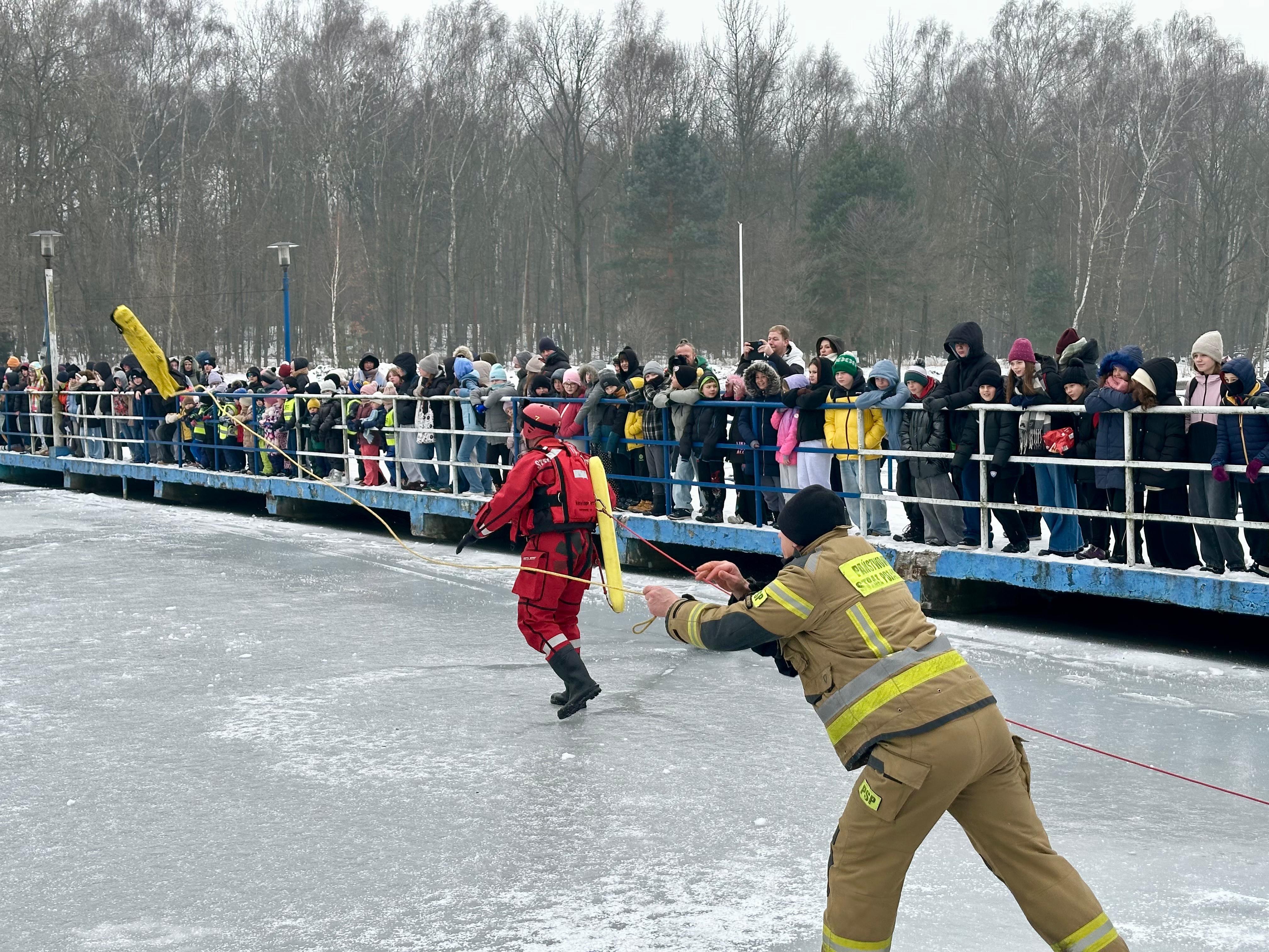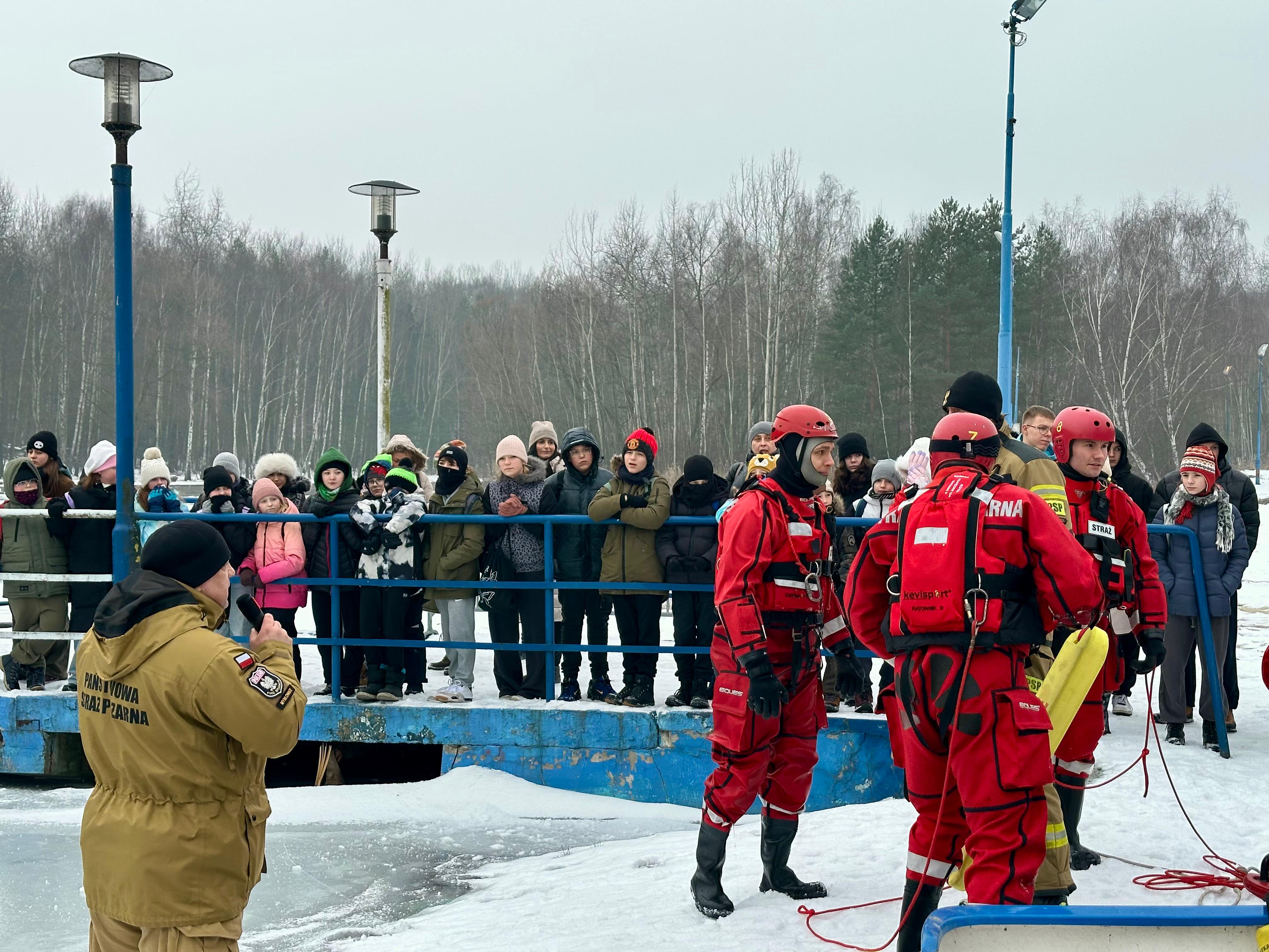 Podczas pokazu omówiono zasady bezpiecznego spędzania ferii zimowych, ze szczególnym uwzględnieniem zagrożeń związanych z wchodzeniem na zamarznięte zbiorniki wodne.