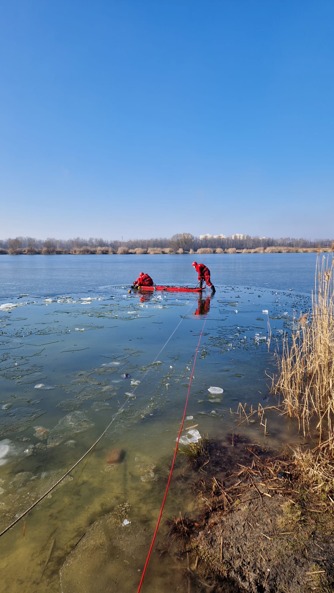 Straż Pożarna dysponuje specjalistycznym sprzętem do ratowania osób, pod którymi załamał się lód. Powiadom nas jak najszybciej!