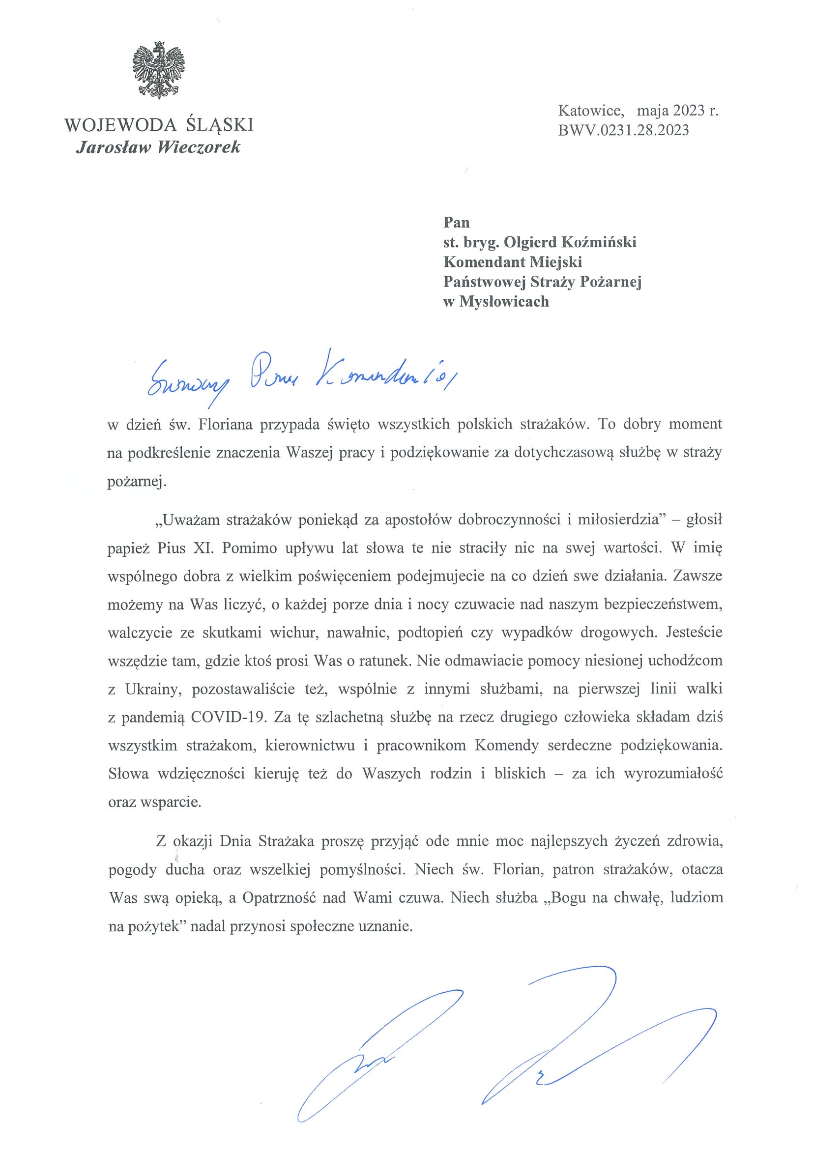 Niech nasz patron święty Florian dodaje Wszystkim otuchy, siły i wytrwałości zarówno na niwie zawodowej jak i w trudach życia codziennego, a także pozwoli pozostać w dobrym zdrowiu”.