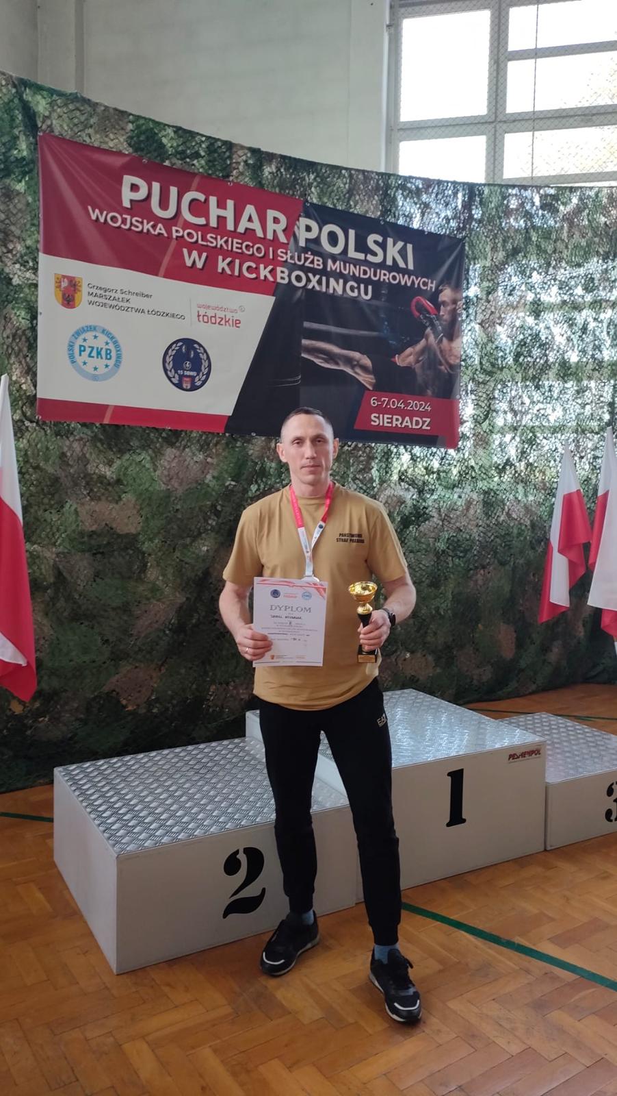 p.o. Komendant Miejski bryg. Rafał Pietrzyk pogratulował ogn. Danielowi Neubauerowi zajęcia III miejsca w Pucharze Polski Wojska Polskiego i Służb Mundurowych w kick-light w kat.-84 kg, który odbył się w dniach 6-7 kwietnia 2024 r. w Sieradzu.