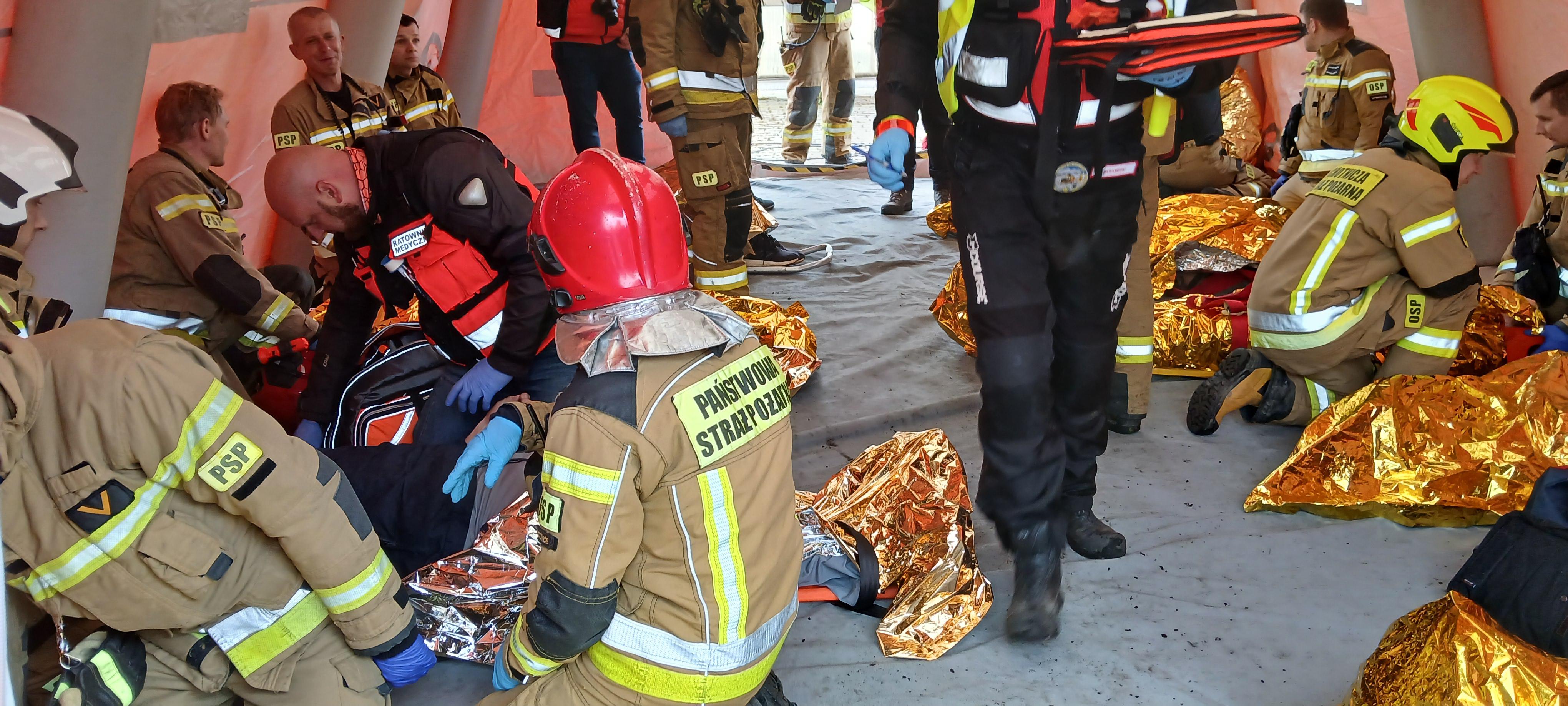 Podczas symulacji wypadku, strażacy przybyli na miejsce podjęli działania polegające na udzielaniu pomocy poszkodowanym i zabezpieczenia miejsca wypadku. Wykorzystując swoje umiejętności i specjalistyczny sprzęt, ekipy ratownicze szybko przystąpiły do ewakuacji poszkodowanych z uszkodzonych pojazdów w miejsce bezpieczne, udzielając niezbędnej pomocy medycznej.