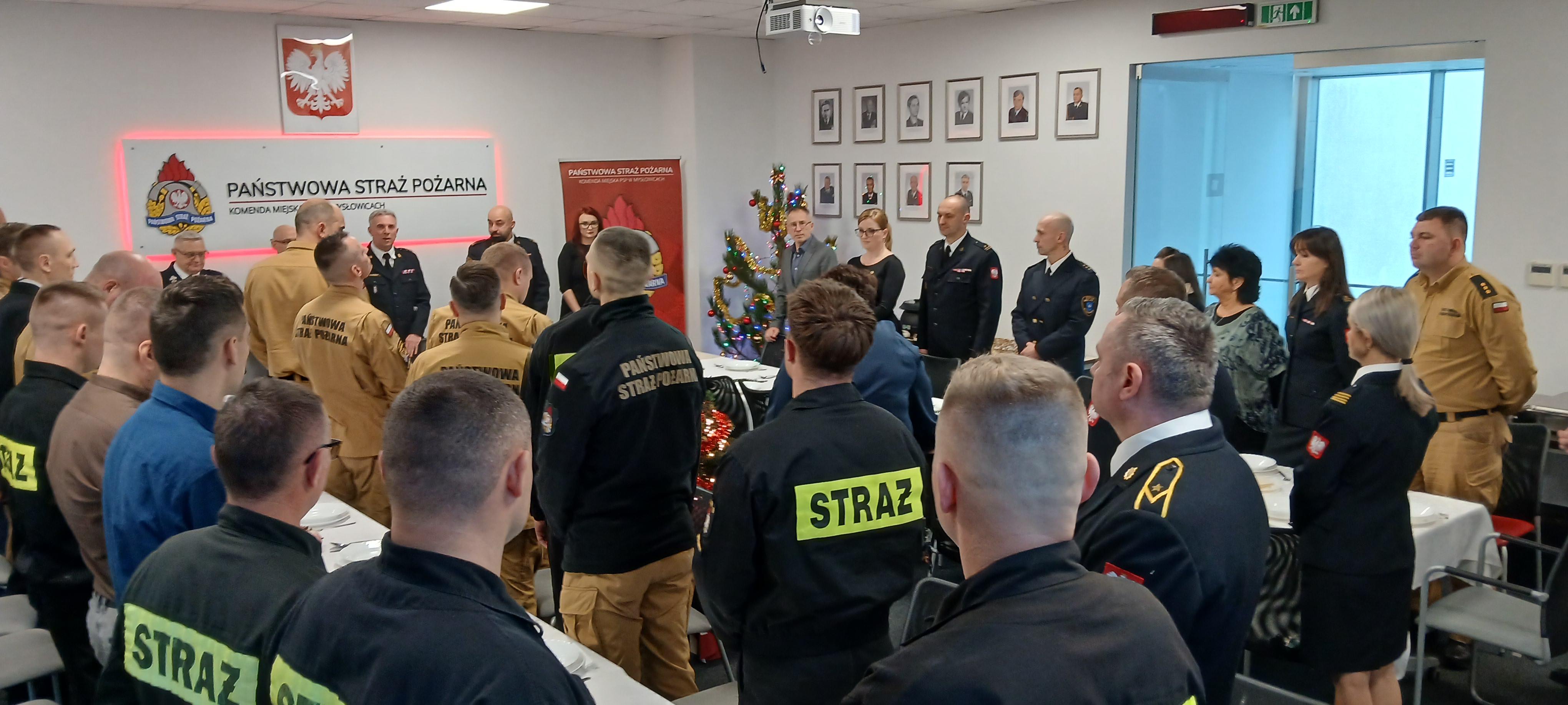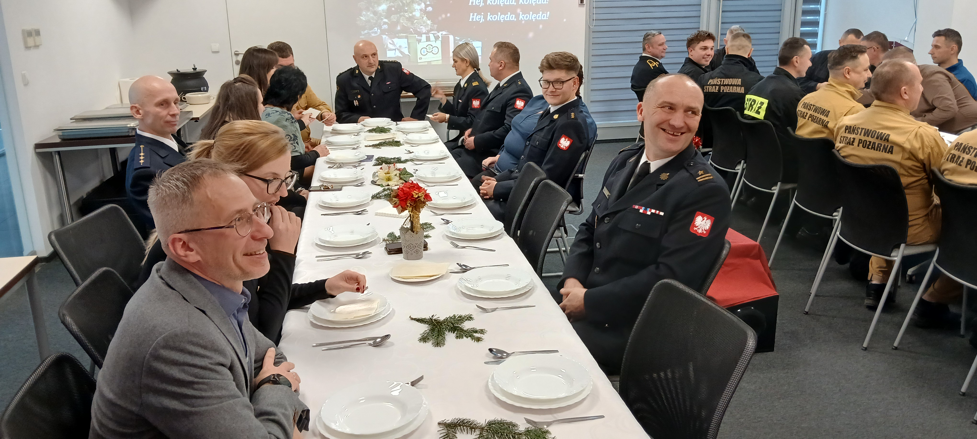 20 grudnia 2024 r. w sali szkoleniowej Komendy Miejskiej Państwowej Straży Pożarnej w Mysłowicach odbyło się uroczyste spotkanie wigilijne, które zgromadziło strażaków, przedstawicieli władz miasta oraz służb współpracujących ze strażą pożarną. W świątecznej atmosferze uczestnicy mieli okazję podsumować mijający rok, wymienić się refleksjami na temat wspólnych działań oraz zacieśnić relacje w duchu wzajemnej współpracy.