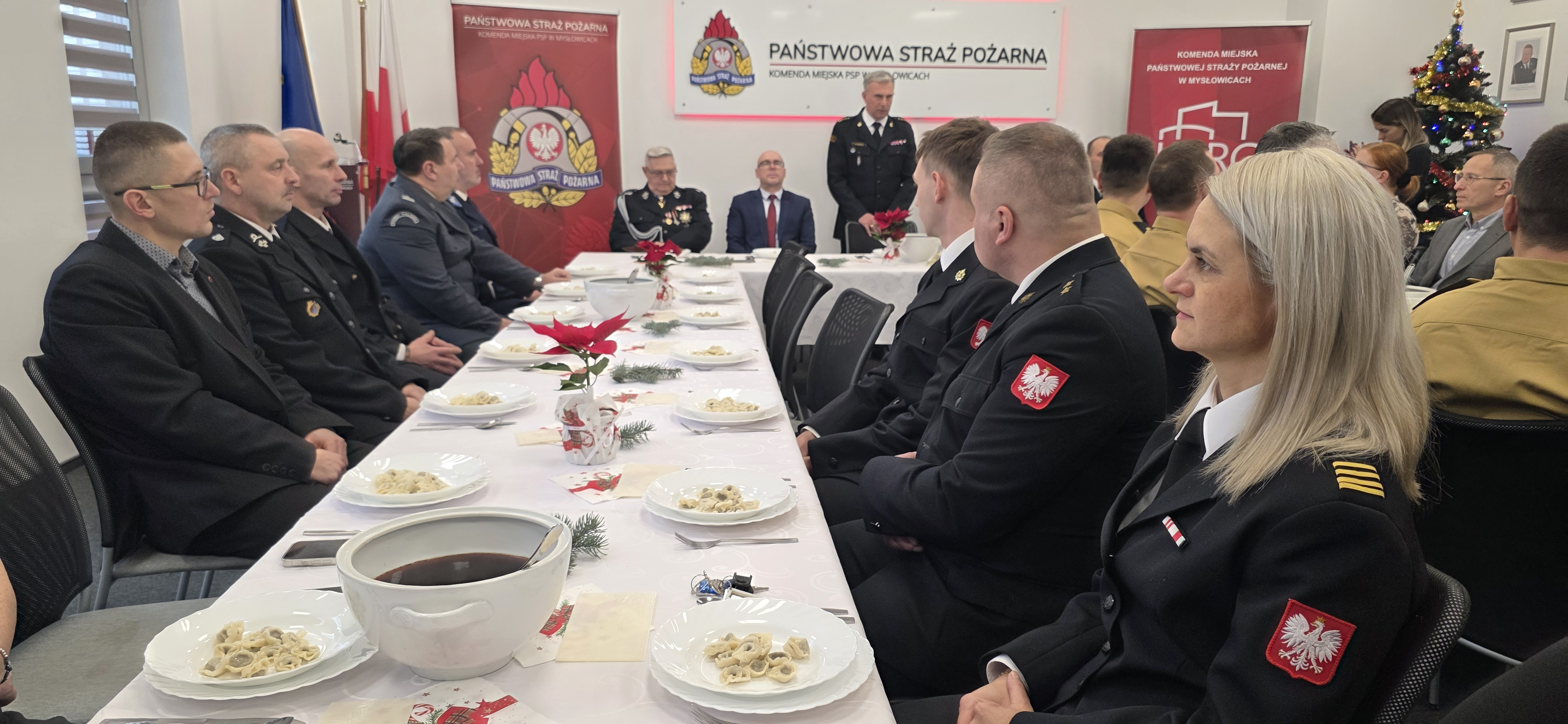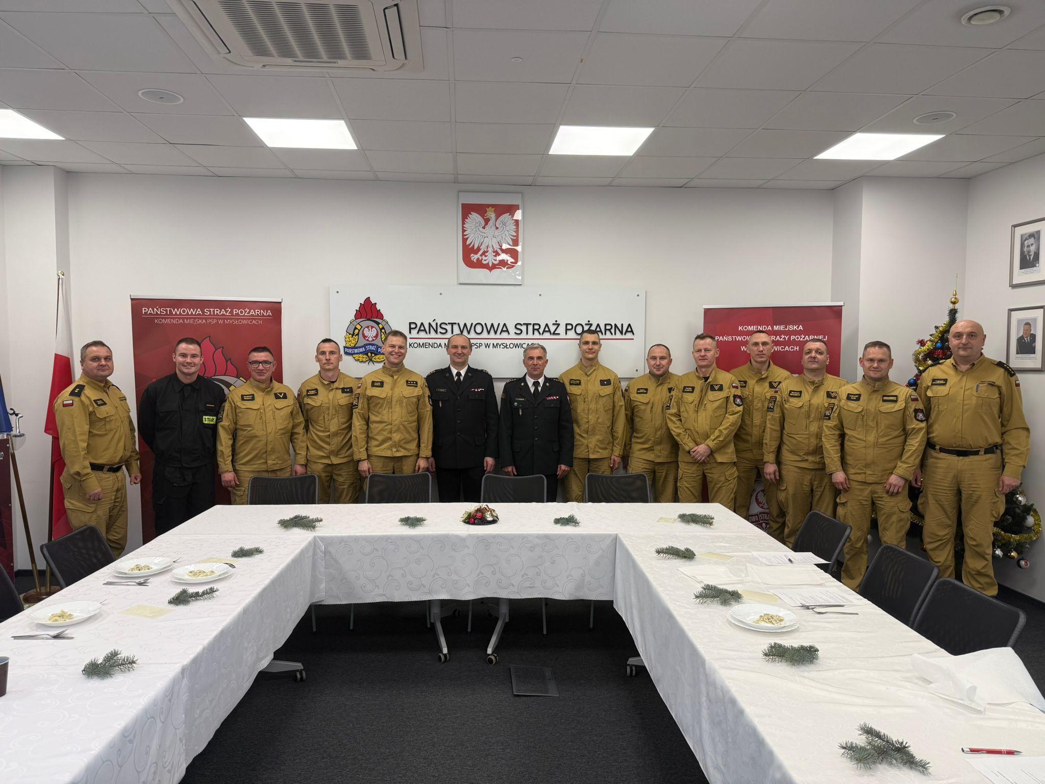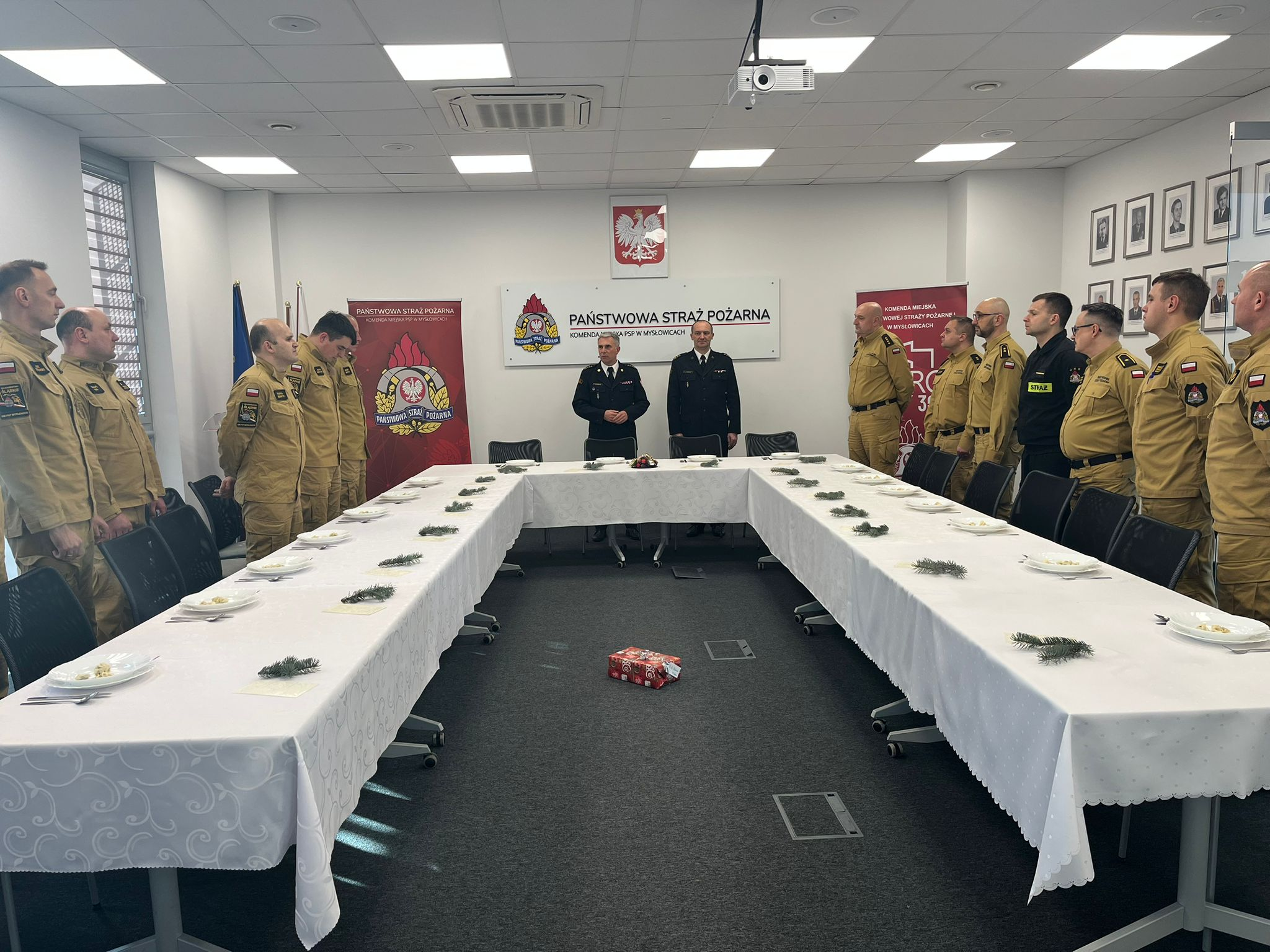 W dniu dzisiejszym, 19 grudnia, w Komendzie Miejskiej Państwowej Straży Pożarnej w Mysłowicach odbyło się uroczyste spotkanie opłatkowe, stanowiące okazję do podsumowania mijającego roku służby. Wydarzenie to było zwieńczeniem cyklu spotkań świątecznych – w dniach 17 i 18 grudnia Komendant Miejski spotkał się również z funkcjonariuszami pełniącymi służbę na 1. i 3. zmianie.