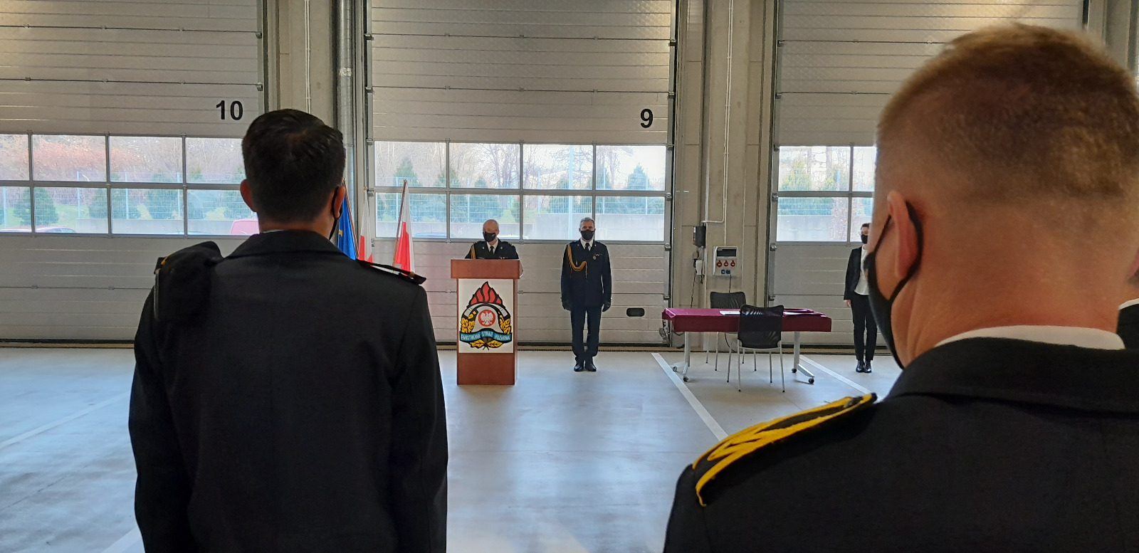 w Mysłowicach przyjął ślubowanie złożone przez strażaka wstępującego z dniem 1 grudnia br. w szeregi Państwowej Straży Pożarnej oraz w asyście Zastępcy Komendanta Miejskiego PSP wręczył mianowania do służby stałej funkcjonariuszom pełniącym służbę w Jednostce Ratowniczo – Gaśniczej w Mysłowicach.