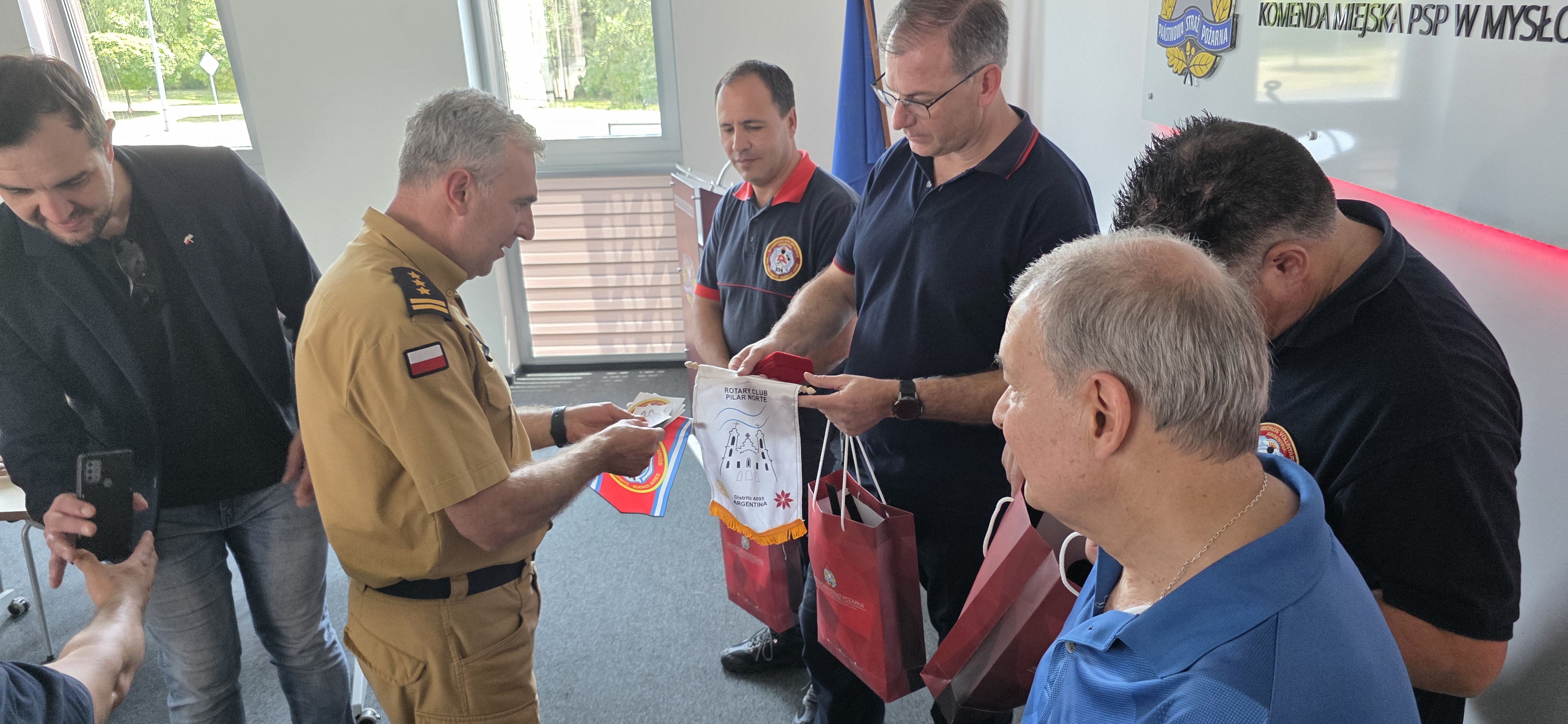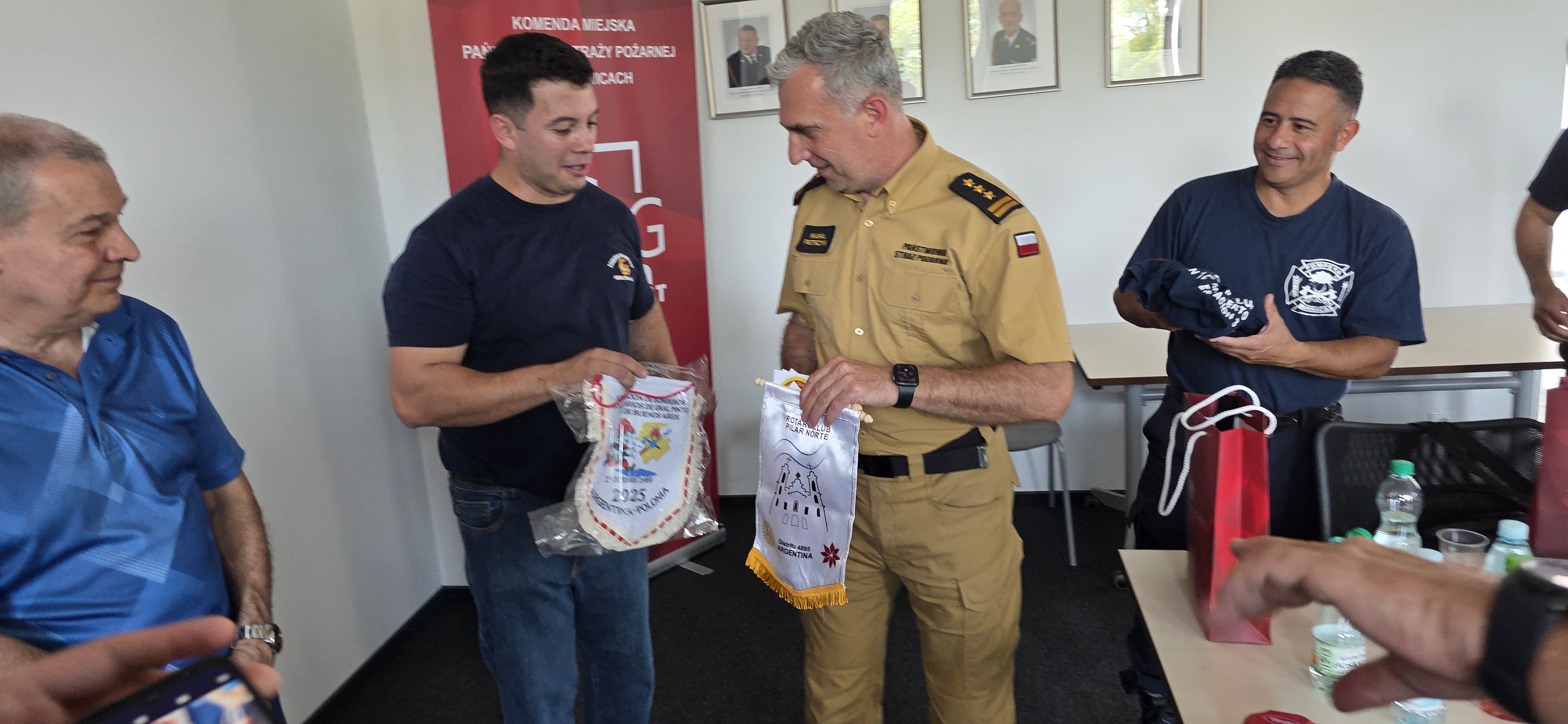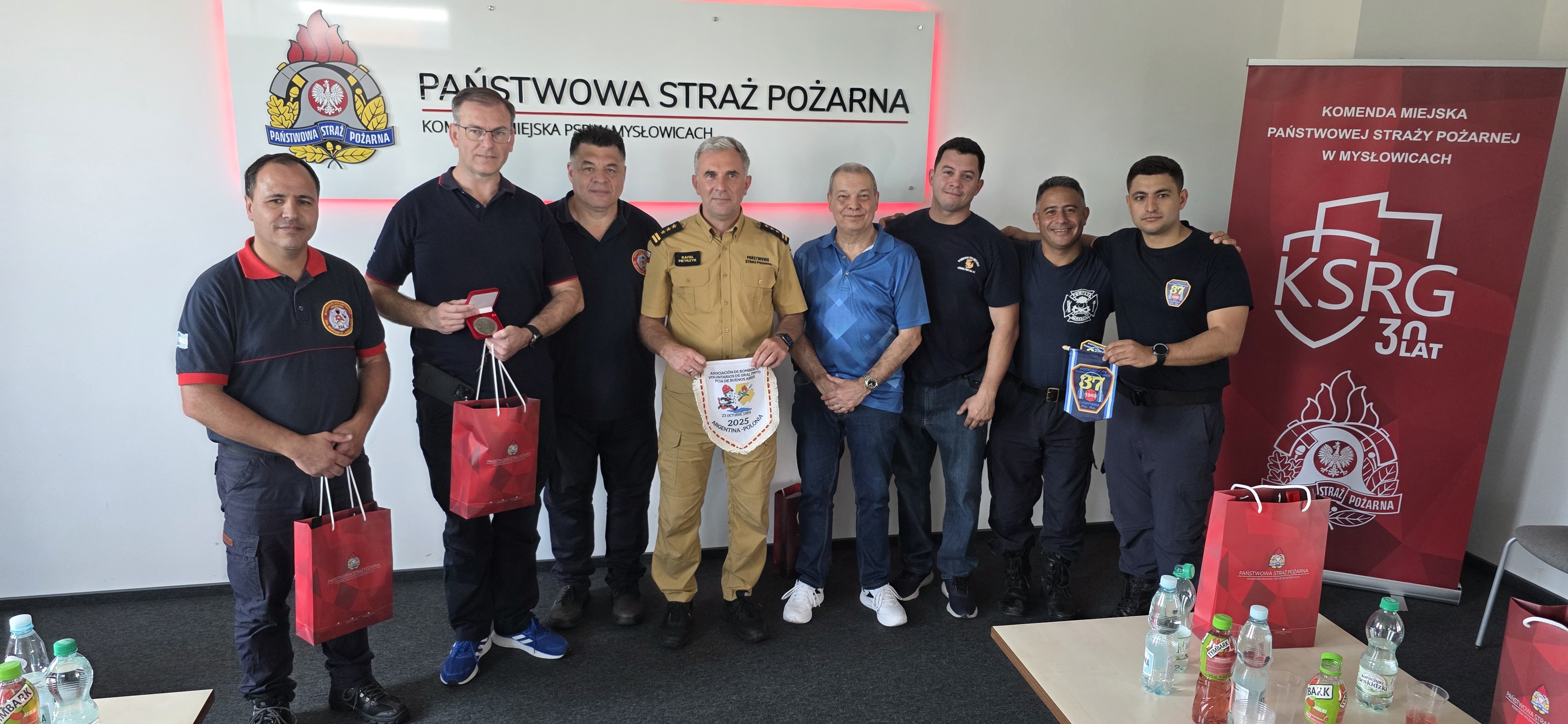 Gości serdecznie powitał Komendant Miejski PSP w Mysłowicach st. bryg. Rafał Pietrzyk. Na zakończenie spotkania Komendant wręczył argentyńskim strażakom pamiątkowe upominki. W zamian, delegacja z Ameryki Południowej przekazała proporce symbolizujące ich jednostki straży oraz koszulkę argentyńskich strażaków, co było wyrazem wzajemnego szacunku i braterstwa służb ratowniczych.