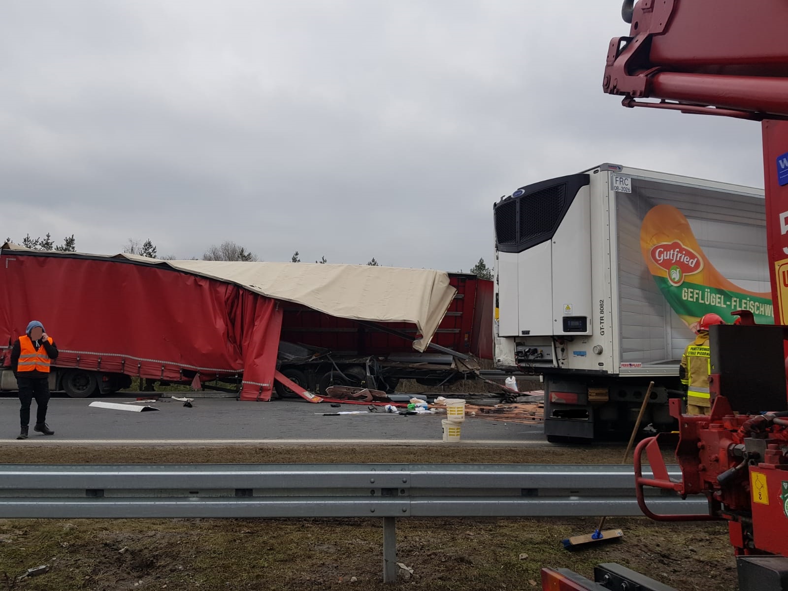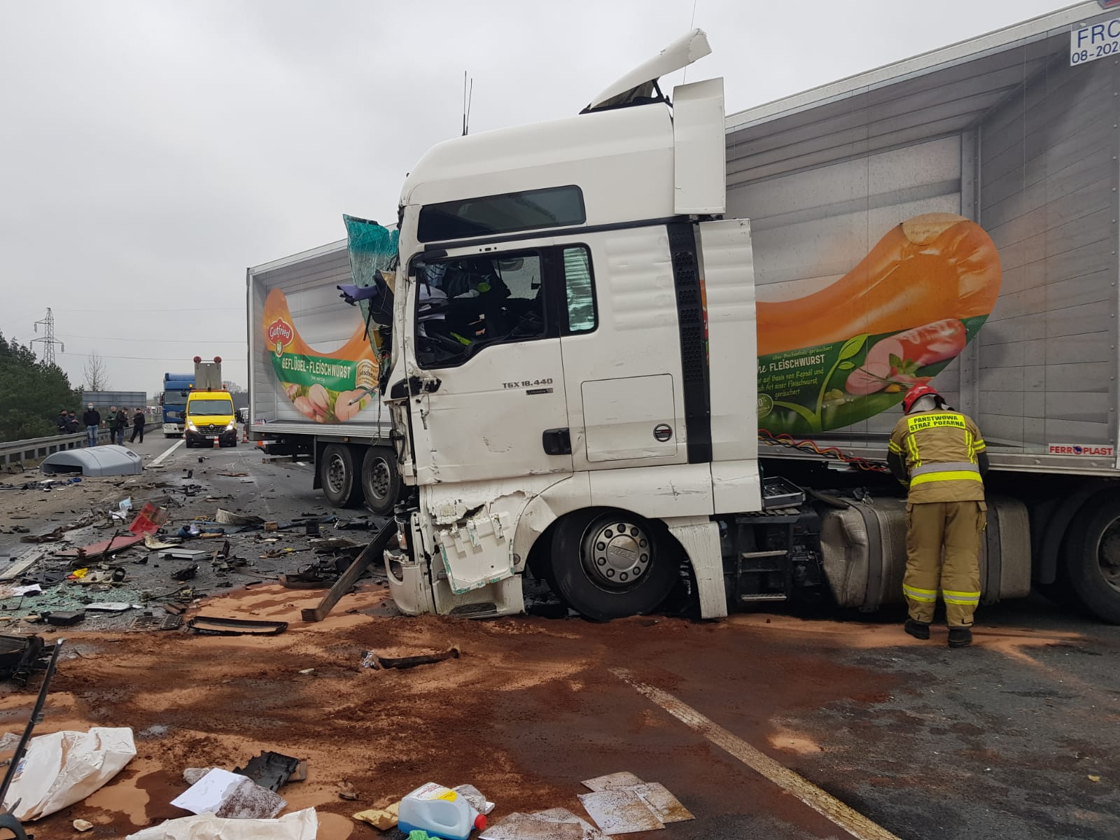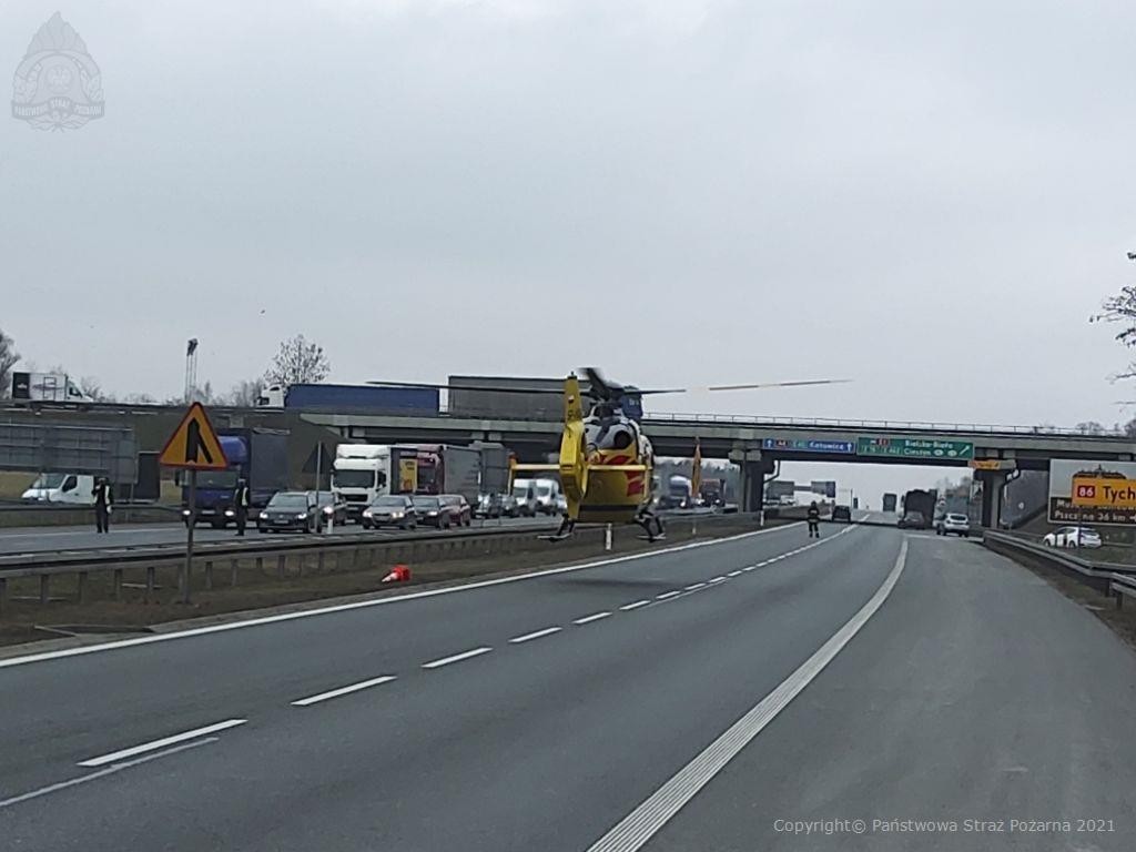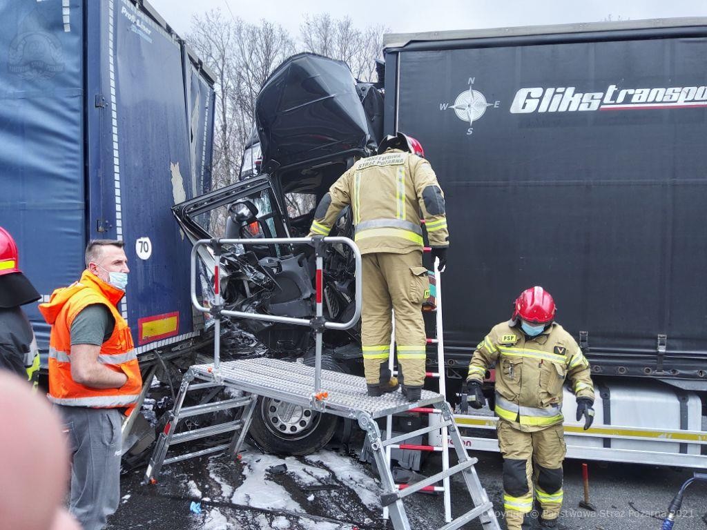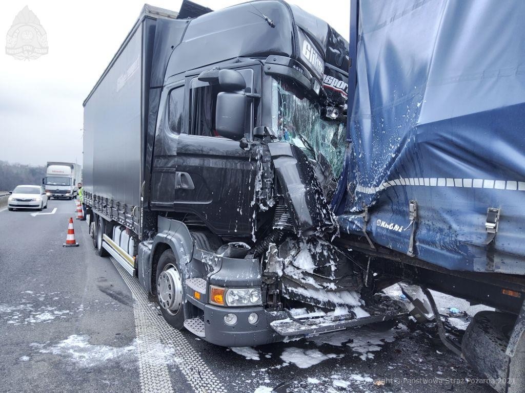 W dniu 01.03.2021 r. na autostradzie A4 za bramkami w kierunku na Katowice o godz. 11.30 doszło do zderzenia 2 samochodów ciężarowych i jednego osobowego. Na skutek zdarzenia kierowca jednego z samochodów ciężarowych został uwięziony w kabinie. Działania zastępów Państwowej Straży Pożarnej polegały na wykonaniu dostępu i uwolnieniu kierowcy oraz przekazaniu go zespołowi Lotniczego Pogotowia Ratunkowego, który odtransportował poszkodowanego do szpitala. Dalsze działania polegały na neutralizacji płynów eksploatacyjnych pojazdów. Na skutek wypadku przez ponad dwie godziny wstrzymany był ruch na autostradzie w kierunku na Katowice. W zdarzeniu uczestniczyły