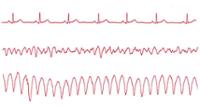 Fot. 1. Od góry: prawidłowy rytm zatokowy, migotanie komór, częstoskurcz komorowy, asystolia (całkowity zanik czynności mechanicznej i elektrycznej serca)