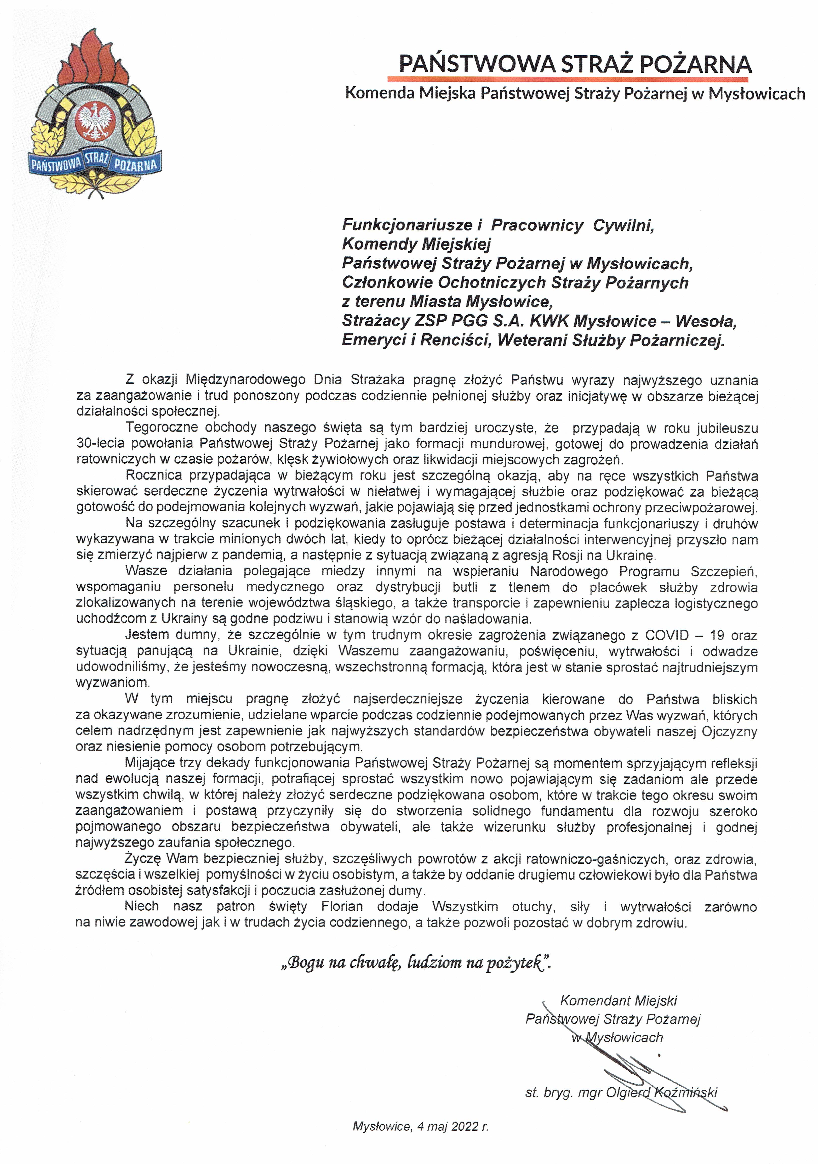 Życzenia Komendanta Miejskiego PSP w Mysłowicach