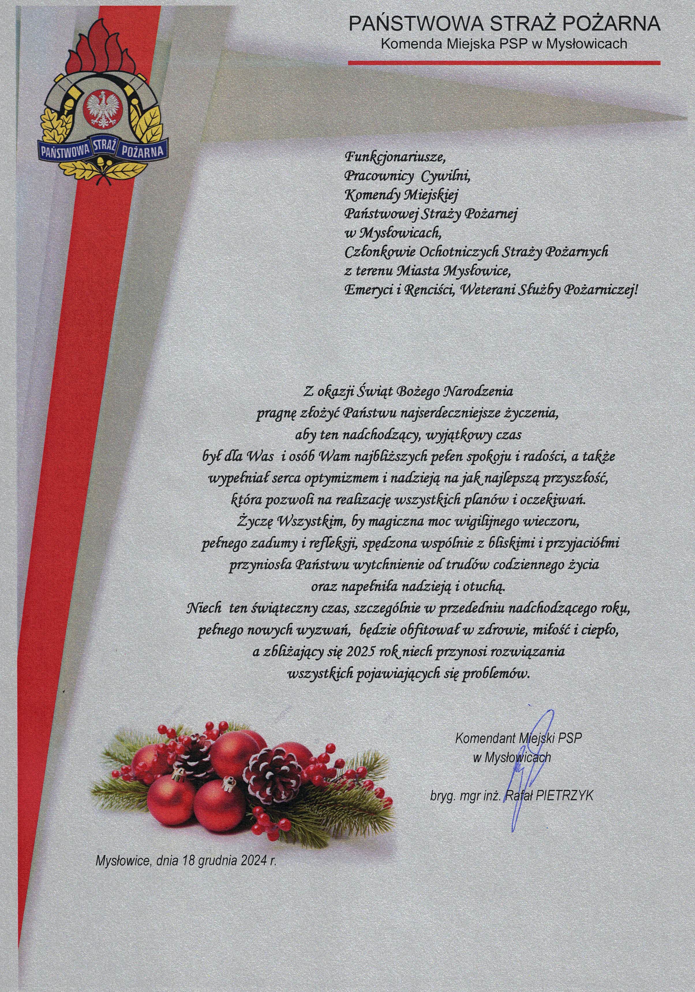 Życzenia świąteczne Komendanta Miejskiego PSP w Mysłowicach