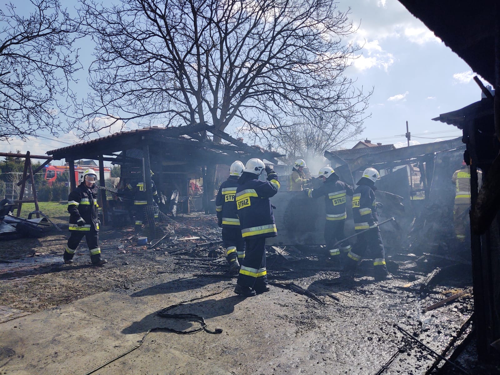 1 kwietnia około godziny 12.15 zastępy z JRG nr 1 w Nowym Sączu, OSP Biała Niżna, OSP Stróże, OSP Grybów oraz OSP Siołkowa zadysponowane zostały do działań w Białej Niżnej. Po przybyciu na miejsce zdarzenia stwierdzono, że pożarem objęte były budynki o konstrukcji drewnianej tj garaż, szopa oraz wiata. Przed przyjazdem strażaków właściciel ewakuował pojazdy. Zagrożony był budynek mieszkalny, który znajdował się w bezpośrednim sąsiedztwie garażu. Ogień całkowicie objął konstrukcję budynków. Działania zastępów straży polegały na zabezpieczeniu miejsca zdarzenia, podaniu prądów wody na palące się budynki. Zbudowano zasilanie w wodę oparte na hydrancie oraz na dowożeniu wody z drugiego oddalonego o kilkaset metrów hydrantu. Po ugaszeniu pożaru rozpoczęto rozbiórkę spalonych budynków przy użyciu sprzętu burzącego i pilarek. Wyniesiono na zewnątrz część wyposażenia z garażu. Przelewano usunięte elementy. Chłodzono i dogaszano konstrukcję garażu. Kontrolowano pogorzelisko przy użyciu kamery termowizyjnej. Kierowano ruchem na drodze wojewódzkiej z uwagi na ustawienie pojazdów pożarniczych. Po dogaszeniu budynków na miejscu pozostał zastęp OSP Biała Niżna w celu dozorowania pogorzeliska. Zastęp po godzinie przelał konstrukcję prądem wody, a następnie skontrolował pogorzelisko przy użyciu kamery termowizyjnej. Nie wykryto nieprawidłowości. Działania strażaków trwały trzy i pół godziny.