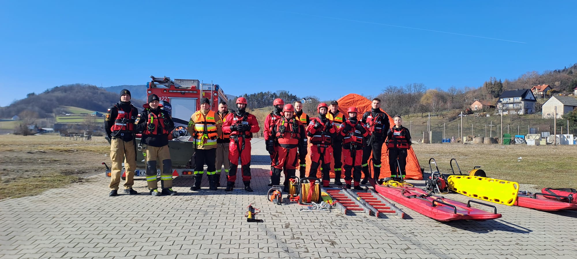 28 lutego 2026 r. na terenie powiatu nowosądeckiego przeprowadzono zajęcia praktyczne z zakresu „ratownictwa na akwenach zalodzonych” dla jednostek OSP posiadających sanie lodowe.