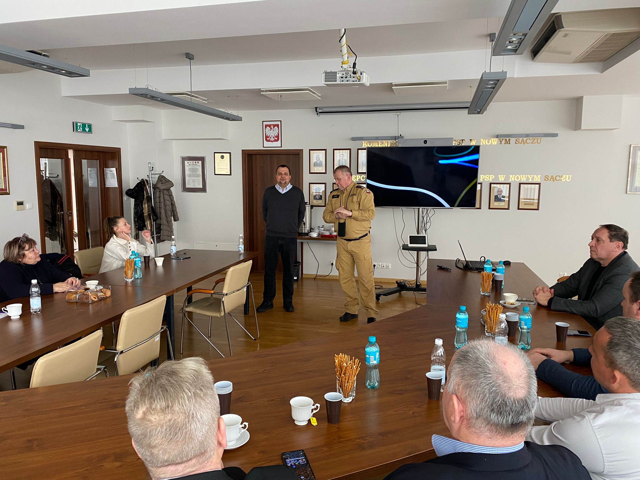Burmistrzowie i Wójtowie z Mołdawii przebywający na Sądecczyźnie w piątek 7 lutego odwiedzili Komendę Miejską PSP w Nowym Sączu. Goście z Mołdawii zaineresowani byli działaniem Komendy Miejskiej PSP w Nowym Sączu w zakresie współpracy z Ochotniczymi Strażami Pożarnymi oraz funkcjonowaniem Ochotniczych Straży Pożarnych na Sądecczyźnie.