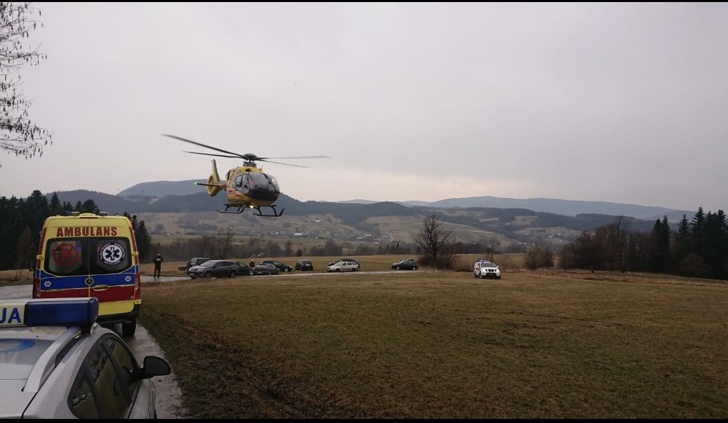 29 marca o godzinie 15.38 zastępy z JRG nr 1 w Nowym Sączu, OSP Gródek, OSP Stróże oraz OSP Grybów Biała zadysponowane zostały do działań w Gródku. Po przybyciu na miejsce zdarzenia z uzyskanych informacji od członka rodziny będącego na miejscu zdarzenia wynikało, że doszło do poślizgu ciągnika rolniczego z przyczepą na drodze gruntowej o znacznym nachyleniu. W wyniku tego kierowca podczas próby wyskoczenia z ciągnika poślizgnął się na elemencie konstrukcyjnym ciągnika. Kierowca wypadając z ciągnika został poszkodowany. Poszkodowany był przytomny i znajdował się około 50 metrów od pojazdu w pozycji leżącej pod opieką ratowników medycznych Pogotowia ratunkowego. Działania strażaków polegały na zabezpieczeniu miejsca zdarzenia oraz udzieleniu pomocy w transporcie osoby poszkodowanej do karetki. Transport poszkodowanego musiał odbyć się pieszo na noszach typu deska ze względu na to, że zdarzenie miało miejsce około 500 metrów od drogi gminnej betonowej. Stan drogi gruntowej oraz jej nachylenie nie pozwalało na dotarciu na miejsce zdarzenia pojazdami. Odłączono akumulator w ciągniku. W miejscu bezpiecznym ratownicy medyczni przygotowali poszkodowanego do transportu LPR. Strażacy wyznaczyli lądowisko i przyjęli śmigłowiec LRP. Karetka Pogotowia Ratunkowego przetransportowała poszkodowanego na miejsce lądowania LPR. LPR zabrał poszkodowanego do szpitala. Ciągnik rolniczy przekazano osobie mieszkającej w sąsiedztwie osoby poszkodowanej.Na miejscu zdarzenia została Policja prowadząca czynności dochodzeniowe. Działania strażaków trwały dwie godziny.