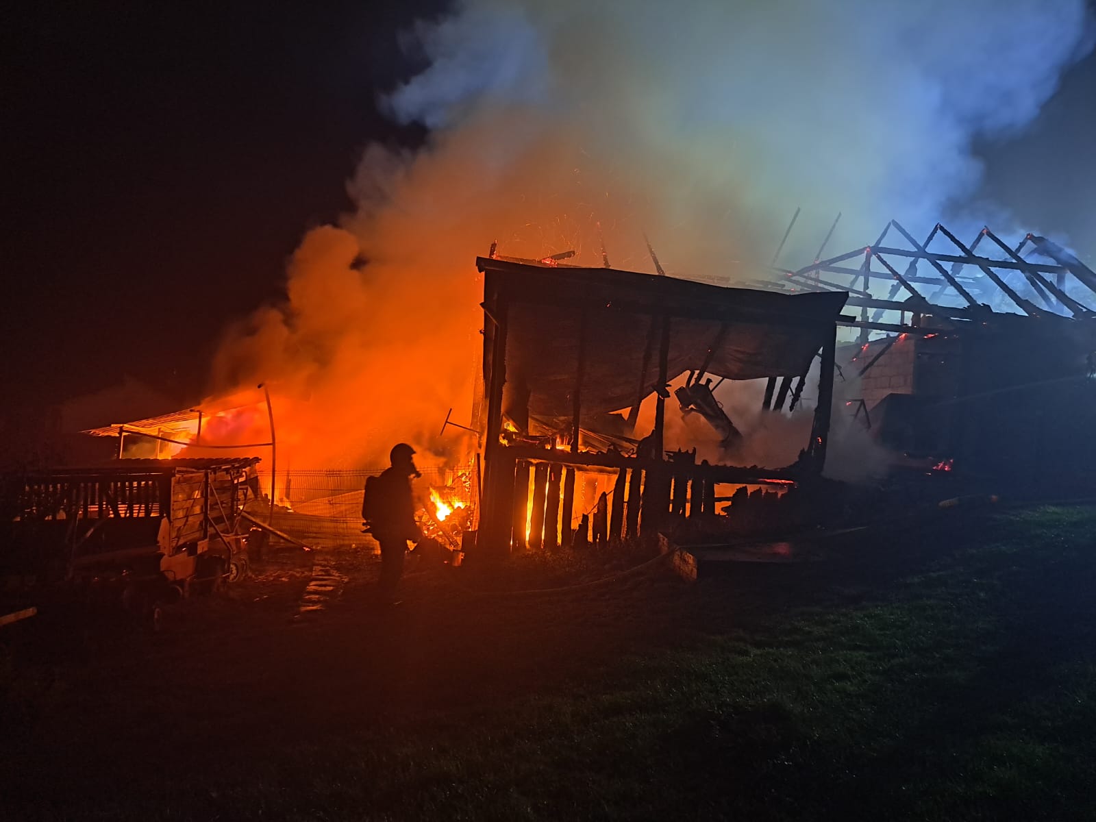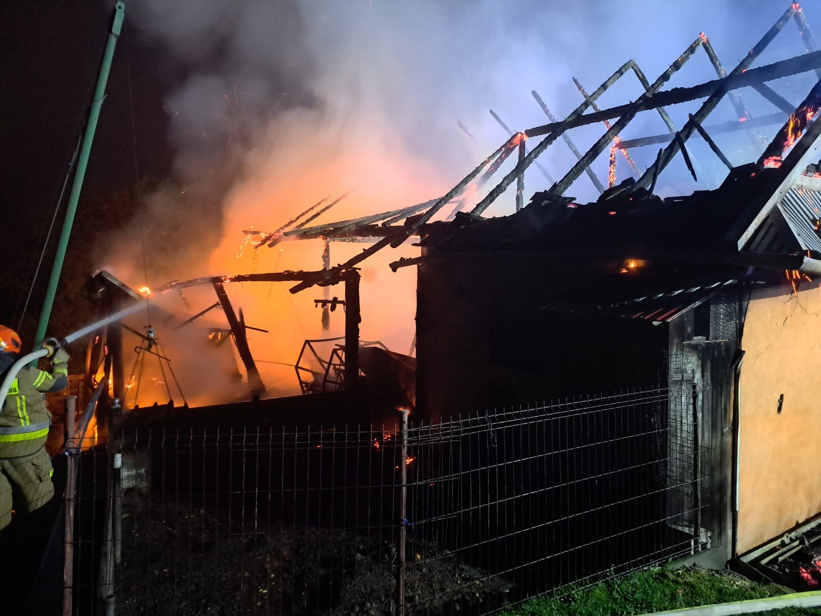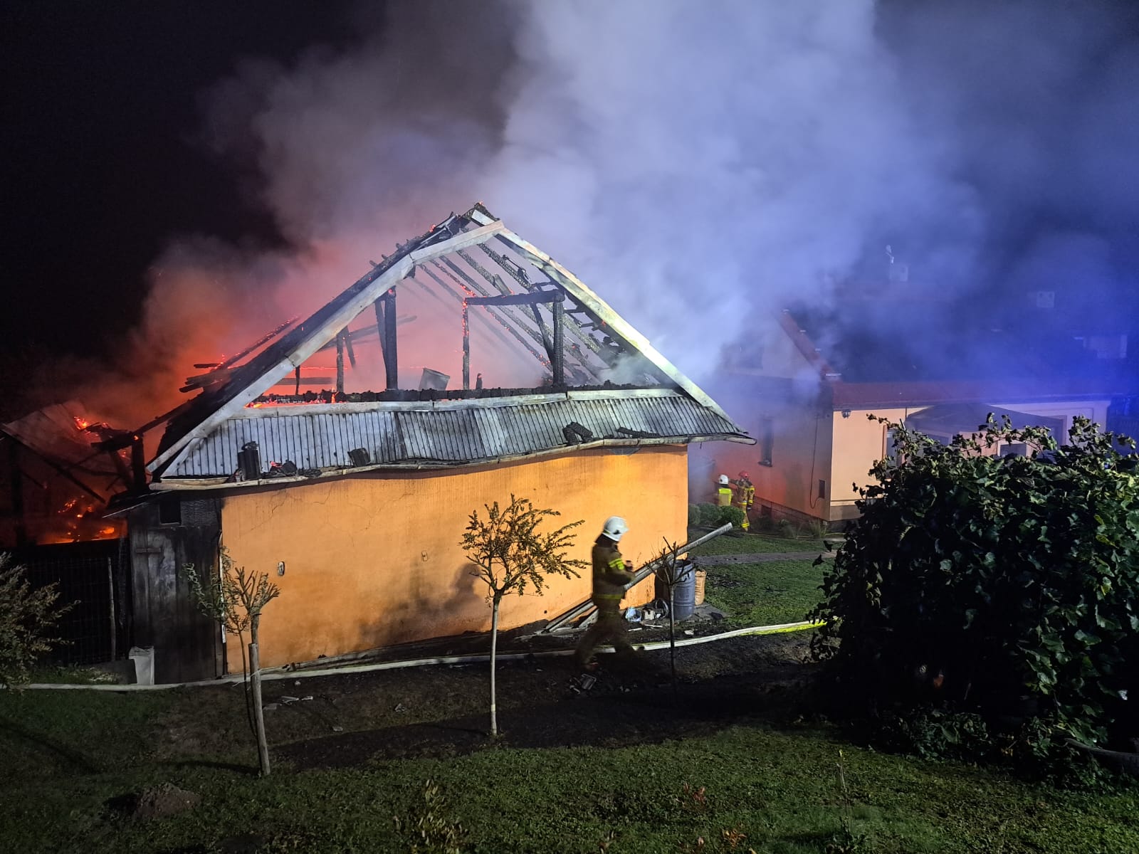 6 października o godzinie 0.50 zastępy z JRG nr 1 w Nowym Sączu, OSP Grybów Biała, OSP Biała Niżna, OSP Ptaszkowa oraz OSP Kąclowa zadysponowane zostały do działań na osiedlu Biała Wyżna w Grybowie. Po przybyciu na miejsce zdarzenia ustalono, że w pełni rozwinięty był pożar budynku inwentarsko-gospodarczego. W odległości kilka metrów znajdował się murowany budynek mieszkalny a w odległości kilkunastu metrów znajdował się kolejny drewniany budynek gospodarczy. Działania strażaków polegały na zabezpieczeniu miejsca zdarzenia, rozłączeniu napięcia elektrycznego w skrzynce bezpiecznikowej w budynku mieszklanym, wyłączeniu falownika instalacji PV oraz podano prądy wody w natarciu na palący się obiekt i w obronie na budynki zagrożone. Dalsze działania polegały na zorganizowaniu dostarczania wody poprzez dowożenie z rzeki Biała. Nadpalone elementy konstrukcyjne dachu usunięto przy pomocy pilarki spalinowej i podręcznego sprzętu burzącego. Wykonano niezbędne prace rozbiórkowe. Kontrolowano budynki przy pomocy kamery termowizyjnej. Działania ratowniczo-gaśnicze 10 zastępów i 43 strażaków trwały pięć godzin.