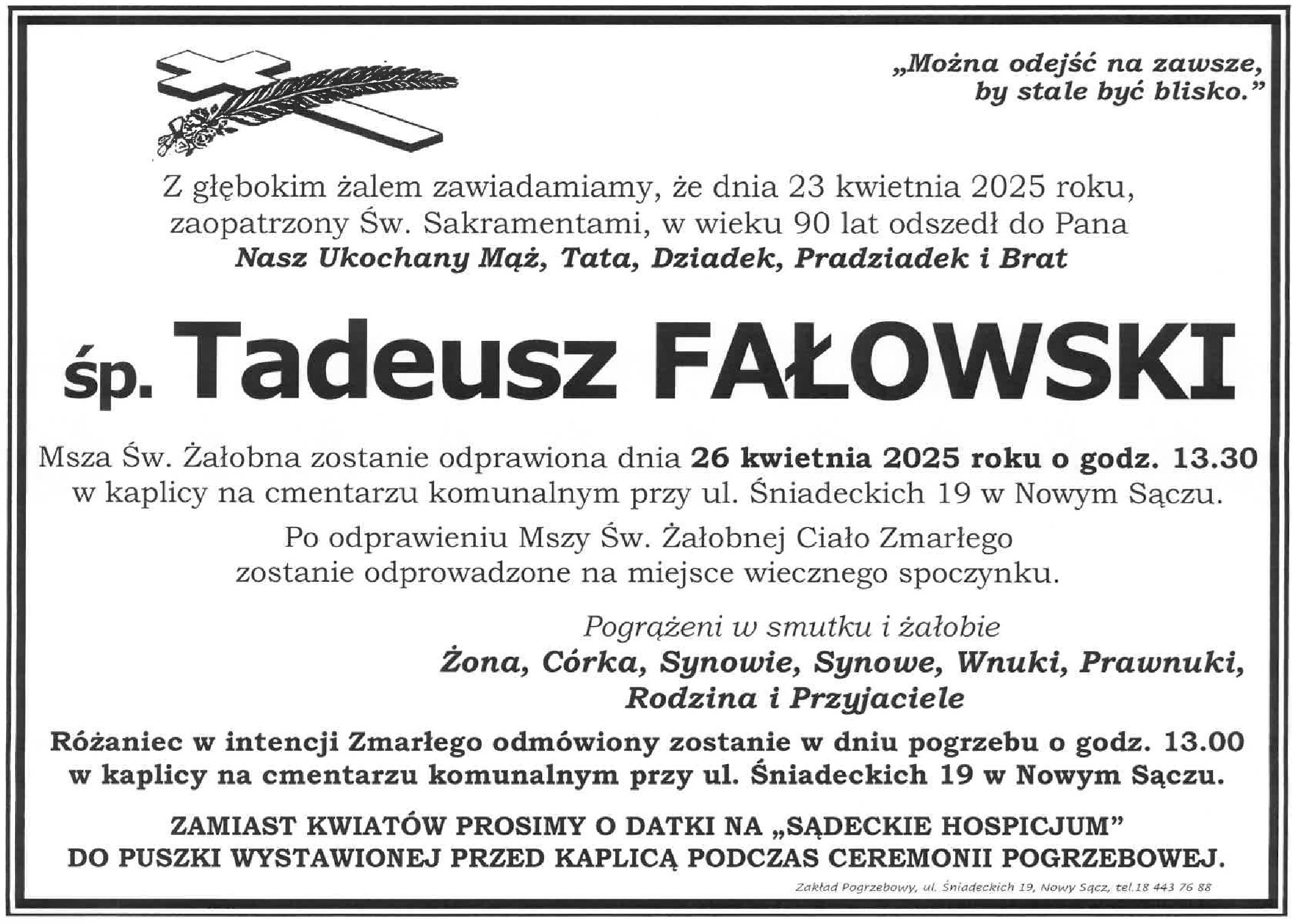 Z głębokim smutkiem przyjęliśmy informację, że w dniu 23 kwietnia 2025 r. zmarł asp. w st. spocz. Tadeusz Fałowski, były funkcjonariusz Komendy Rejonowej Państwowej Straży Pożarnej w Nowym Sączu.
