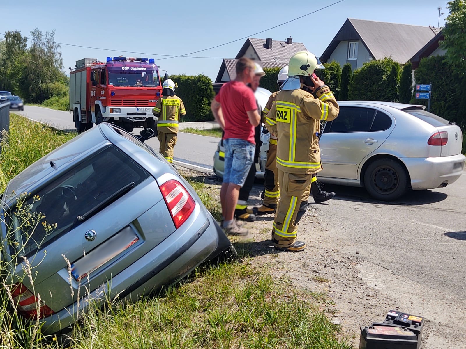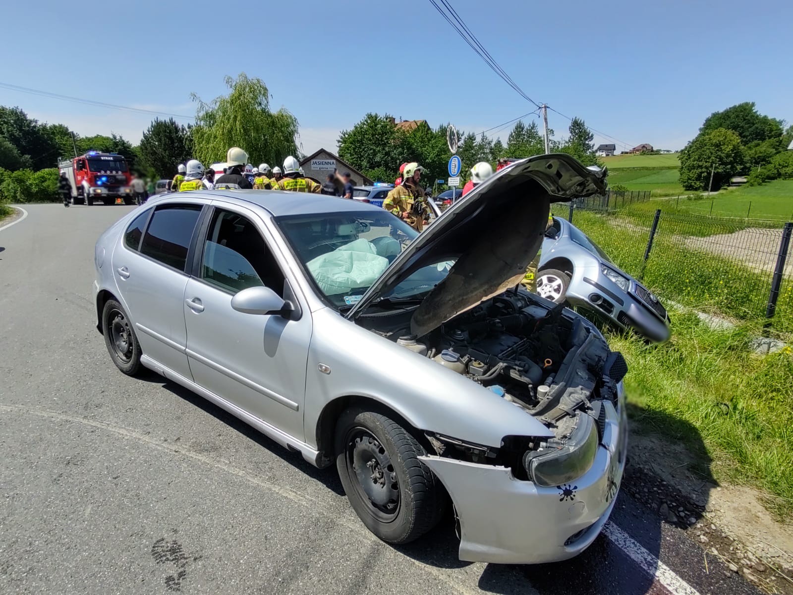 20 czerwca o godzinie 13.36 zastępy z JRG nr 1 w Nowym Sączu, OSP Jasienna oraz OSP Przydonica zadysponowane zostały do działań w Jasiennej. Po przybyciu na miejsce zdarzenia ustalono że doszło do zderzenia dwóch samochodów osobowych marki Seat Leon oraz Skoda Fabia. Samochodami podróżowało łącznie trzy osoby, które opuściły pojazdy. Wszystkie one uskarżały się na dolegliwości. Na miejscu zdarzenia była karetka Pogotowia ratunkowego, której ratownicy udzielali pomocy wszystkim trzem osobom poszkodowanym. Skoda znajdowała się w rowie uszkadzając ogrodzenie posesji. Seat znajdował się na drodze blokując ruch. Działania zastępów straży polegały na zabezpieczeniu miejsca zdarzenia oraz odłączeniu akumulatorów w pojazdach. Wszyscy uczestnicy zdarzenia zostali przewiezieni przez karetki Pogotowia Ratunkowego do szpitala. Na czas prowadzenia czynności dochodzeniowych na miejscu zdarzenia pozostały zastępy OSP. Po zakończonych czynnościach dochodzeniowych przez Policję pojazdy zostały usunięte z miejsca zdarzenia. Dokonano sorpcji rozlanych płynów eksploatacyjnych. Działania strażaków trwały ponad dwie i pół godziny.