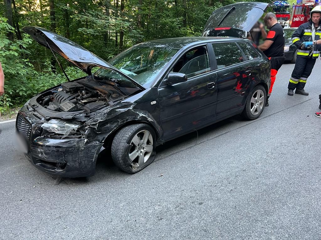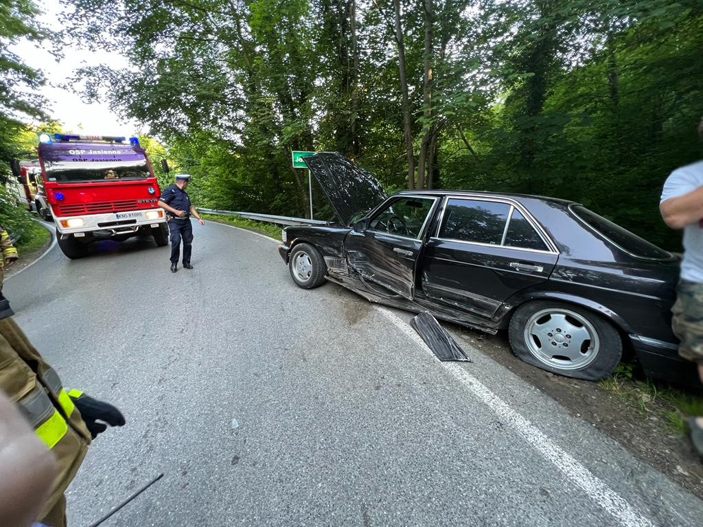 19 czerwca o godzinie 18.30 zastępy z JRG nr 1 w Nowym Sączu, OSP Jasienna oraz OSP Przydonica zadysponowane zostały do działań w Jasiennej. Po przybyciu na miejsce zdarzenia ustalono, że na łuku drogi doszło do zderzenia dwóch samochodów osobowych, którymi podróżowało łącznie siedem osób w tym trójka dzieci. Wszystkie osoby jadące samochodami znajdowały się poza pojazdami. Jedna z nich uskarżała się na dolegliwości. Droga była całkowicie zablokowana. Działania zastępów straży pożarnej polegały na zabezpieczeniu miejsca zdarzenia, rozłączeniu akumulatorów w uszkodzonych pojazdach oraz udzieleniu kwalifikowanej pierwszej pomocy osobie poszkodowanej. Osobę poszkodowaną przekazano przybyłej załodze karetki Pogotowia ratunkowego. Ratownicy medyczni Pogotowia ratunkowego podjęli decyzje o zabraniu rodziców wraz z trójką dzieci na badania do szpitala. Po wykonaniu czynności dochodzeniowych przez policję zepchnięto uszkodzone pojazdy na pobocze, posypano sorbentem rozlane płyny eksploatacyjne oraz usunięto z jezdni pozostałości po wypadku. Działania strażaków trwały trzy godziny