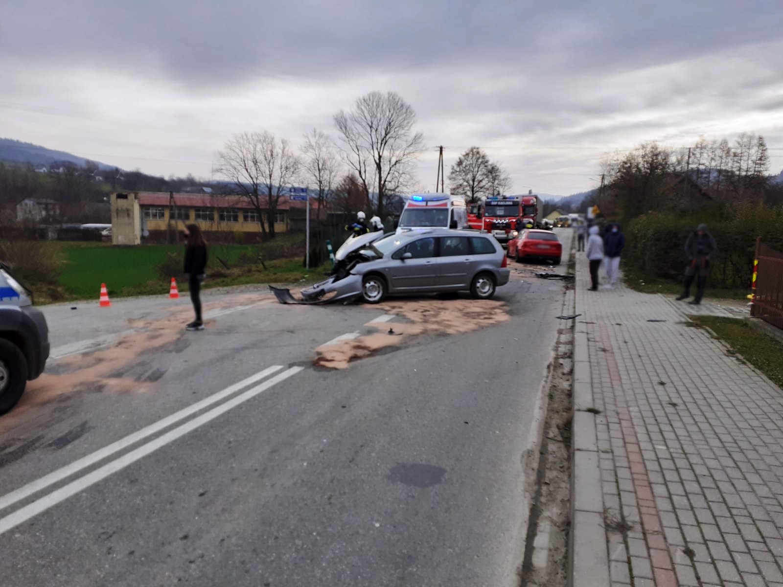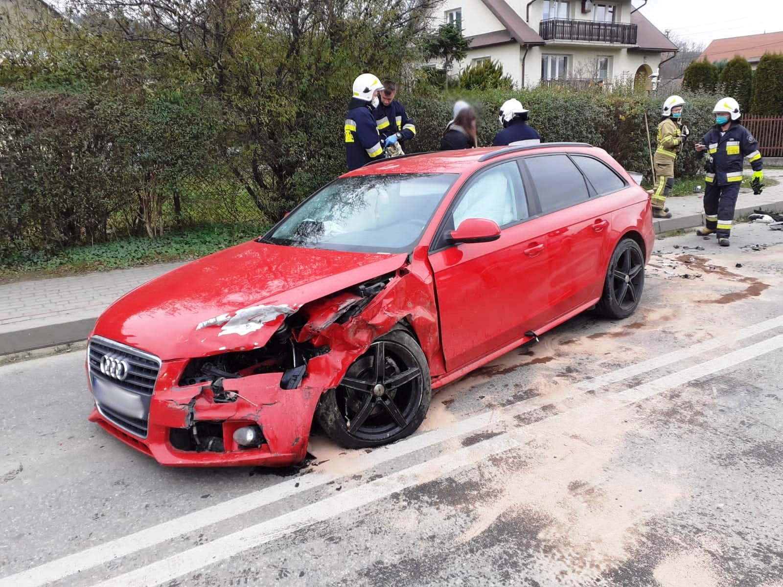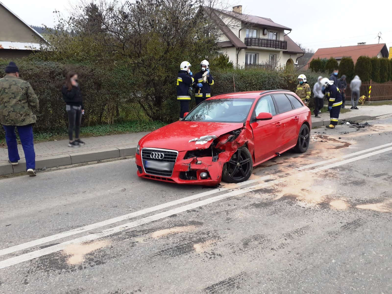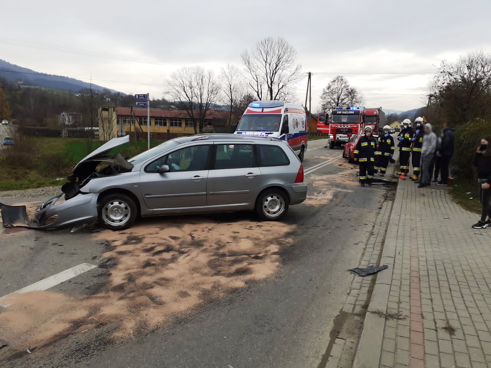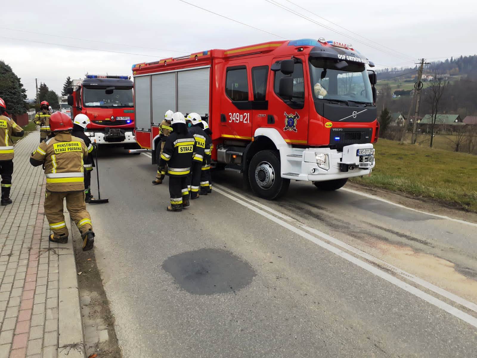 23 listopada około godziny 10.46 zastępy z JRG nr 1 w Nowym Sączu, OSP Kąclowa oraz OSP Grybów Biała zadysponowane zostały do działań w Kąclowej. Po przybyciu na miejsce zdarzenia stwierdzono, że doszło do zderzenia dwóch samochodów osobowych Peugeot i Audi. Samochodem podróżowało łącznie cztery osoby w tym dziecko. Jedna osoba uskarżała się na dolegliwości. Droga była zablokowana w obydwu kierunkach. Z samochodów nastąpiły wycieki płynów eksploatacyjnych. Działania strażaków polegały na zabezpieczeniu terenu działań oraz udzieleniu kwalifikowanej pierwszej pomocy osobie poszkodowanej oraz dziecku. Odłączono klemy akumulatorów w uszkodzonych pojazdach. Częściowo zasypano wyciekłe płyny eksploatacyjne. Osobę poszkodowaną przekazano przybyłej załodze Pogotowia Ratunkowego. Osoba poszkodowana została zabrana do szpitala. Pozostałe osoby zostały na miejscu zdarzenia. Zastępy z JRG nr 1 zostały zadysponowane do innego zdarzenia a na miejscu pozostały zastępy z OSP. Po zakończeniu działań dochodzeniowych Policji samochód Peugeot przepchnięto na pobliskie pobocze. Przybyłe na miejsce lawety Pomocy drogowej zabrały uszkodzone pojazdy z miejsca zdarzenia. Usunięto pozostałości po kolizji na pobocze i doczyszczono drogę przy użyciu mioteł, łopat i sorbentu. Przywrócono ruch pojazdów w obydwu kierunkach. Na miejscu pozostał patrol Policji. Działania strażaków trwały ponad trzy i pół godziny.