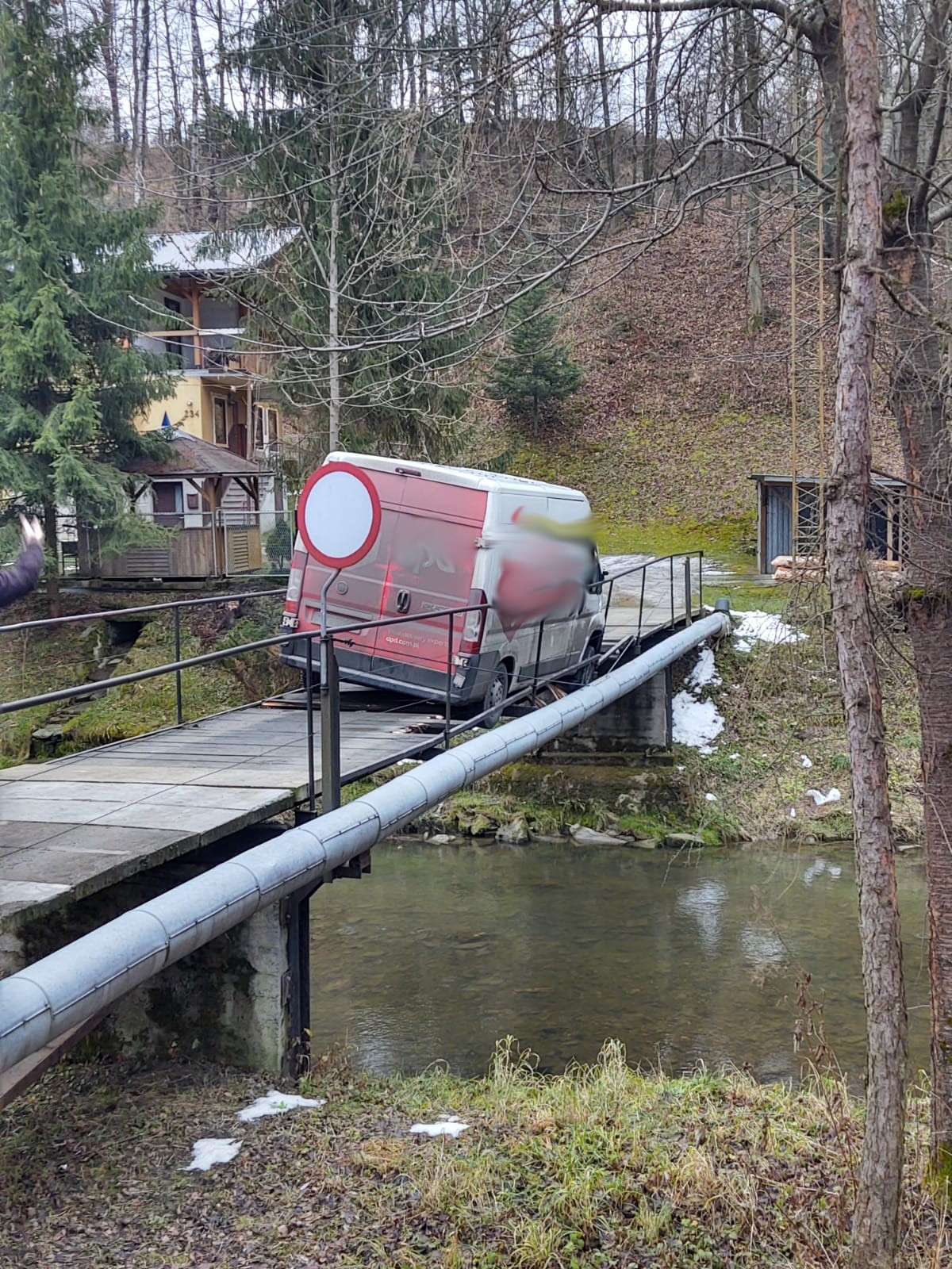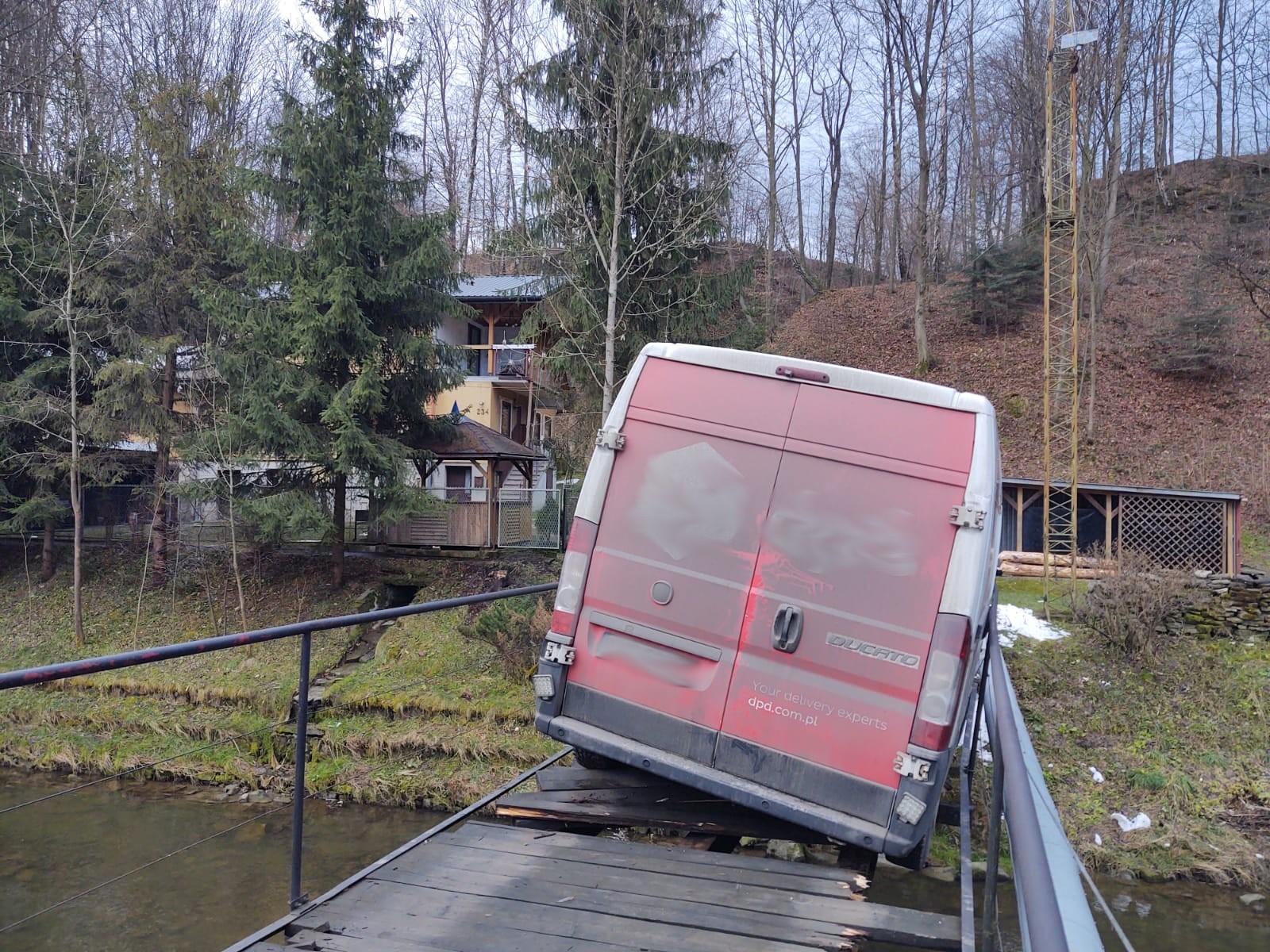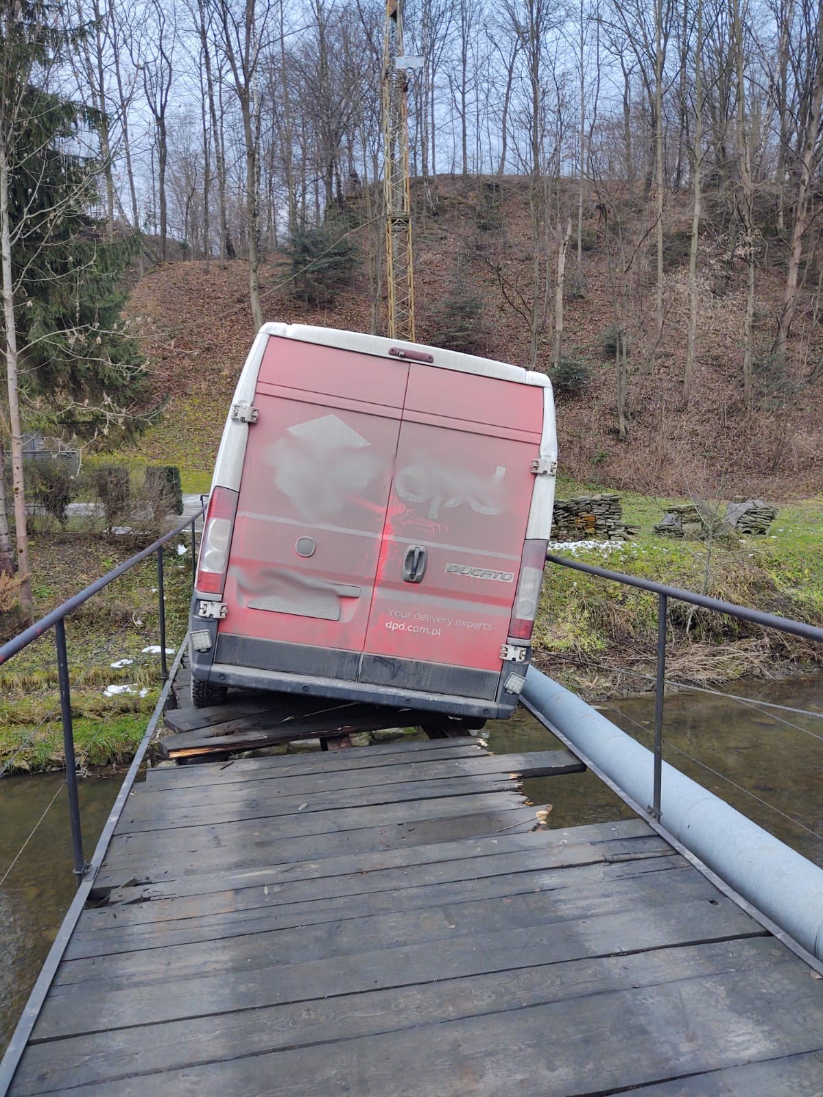 Kamionka Wielka- pod samochodem dostawczym załamały się drewniane belki na moście
