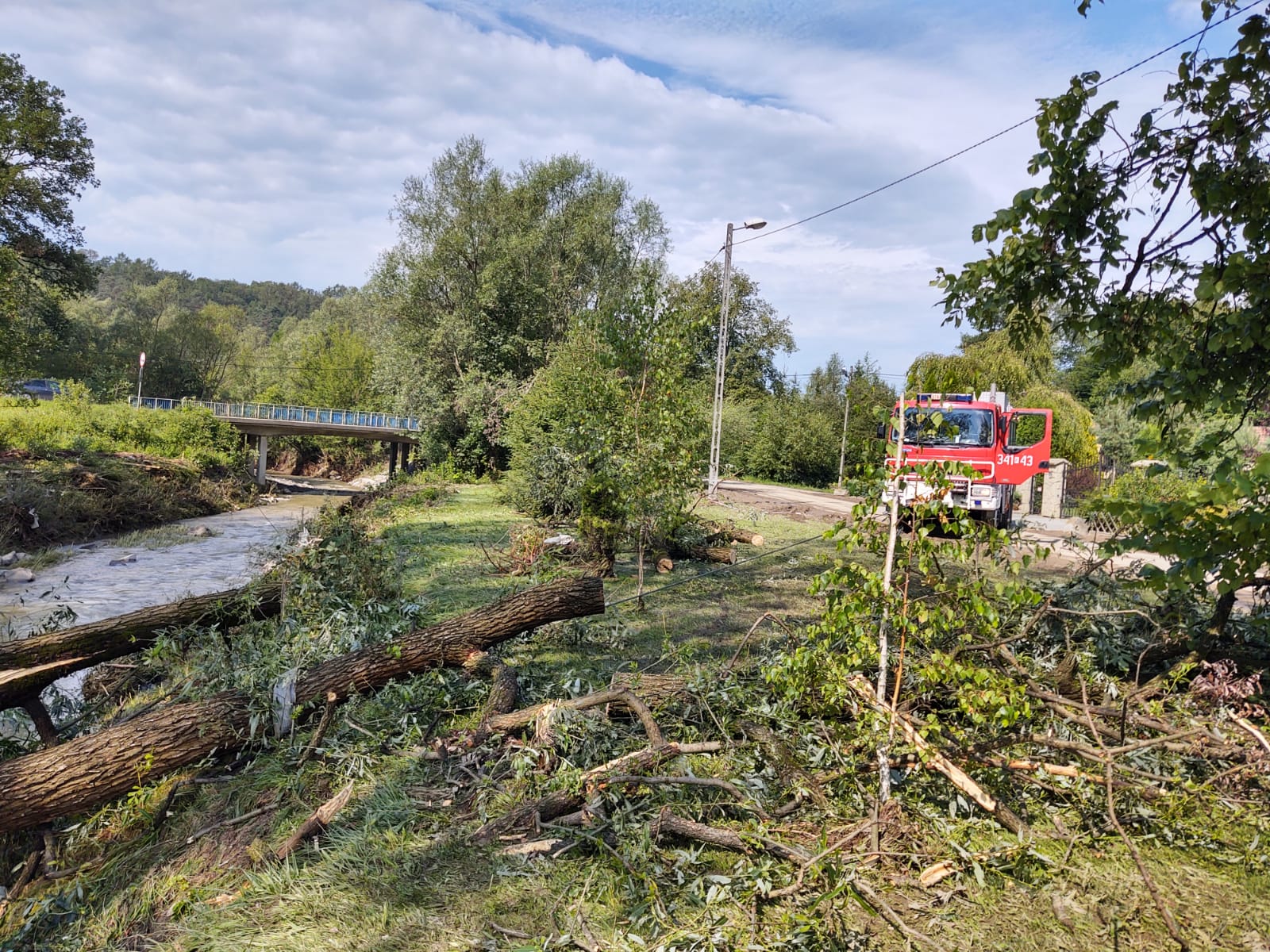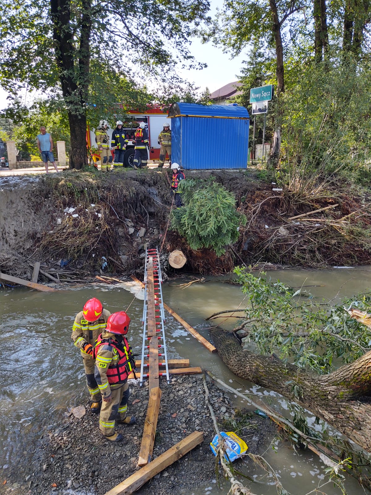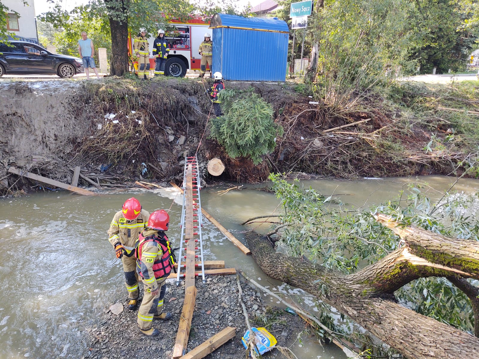 Poniedziałek 12 lipca był kolejnym dniem usuwania skutków gwałtownych opadów deszczu, które wystąpiły w niedzielę 11 lipca. Strażacy prowadzili działania między innymi w Tęgoborzy oraz w Nowym Sączu na ulicy Piątkowskiej gdzie usuwano powalone drzewo z koryta potoku. Powalone drzewo oraz zerwana kładka to zagrożenia rozpoznane poprzedniego dnia ale nie było możliwości ich bezpiecznego usunięcia. Dlatego strażacy przystąpili do ich usunięcia w poniedziałkowe przedpołudnie.