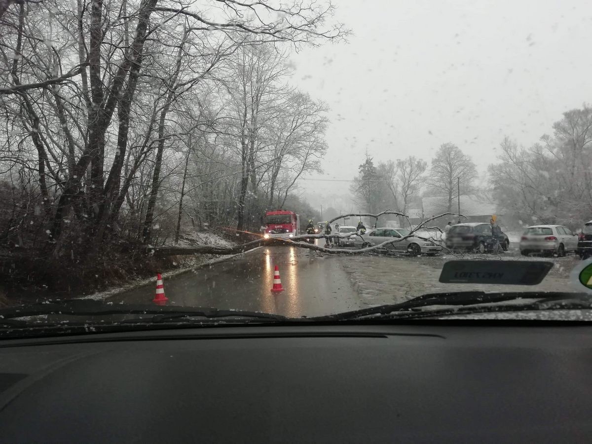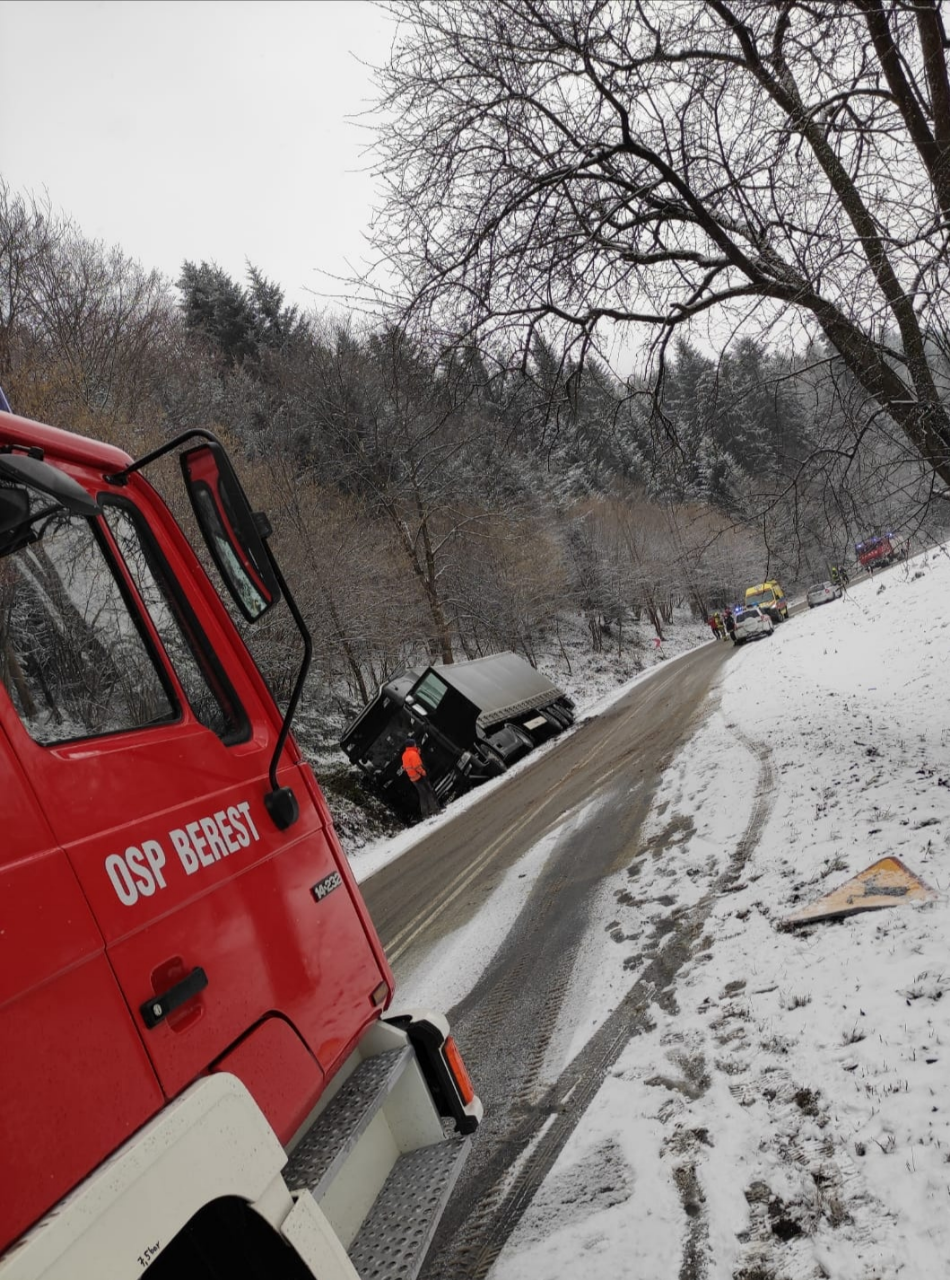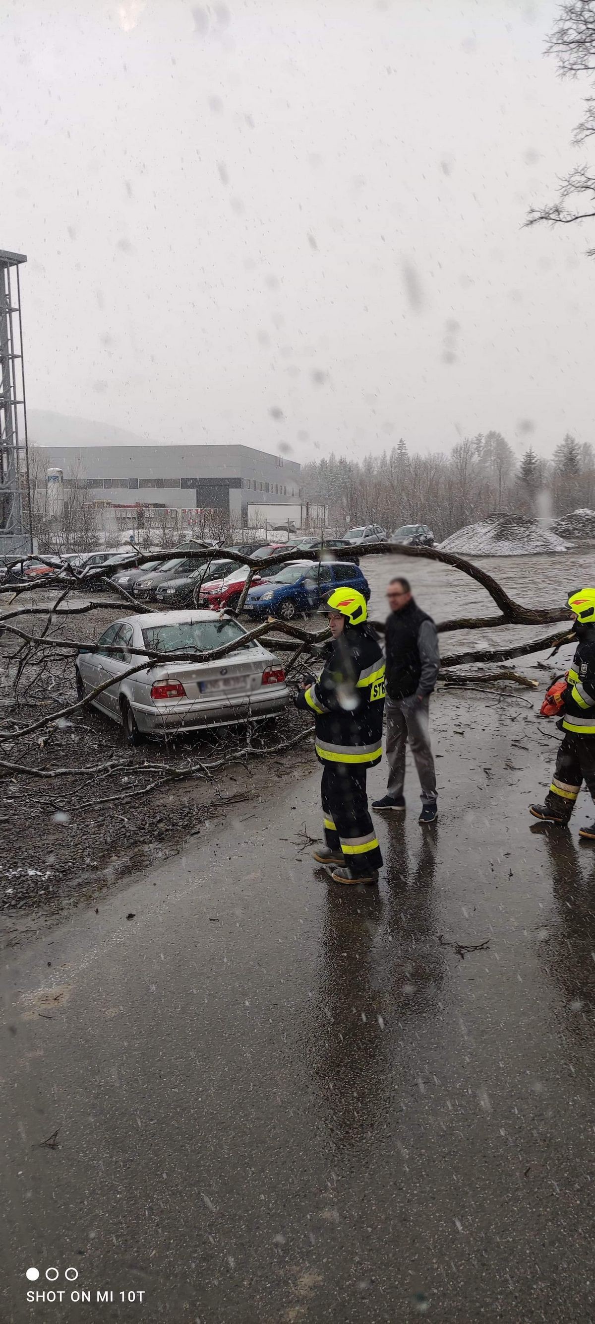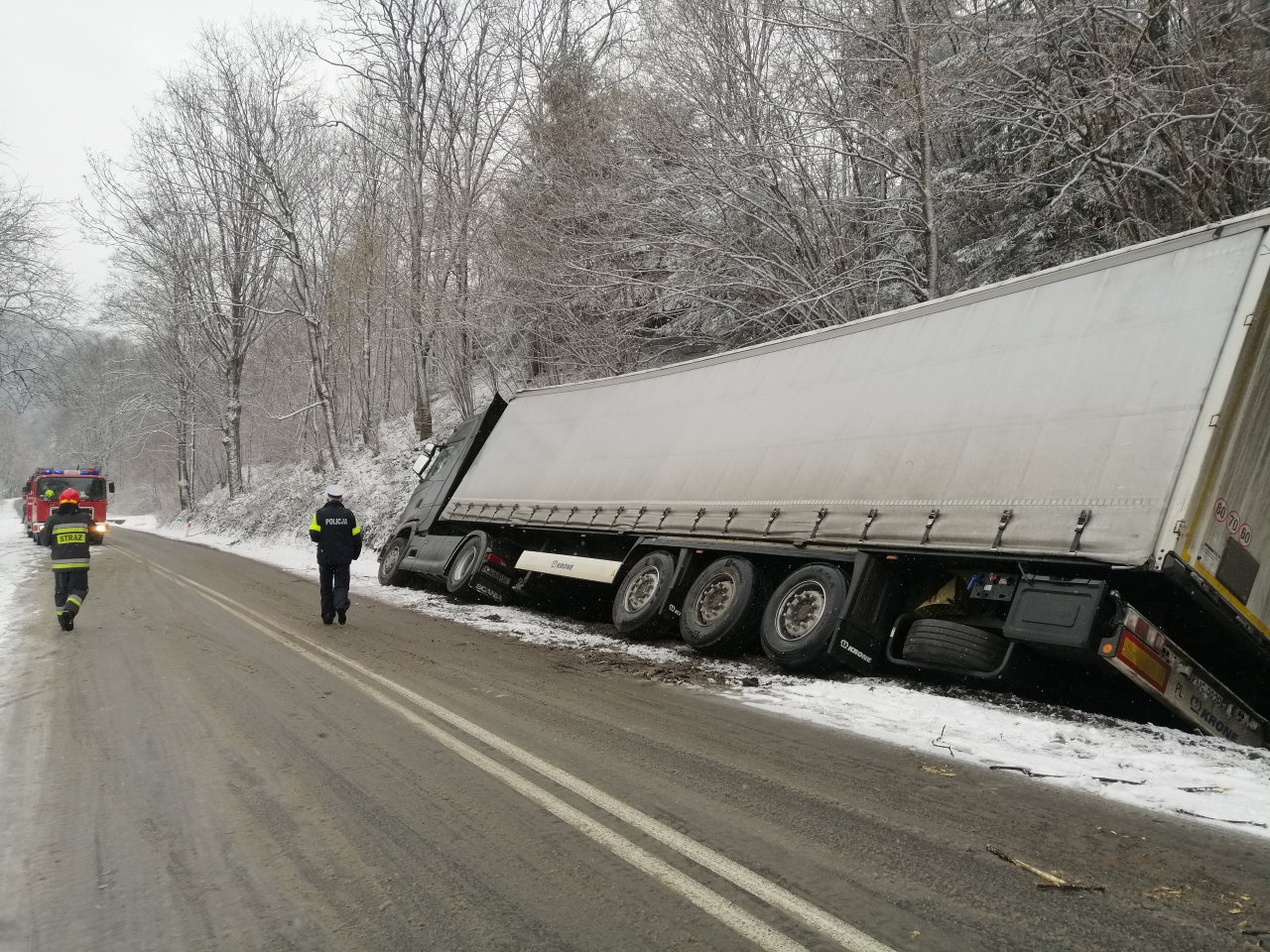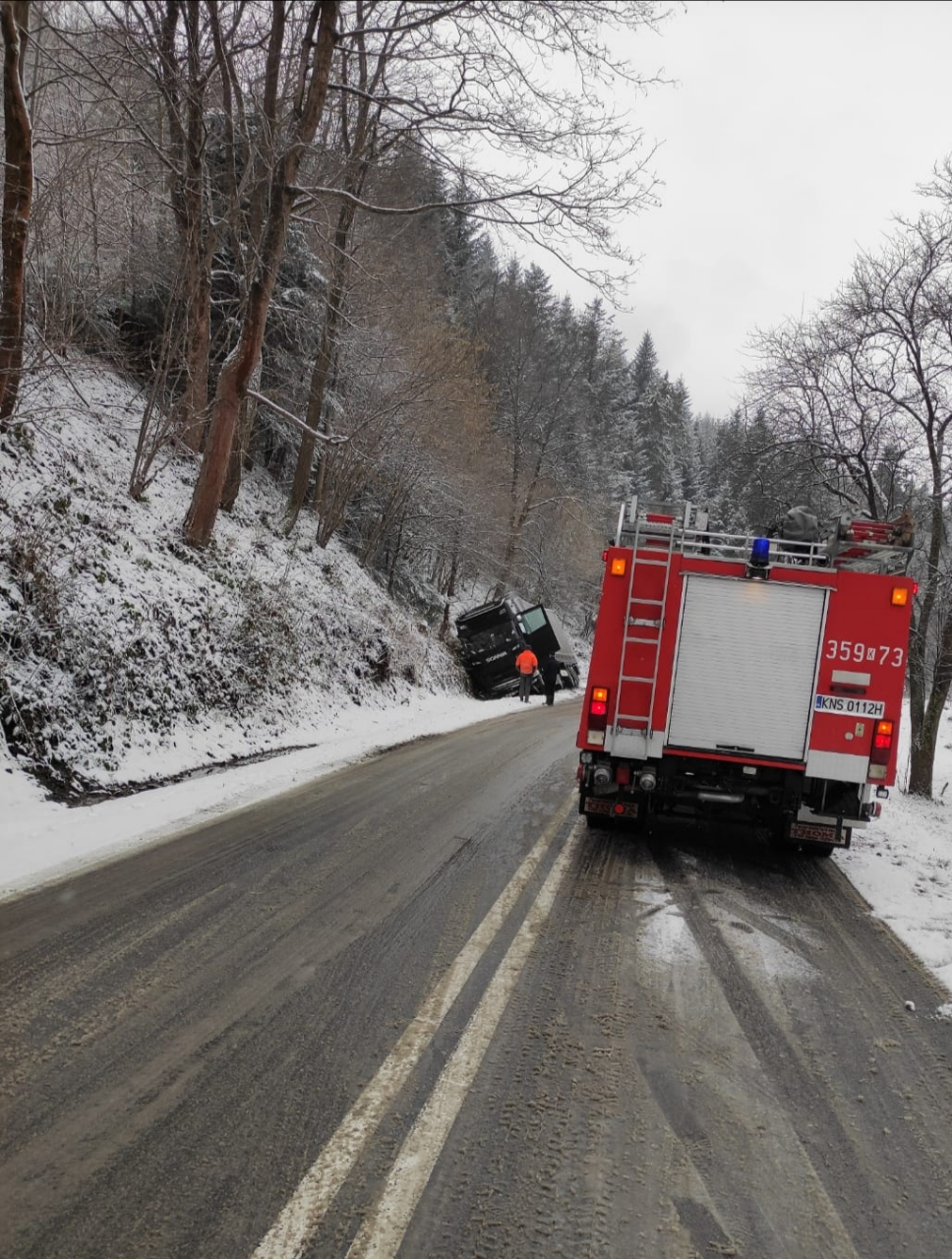 W piątkowy poranek 5 marca zima przypomniała o sobie na Sądecczyźnie. Strażacy podjęli dwa zdarzenia mające związek z powrotem zimy. O godzinie 7.01 zastęp z OSP Korzenna zadysponowany został do działań w Korzennej gdzie w wyniku opadów śniegu doszło do złamania pojedynczej gałęzi z drzewa i powalenia jej na drogę powiatową. Drzewo spadając uszkodziło przednią część karoserii samochodu osobowego oraz zarysowało bok karoserii drugiego pojazdu. Drzewo stwarzało bezpośrednie zagrożenie dla ruchu środków transportu drogowego oraz pieszych. Strażacy zabezpieczyli miejsce zdarzenia i za pomocą mechanicznej piły drzewo oraz gałąź pocięto i złożono na poboczu drogi. Jezdnię oczyszczono z trocin oraz gałęzi. Do kolejnego zdarzenia strażacy z JRG w Krynicy Zdroju, OSP Berest oraz OSP Florynka zadysponowane zostali około godziny 8.22 do Polan. Po przybyciu na miejsce zdarzenia ustalono, że na łuku drogi kierowca samochodu ciężarowego marki Scania wjechał do przydrożnego rowu. Pojazd znajdował się poza jezdnią. Kierowca pojazdu ciężarowego, który podróżował sam, wyszedł z pojazdu o własnych siłach i nie uskarżał się na dolegliwości. Działania zastępów straży pożarnej polegały na zabezpieczeniu miejsca zdarzenia do czasu przybycia Policji.