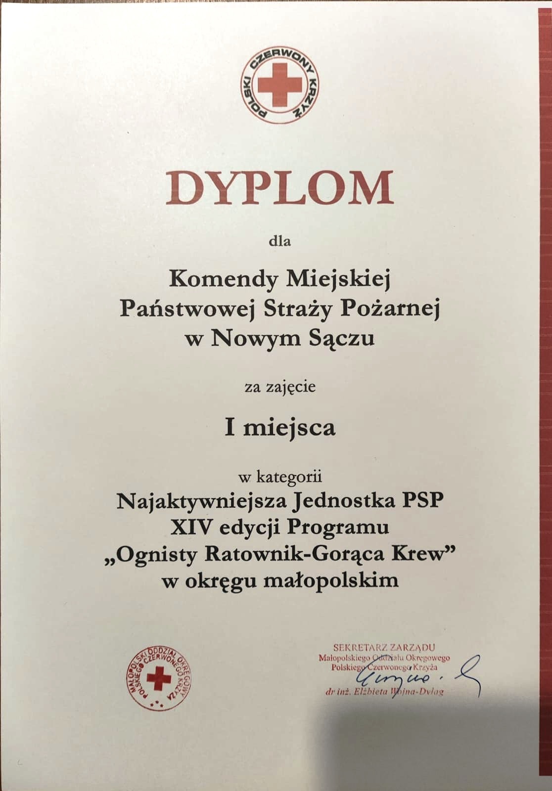 Komenda Miejska Państwowej Straży Pożarnej w Nowym Sączu zajęła I miejsce w kategorii Najaktywniejsza jednostka PSP w XIV edycji konkursu „Ognisty Ratownik - Gorąca Krew” w okręgu małopolskim. Wyróżnienie zostało wręczone podczas Gali Polskiego Czerwonego Krzyża, która odbyła się 9 grudnia w Krakowie.